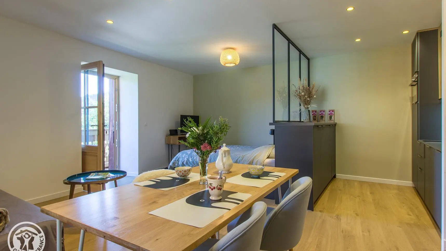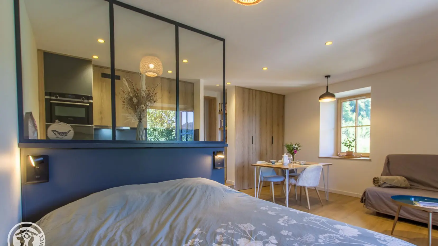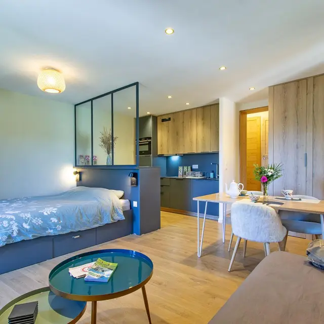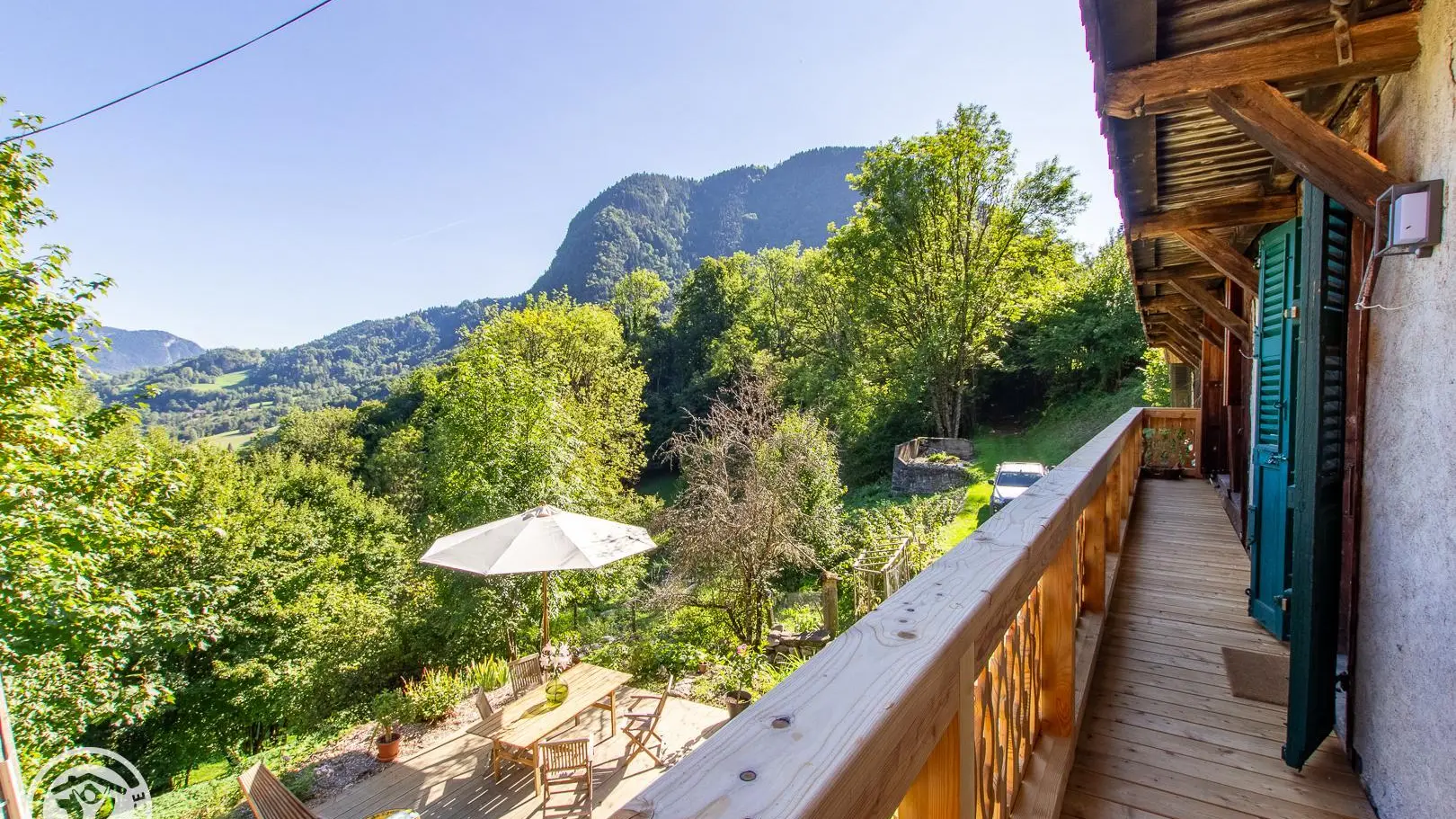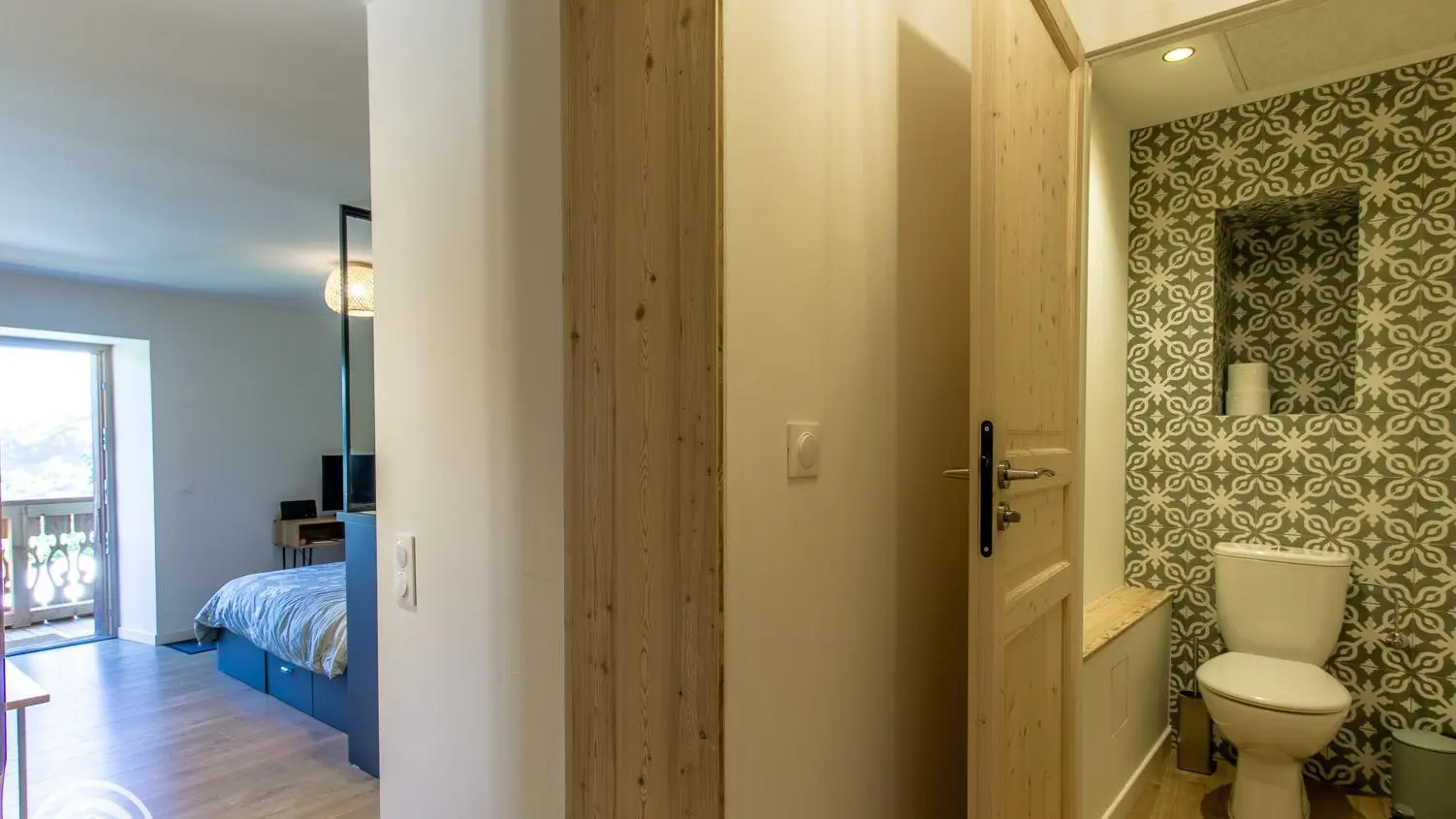 This 33m² studio apartment is located on the first floor of a renovated Savoyard farmhouse, which also houses the owners and another apartment on the garden level.