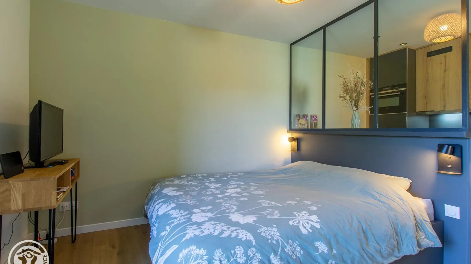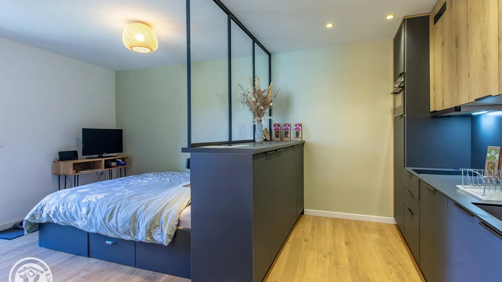 - Living area with an open-plan kitchen: 160x200cm bed, TV, table and chairs, sofa bed, built-in storage.