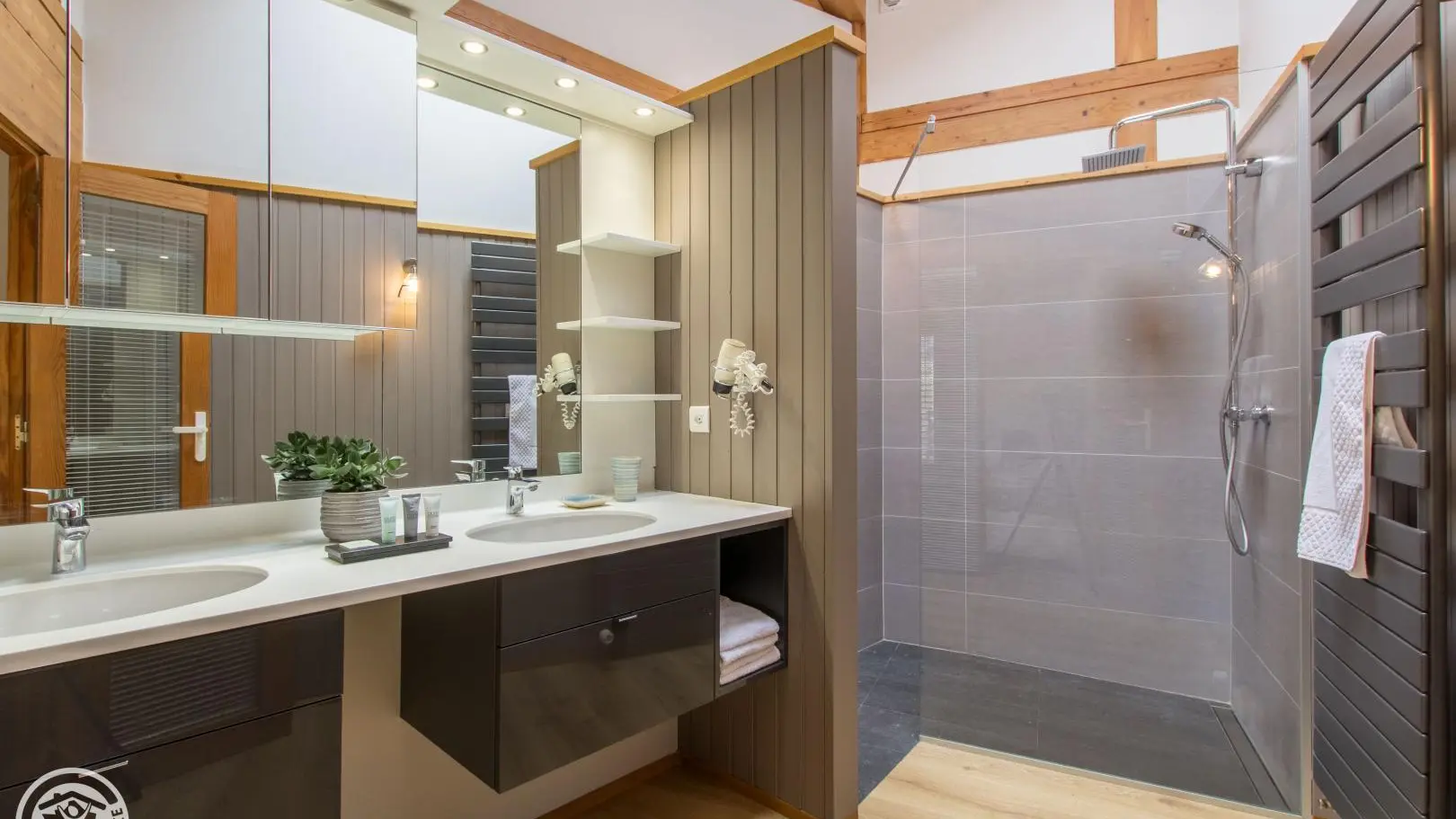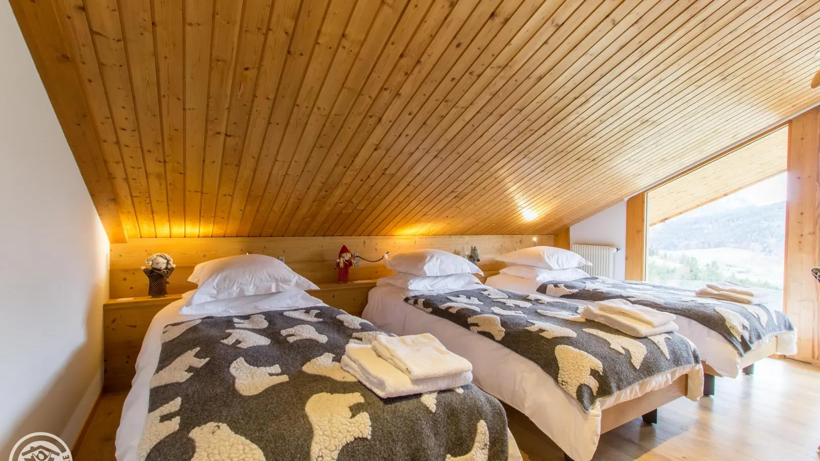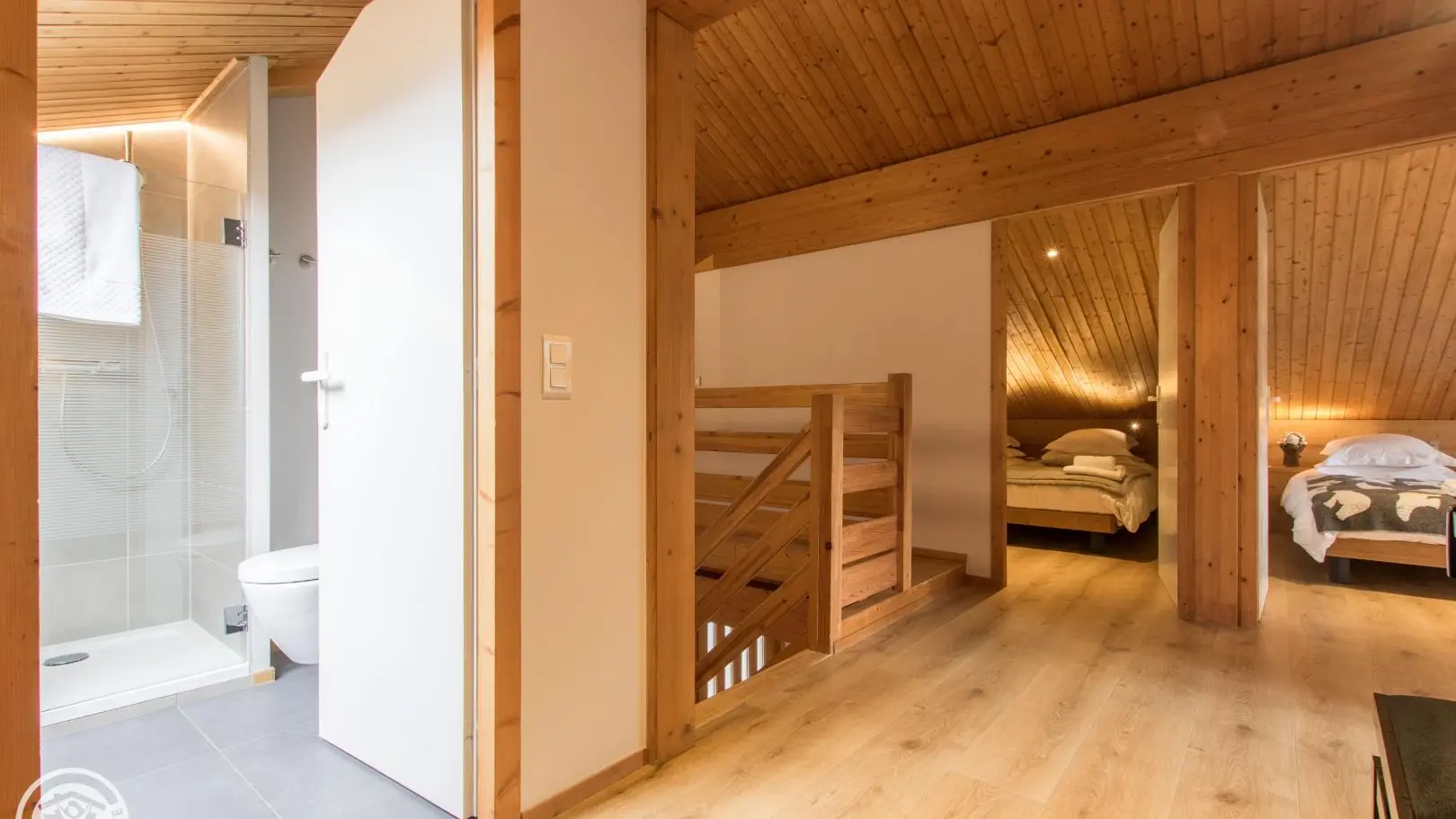 Beautiful detached chalet of 180m² (+ 25m² attic) on 3 levels. 5 bedrooms with modular beds: single beds that can be twinned to create a double bed. 3 shower rooms.
