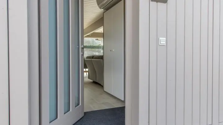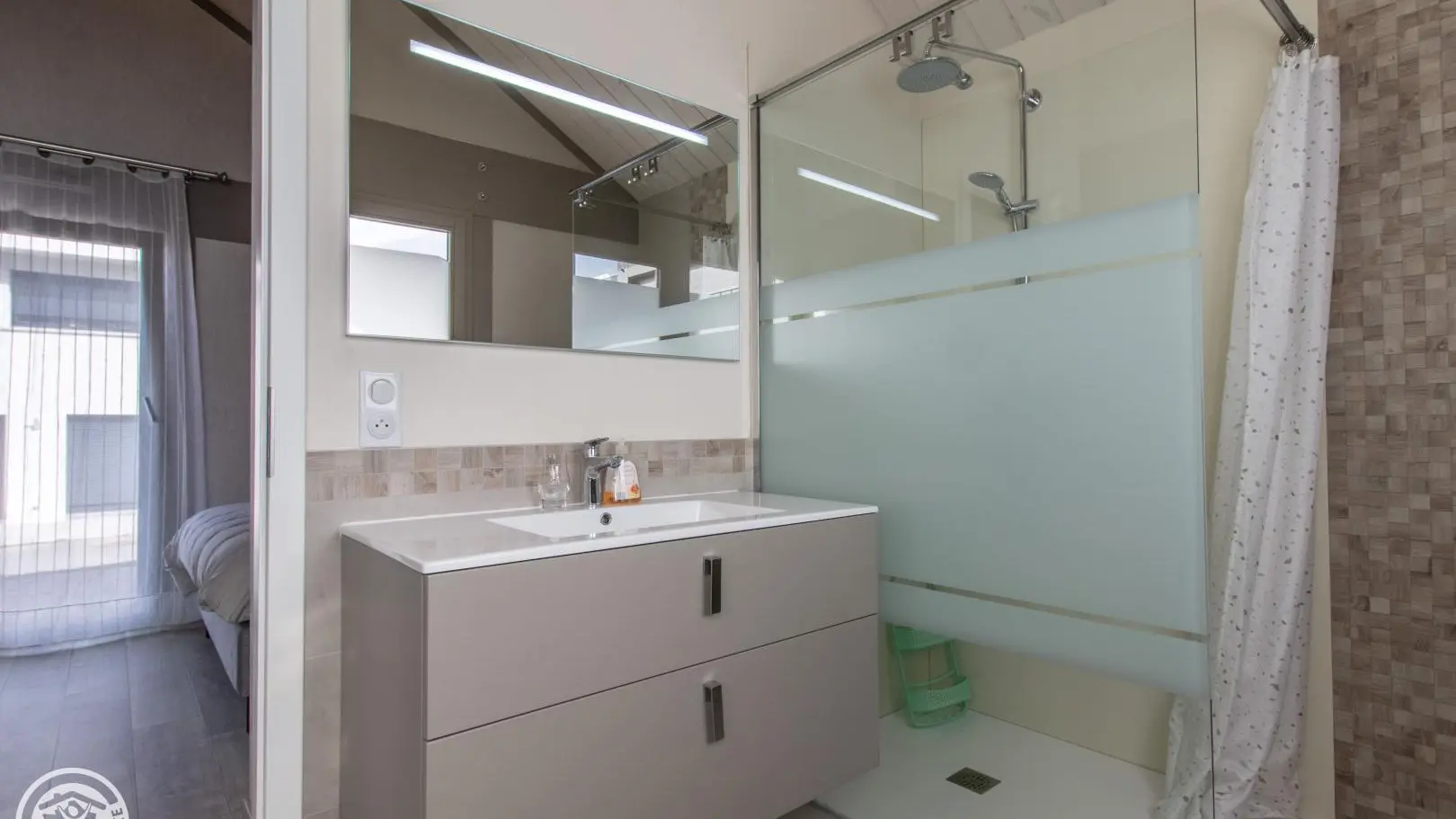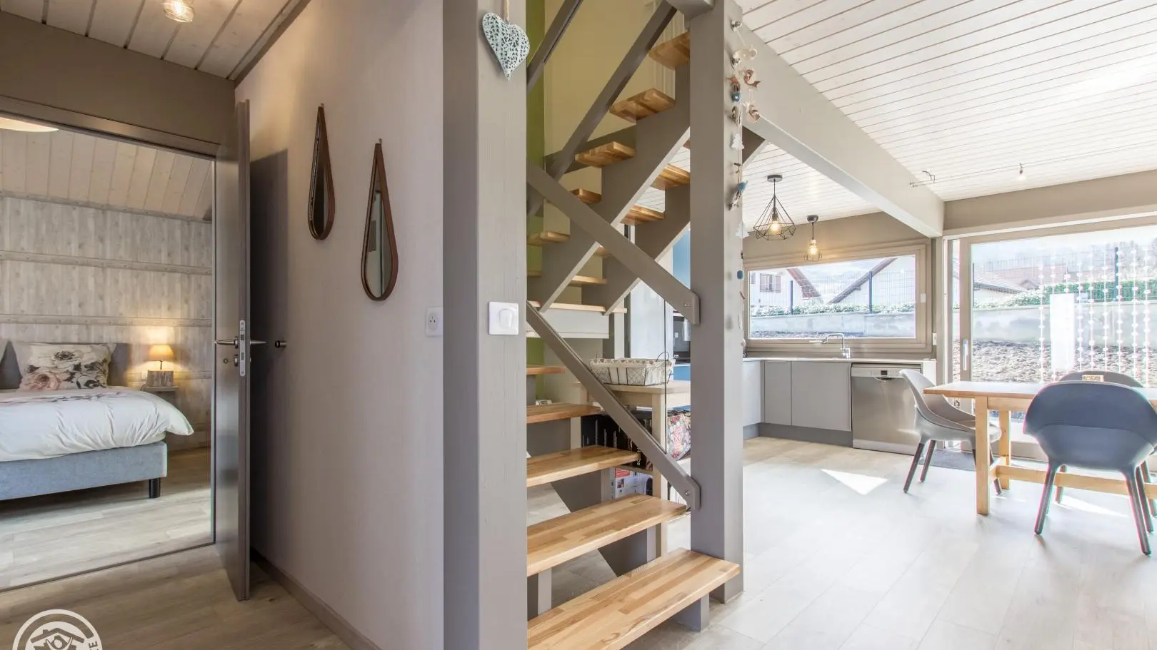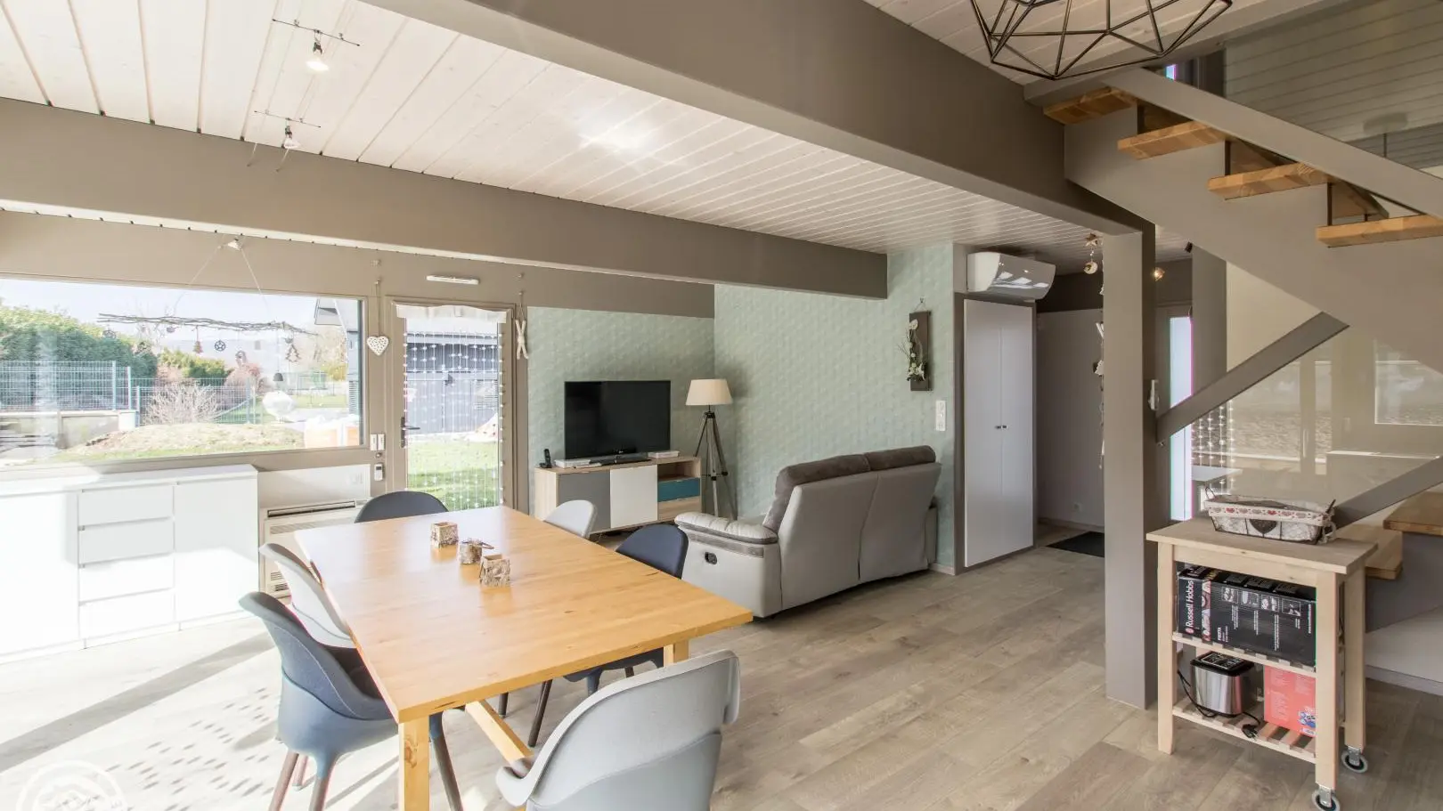Independant house (106m2) on 2 levels in a private subdivision of 9 pavilions. On the ground floor: fitted kitchen open to living room (sofa, Tv), bedroom (1 bed 160x200cm, private bathroom with walk-in shower), separate toilet, technical room/storage.