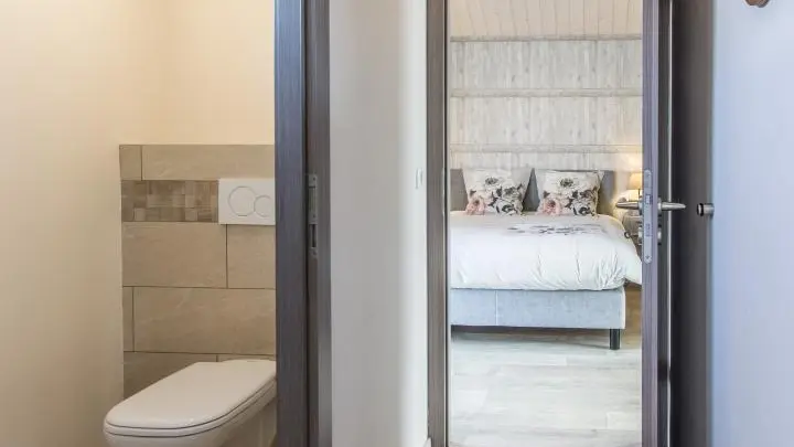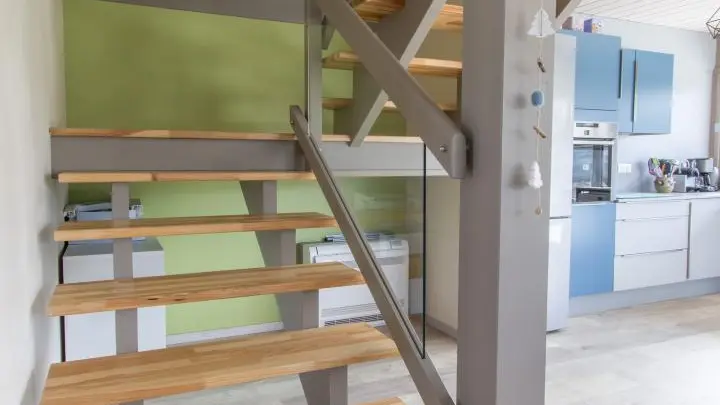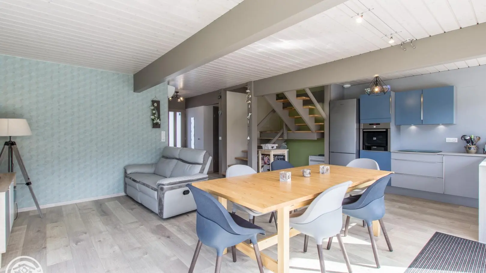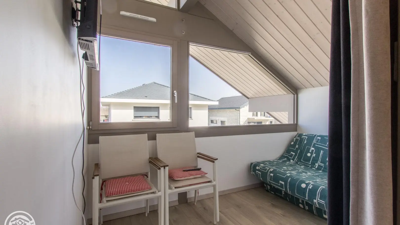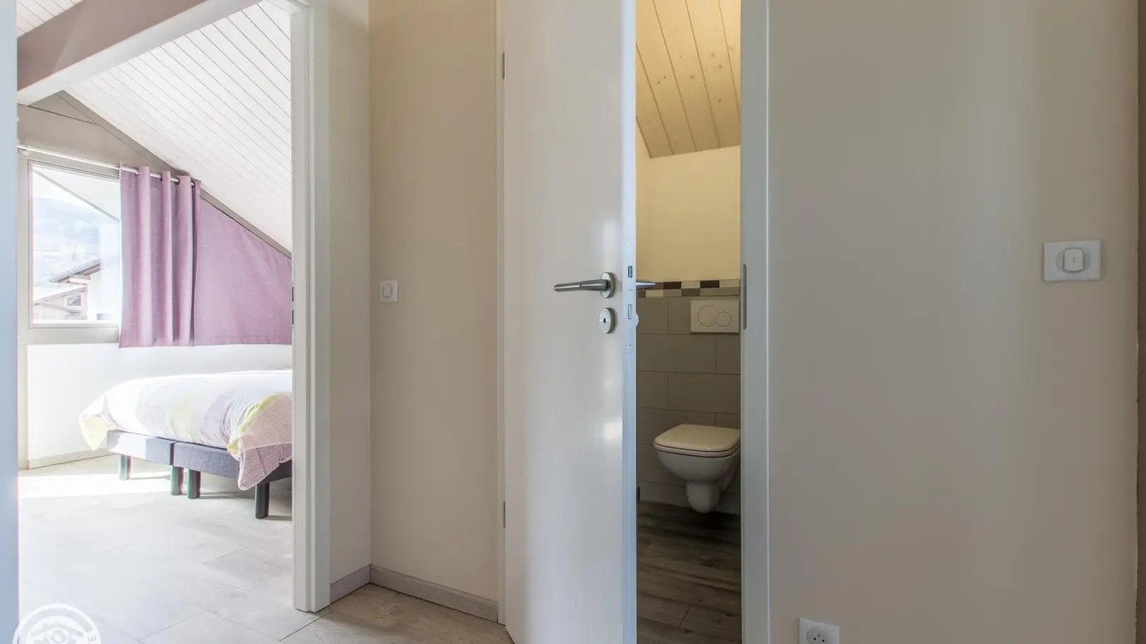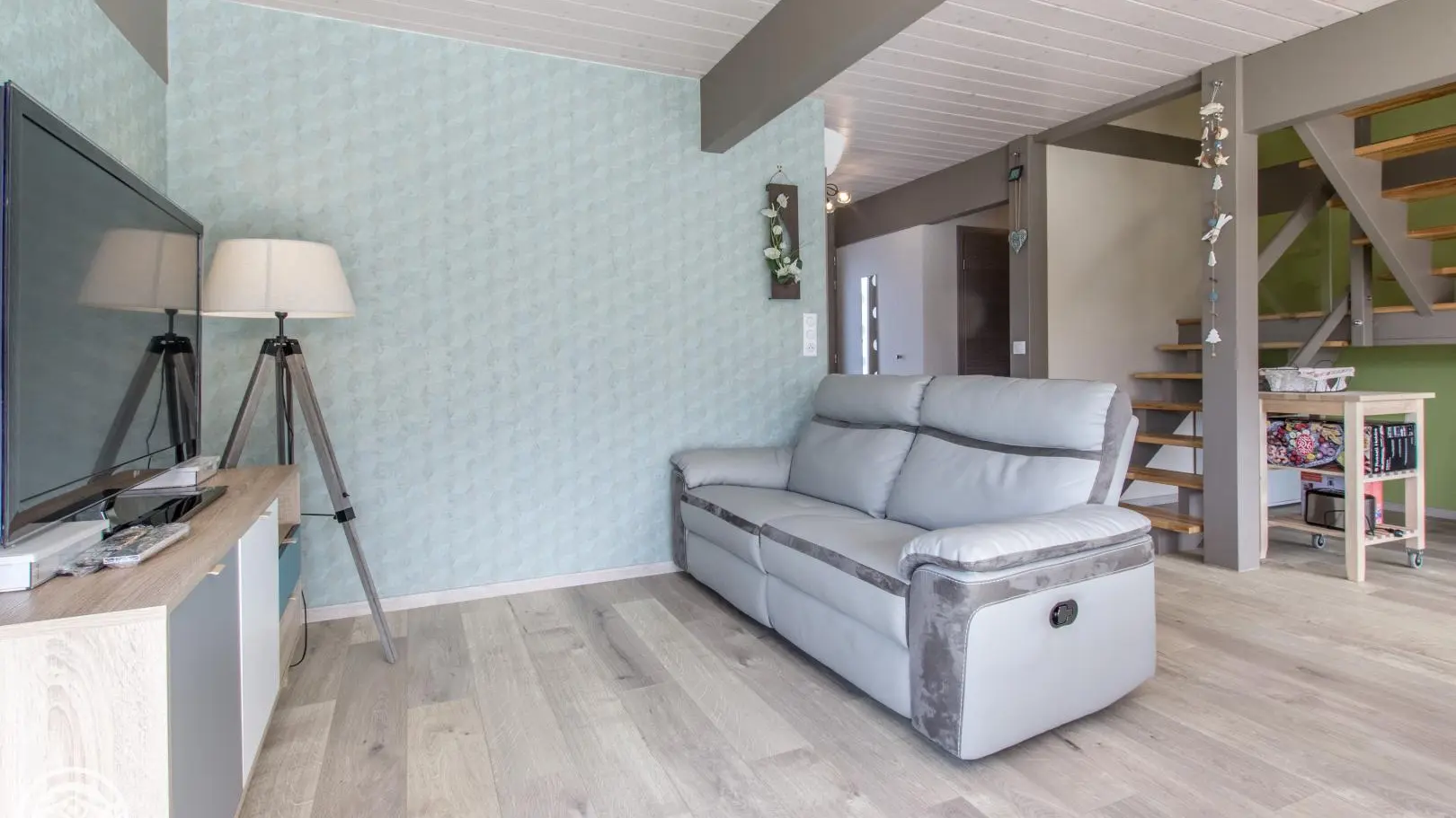 Upstairs: bedroom 2 (2 beds 80x200cm which can be twinned on request as a 160cm bed), bedroom 3 (1 bed 160x200cm), mezzanine area with TV and sofa bed, bathroom (shower), separate toilet.