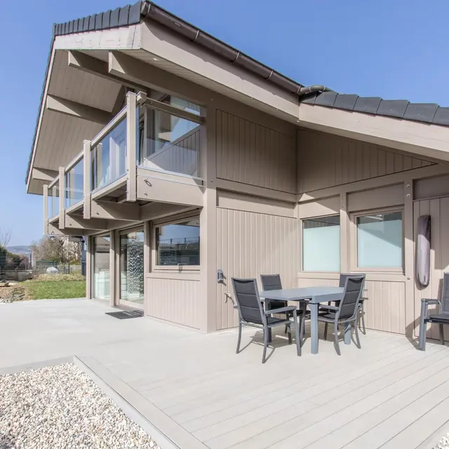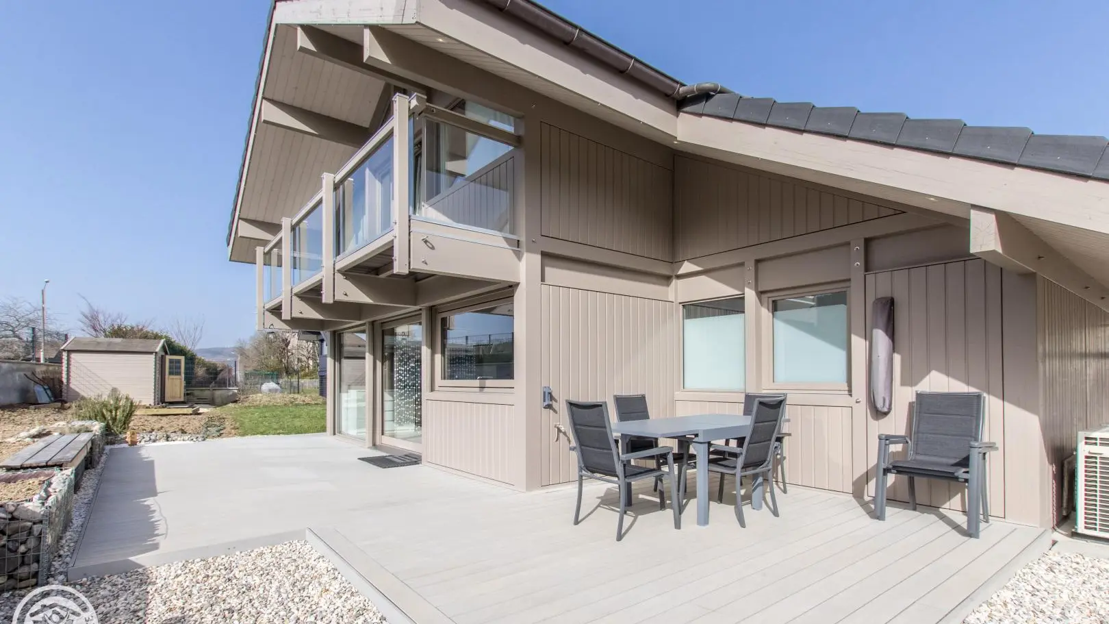 Balcony, beautiful south-facing terrace accessible from the living room with garden furniture, parasol, and plancha.