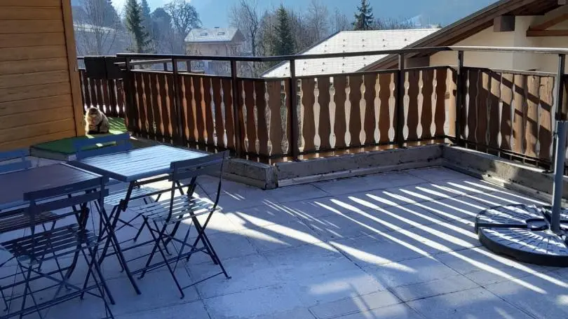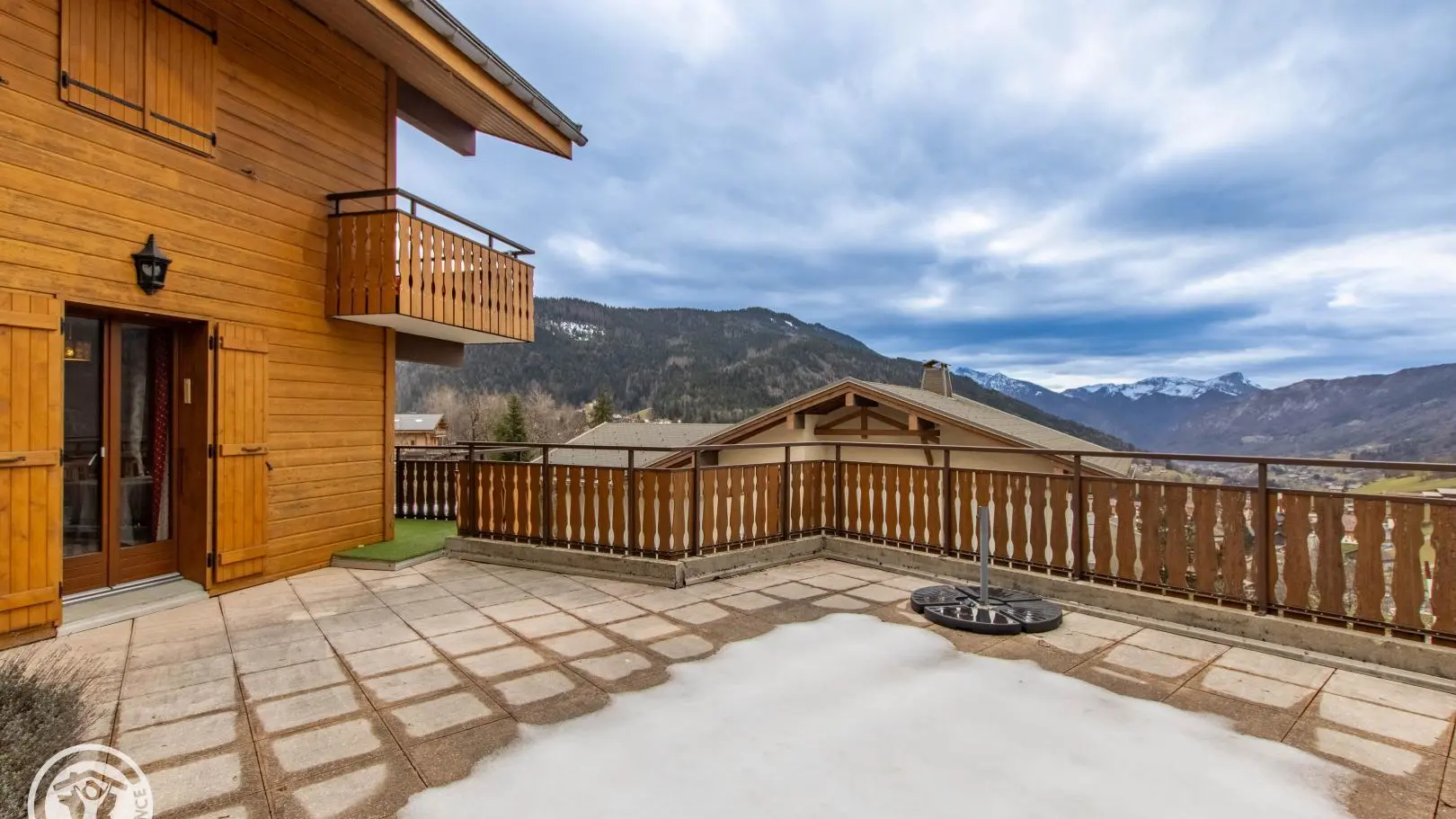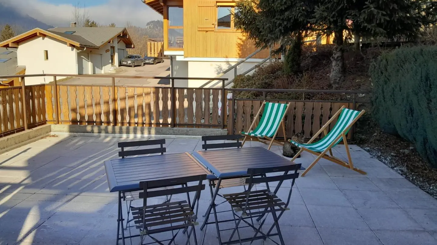 Balcony and large terrace with garden furniture, parasol, sun loungers, and electric barbecue. Beautiful views of the surrounding mountains.
