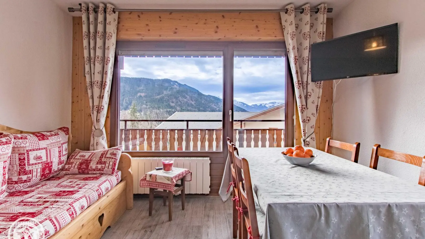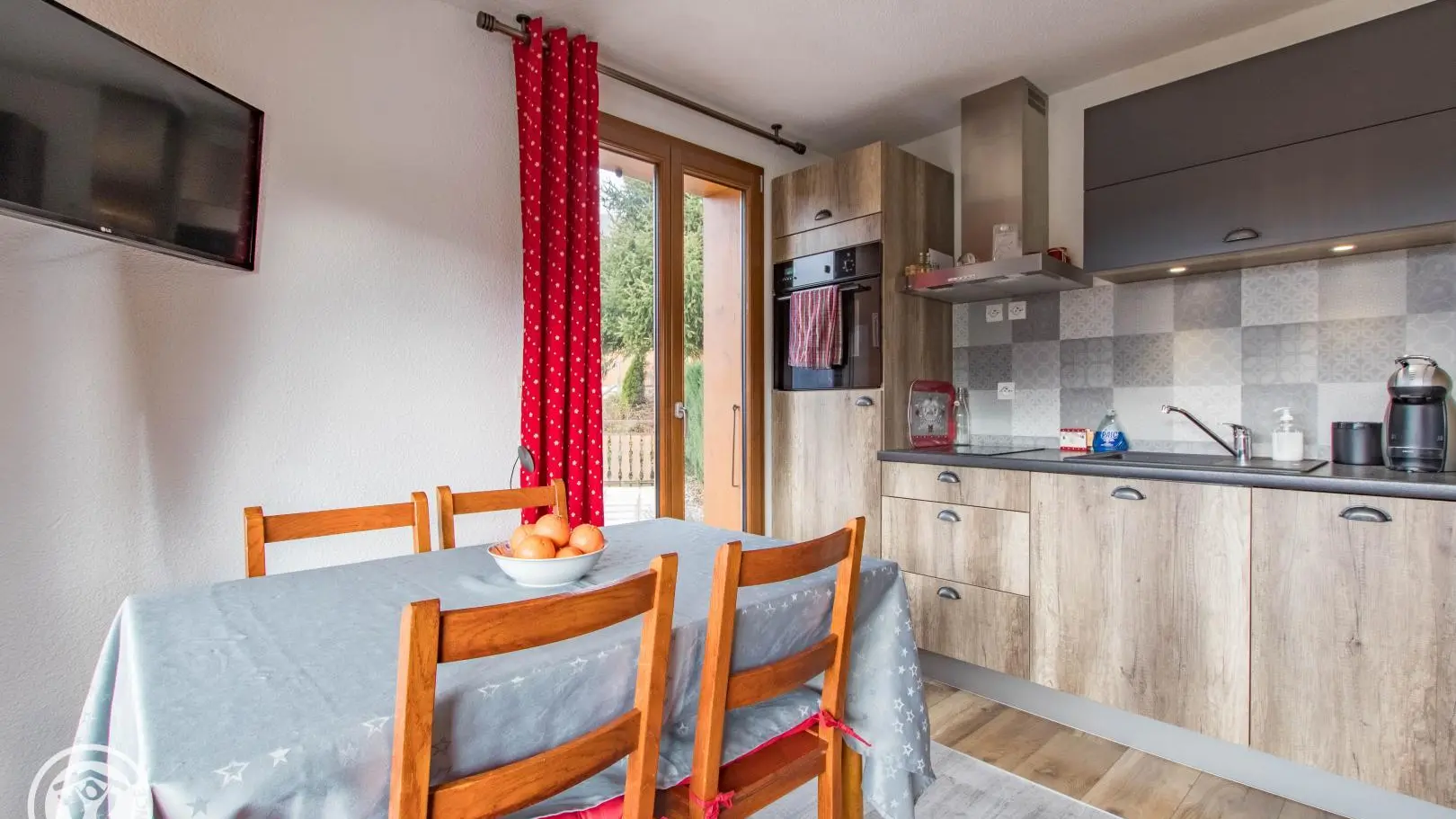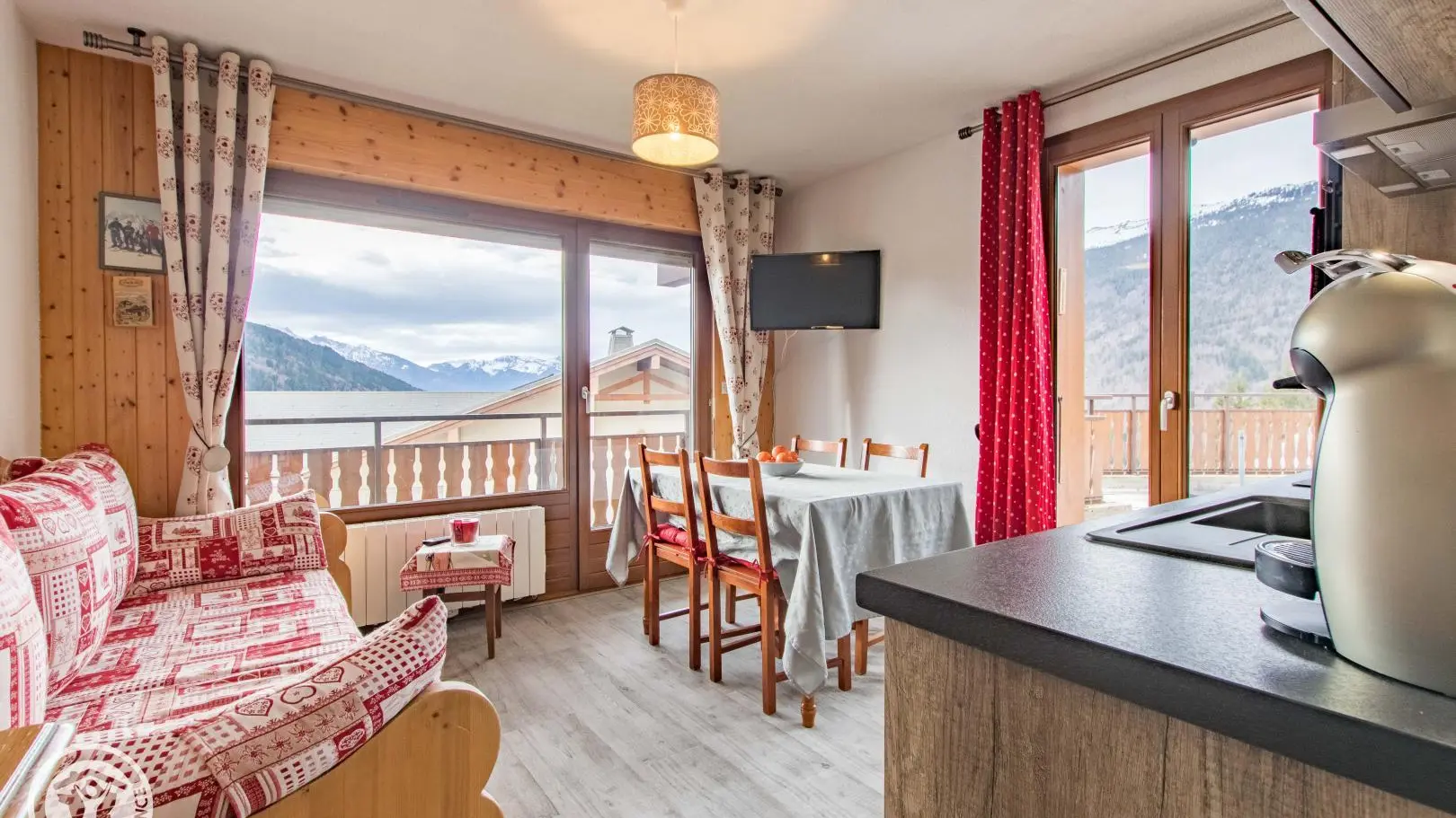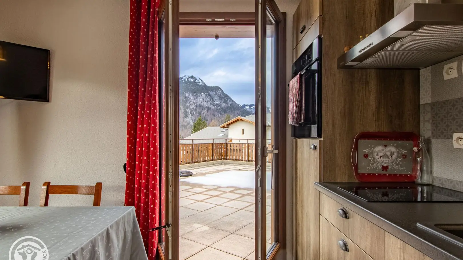 - Open-plan kitchen/living room: dining table, television, pull-out sofa bed (2 x 80cm), access to the large terrace and balcony.