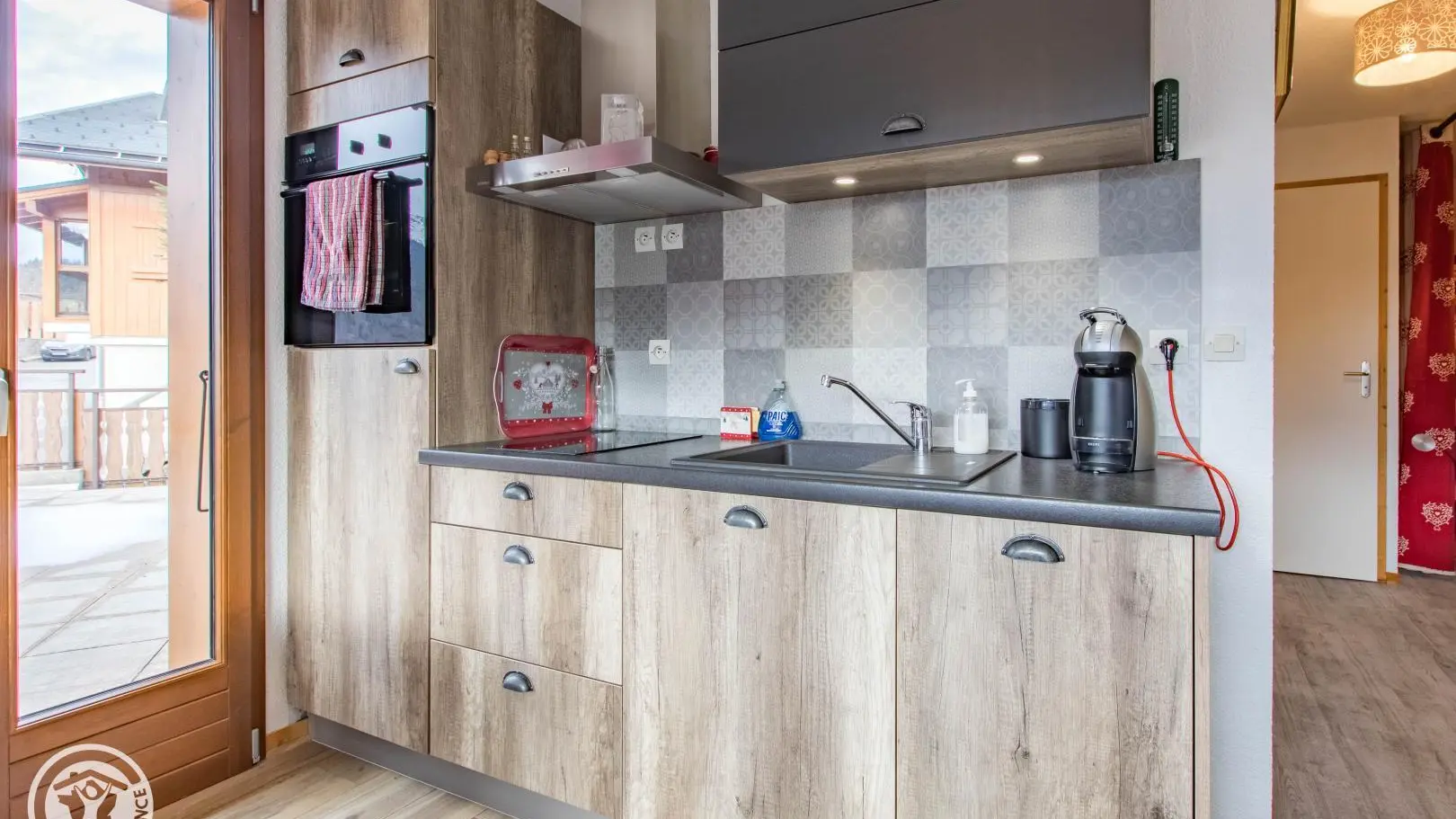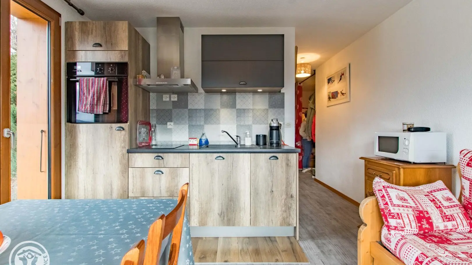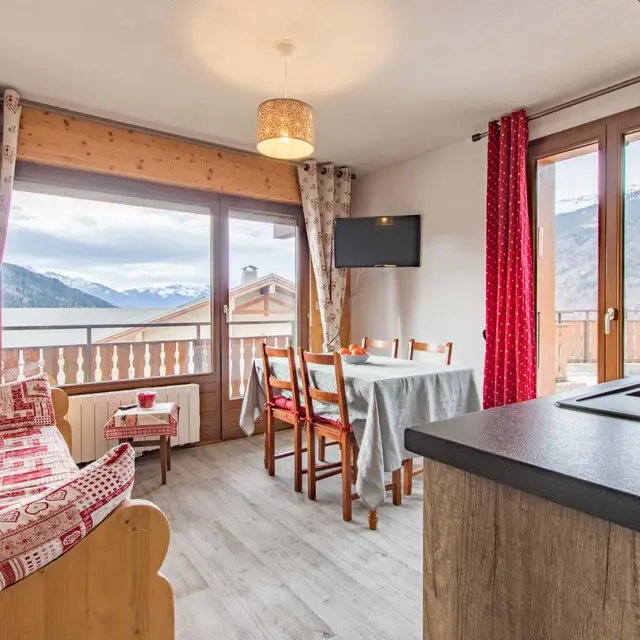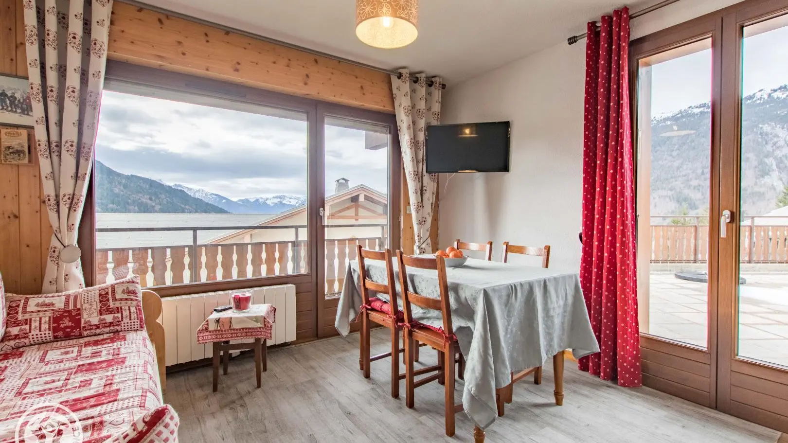 - Open-plan kitchen/living room: dining table, television, pull-out sofa bed (2 x 80cm), access to the large terrace and balcony.