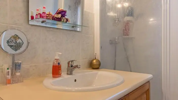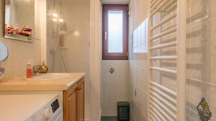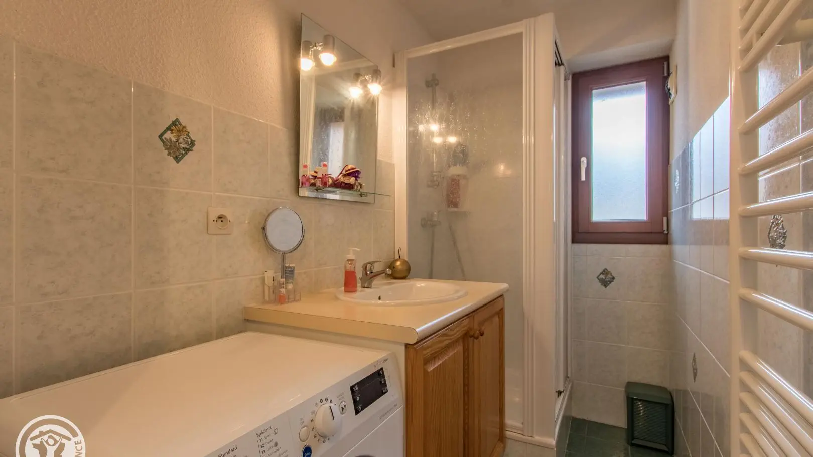- Bathroom: vanity unit with sink, shower, towel warmer, washing machine.
