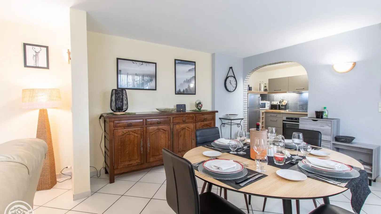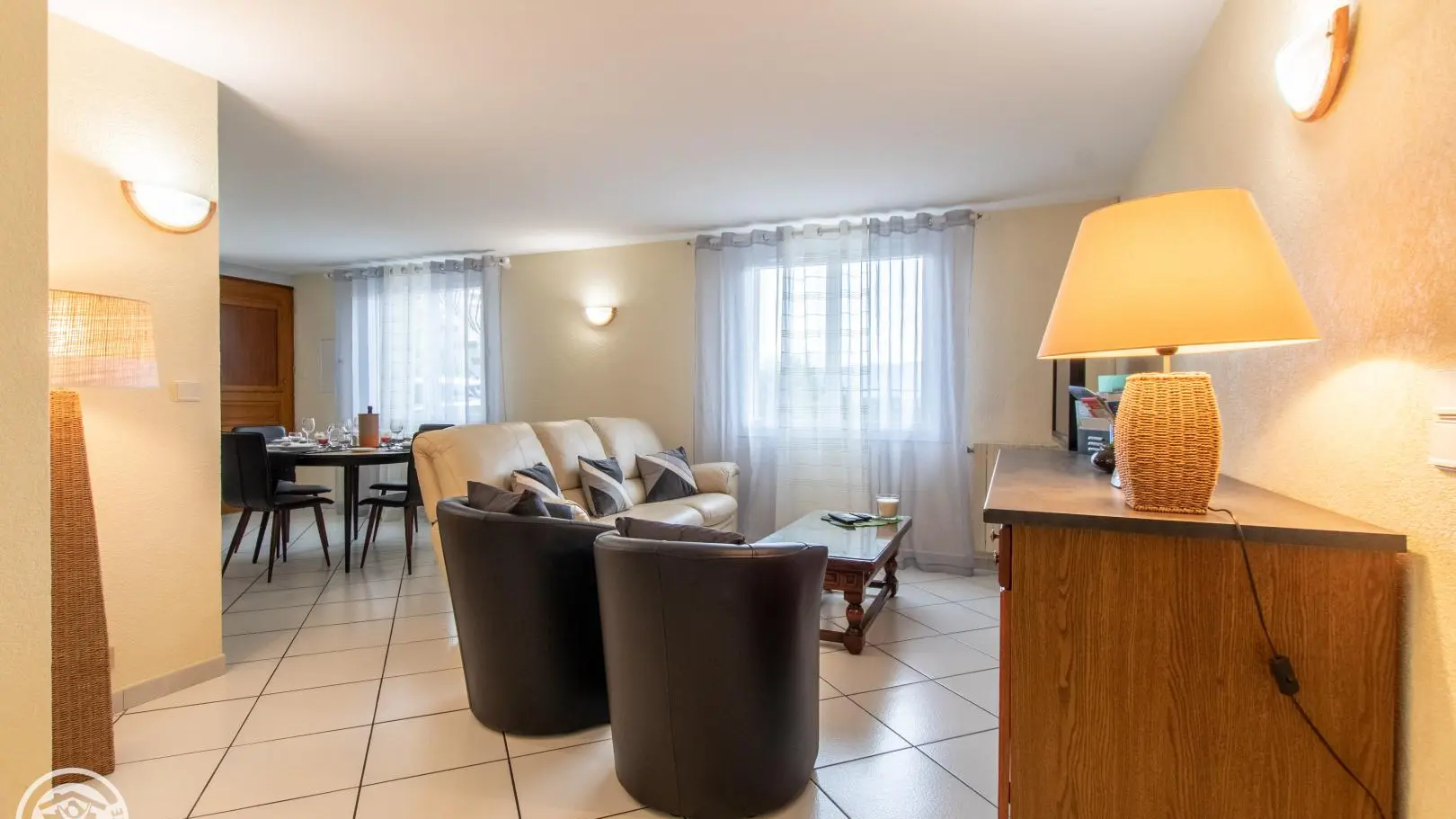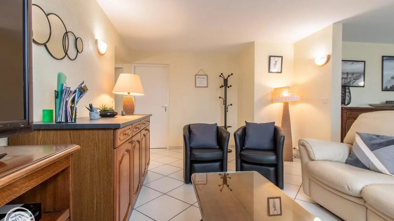 Large living room including an integrated kitchen area, a dining area with table for 4 people and a living room with sofa and armchairs, TV with DVD / Blu-Ray player. Laundry room with washing machine, dryer and various equipment.