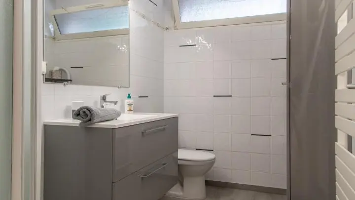Shower room with shower and WC, washbasin on cabinet, heated towel rail and storage space.