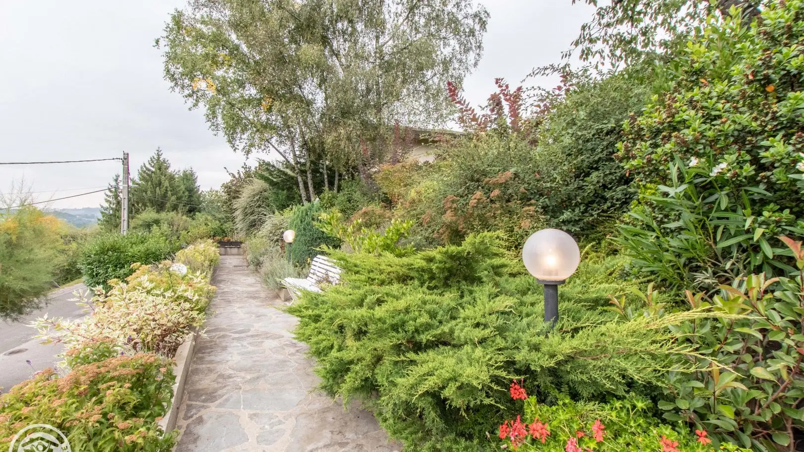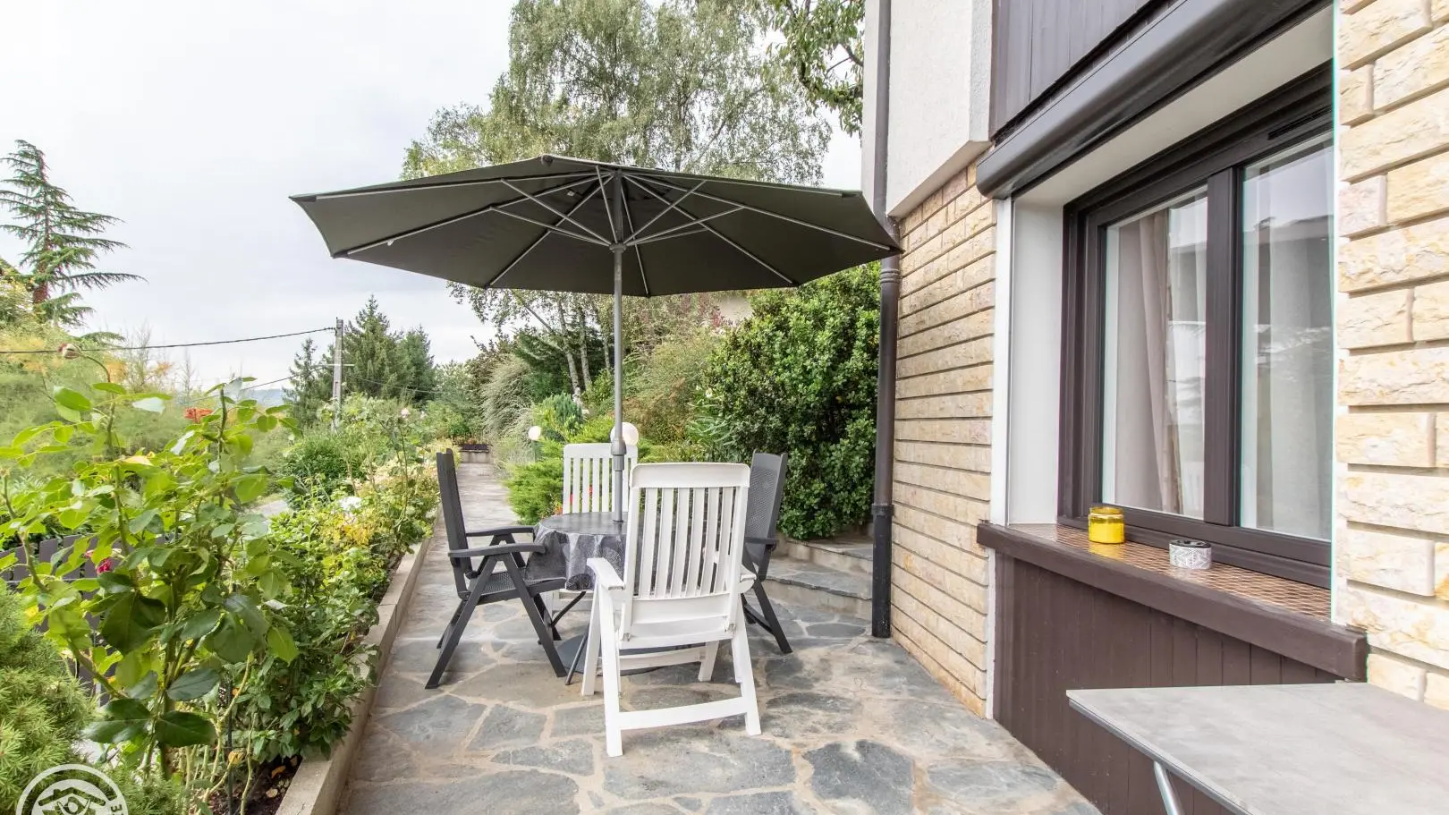 Level access to the gîte from the car park. Grassed area with sun baths accessible by an external staircase. Terrace in front of the gîte with garden furniture and bench.