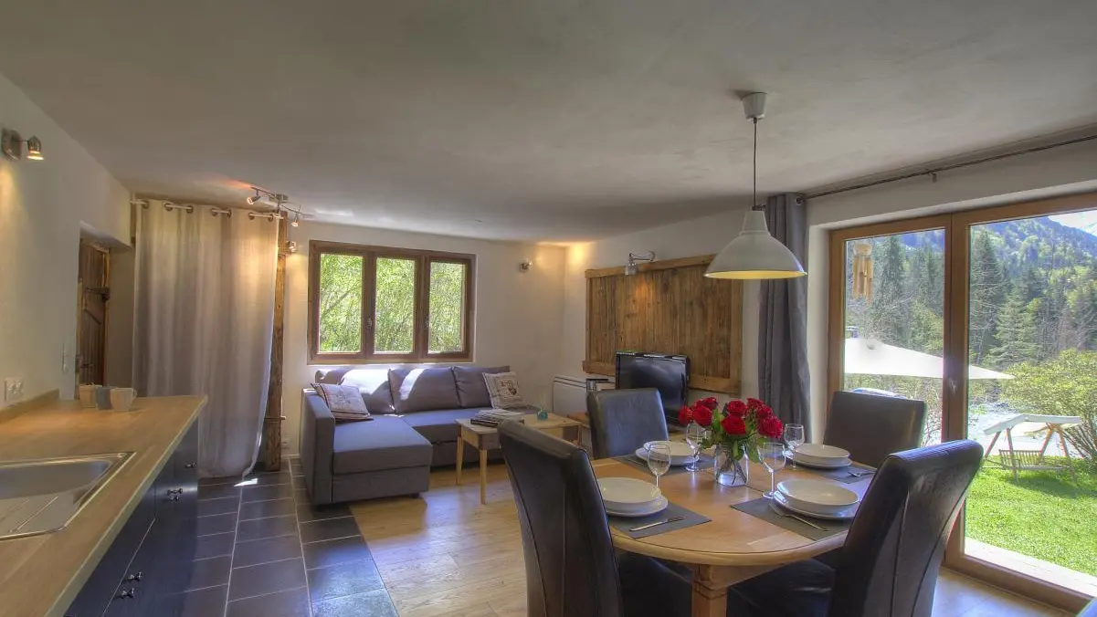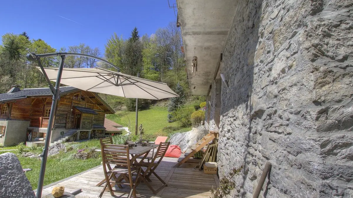 Gite independent access of 36m2 landscaped on the ground floor of a renovated farmhouse dating from the end of the 18th century, including the housing of the owners upstairs. Entry independent: fitted kitchen open to living room (sofa convertible in bed 140x200cm, Tv), bedroom with 1 bed 140x190cm (mountain view), bathroom (shower) with toilet. South Terrace (access via 6 steps) with furniture, deckchairs and barbeque. No-clos garden with children's games. The sheets and the toilet lingede are provided. Wifi Internet. Ski area of les Houches to 7km. Chamonix Centre 14km (15 minutes by car). Footpaths departing from the cottage. Thermes saint-Gervais at 10km. Possibility of fishing in the stream beside the cottage. Reduction 10% for 3 consecutive weeks.