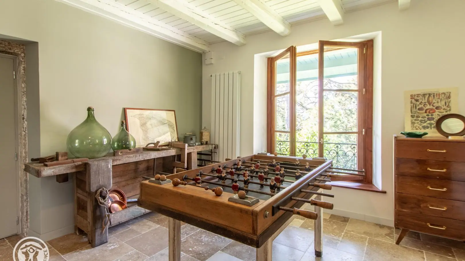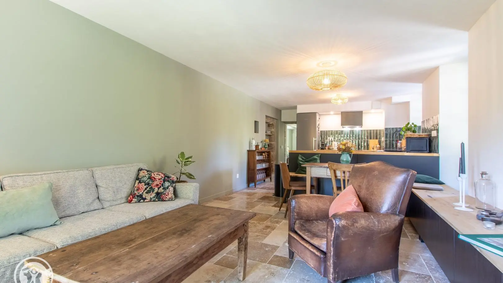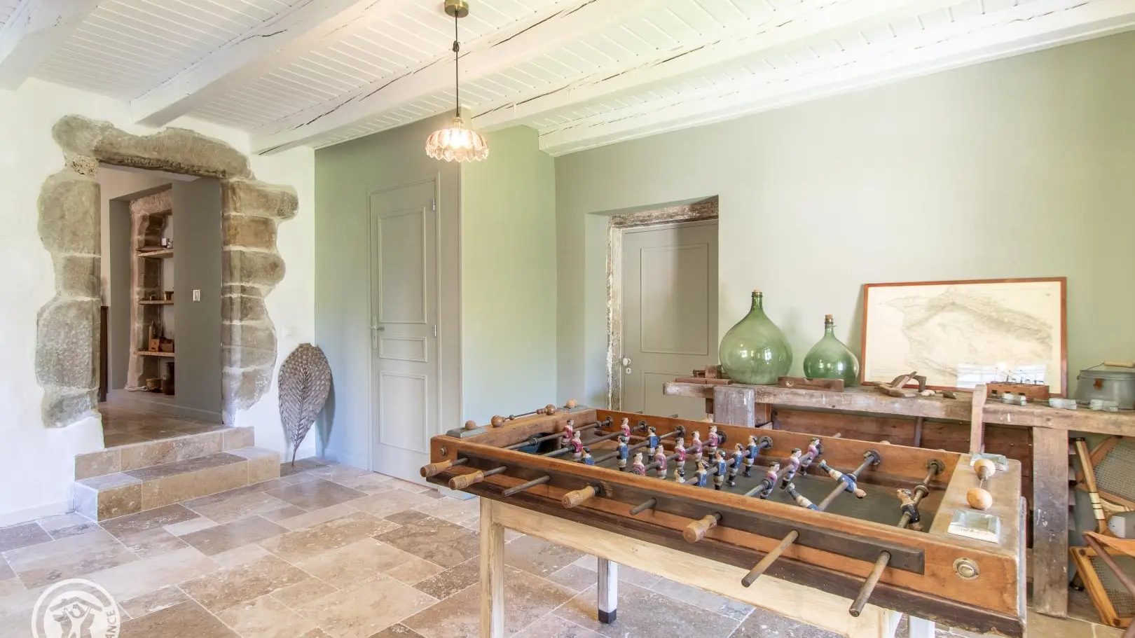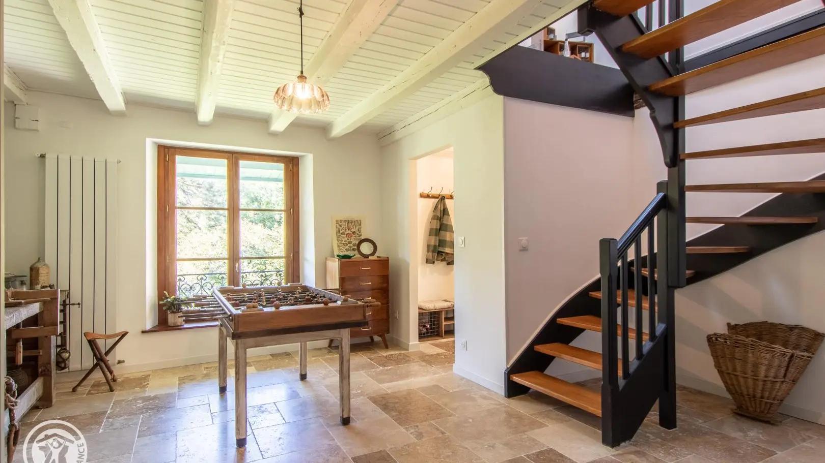 On the 1st level, large entrance hall with reading corner, vintage table football, separate WC and staircase leading upstairs. Access to the main room (2 steps) consisting of a fitted kitchen open to the living room with return allowing a backrest to be provided for the dining table seats. Living room with leather sofa and armchair, TV.