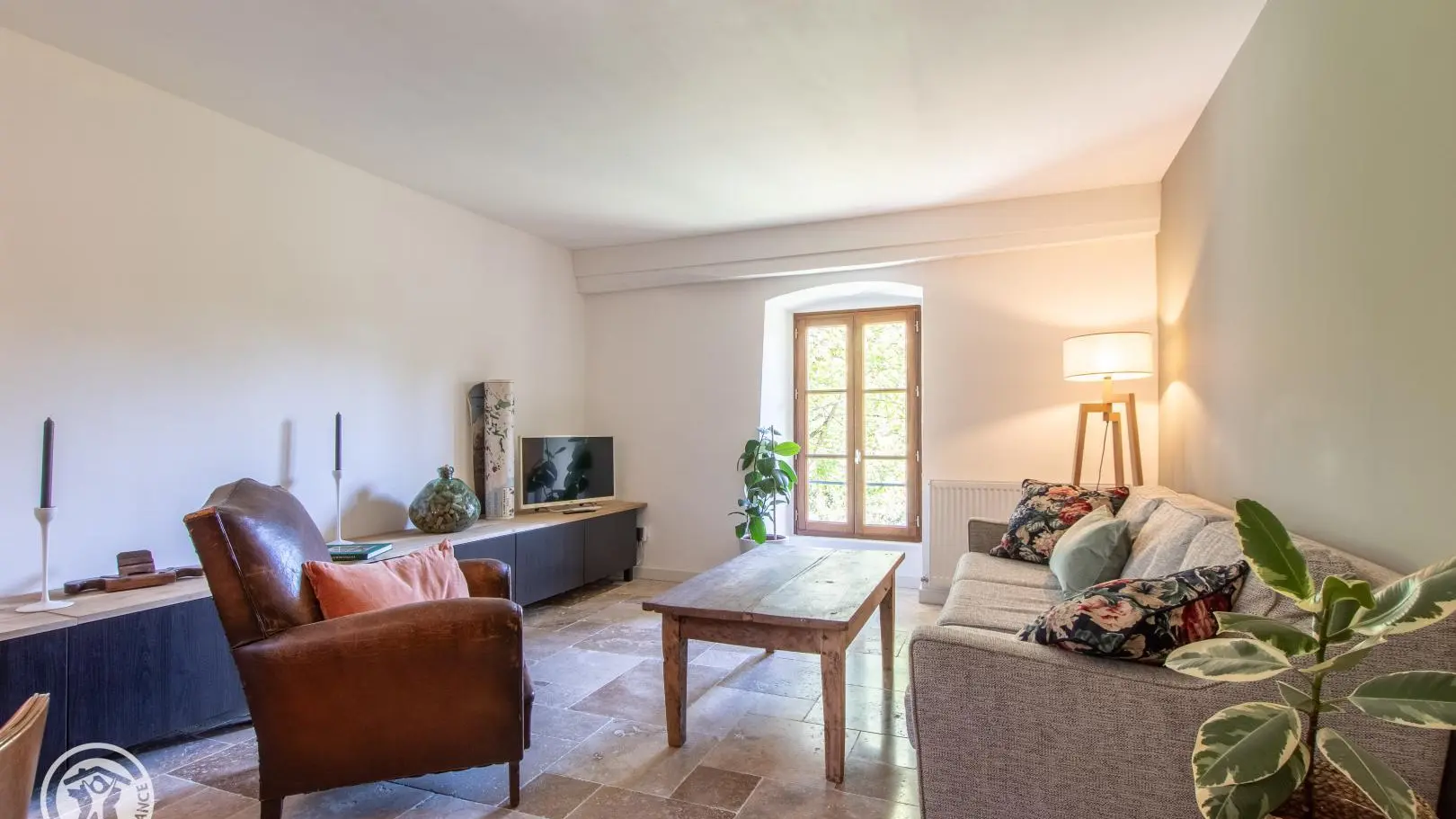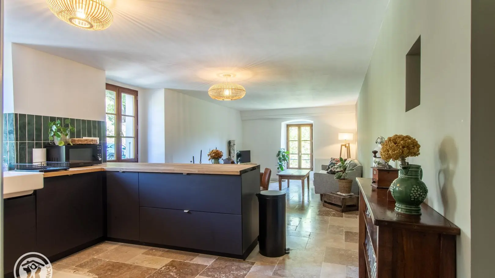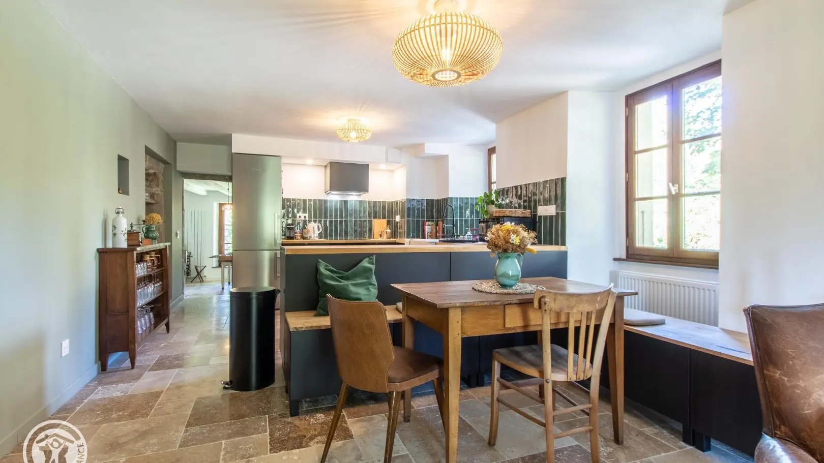 On the 1st level, large entrance hall with reading corner, vintage table football, separate WC and staircase leading upstairs. Access to the main room (2 steps) consisting of a fitted kitchen open to the living room with return allowing a backrest to be provided for the dining table seats. Living room with leather sofa and armchair, TV.