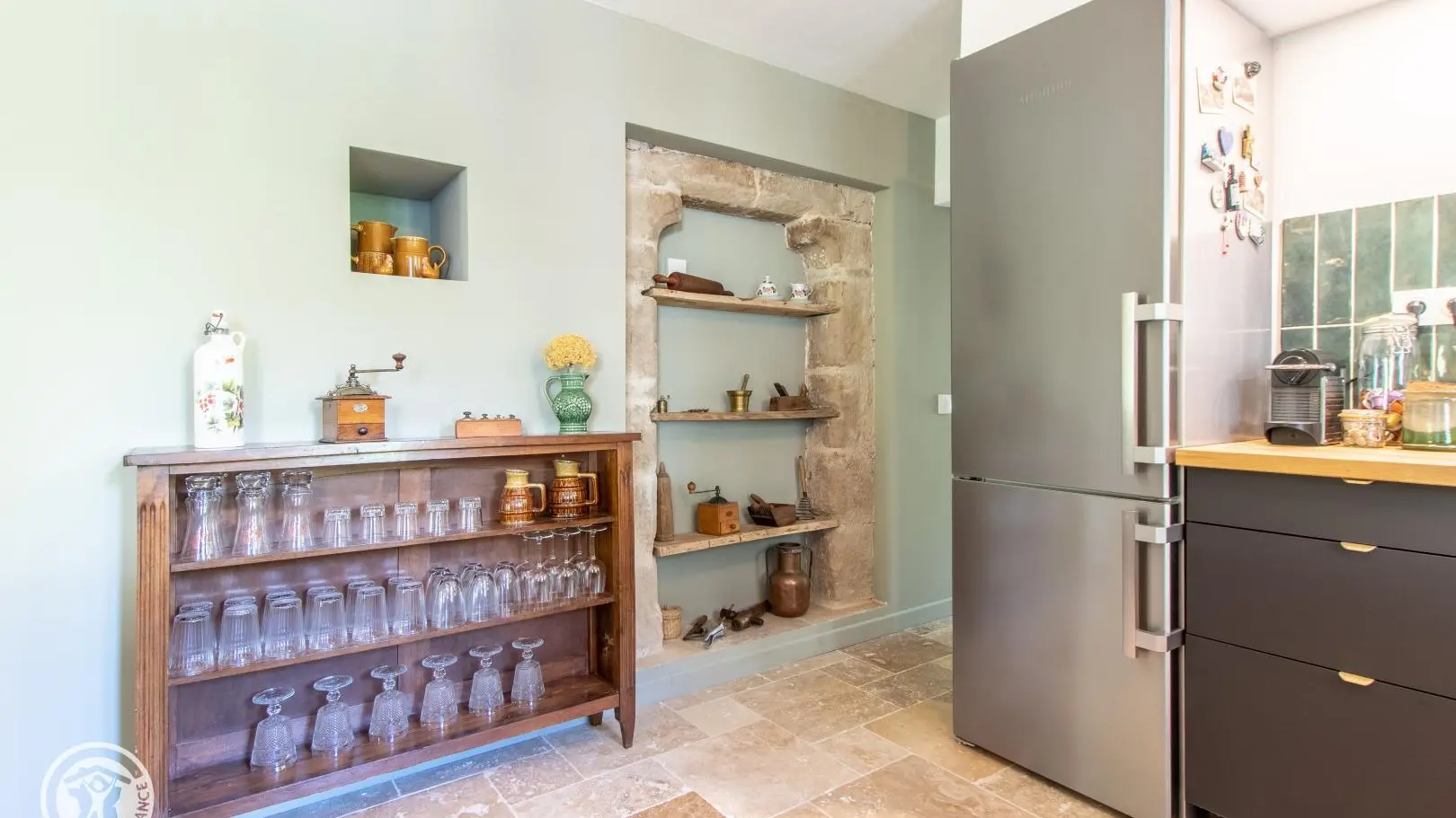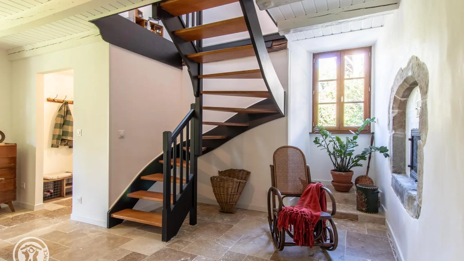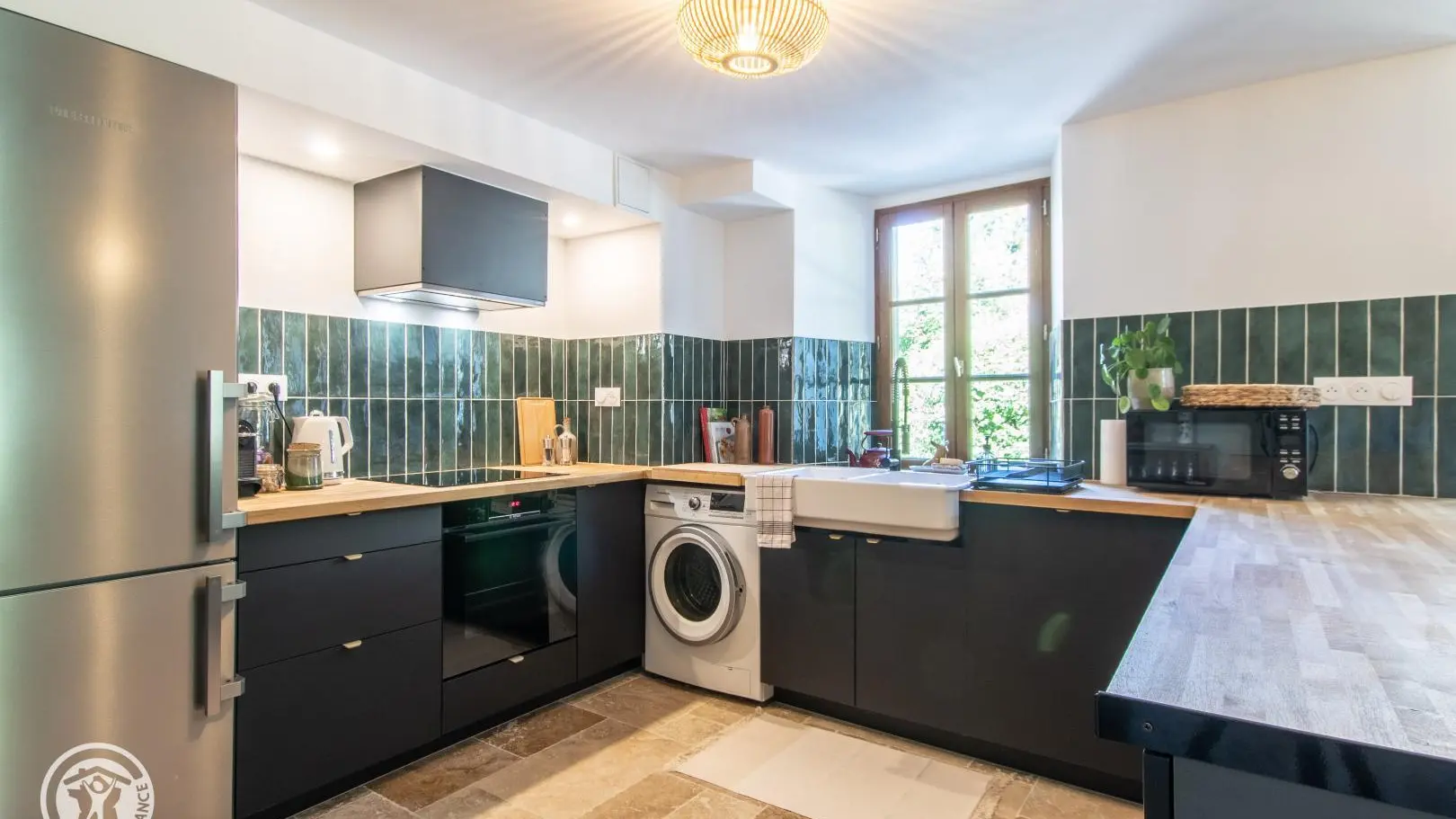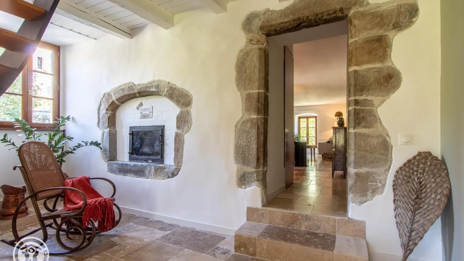 On the 1st level, large entrance hall with reading corner, vintage table football, separate WC and staircase leading upstairs. Access to the main room (2 steps) consisting of a fitted kitchen open to the living room with return allowing a backrest to be provided for the dining table seats. Living room with leather sofa and armchair, TV.