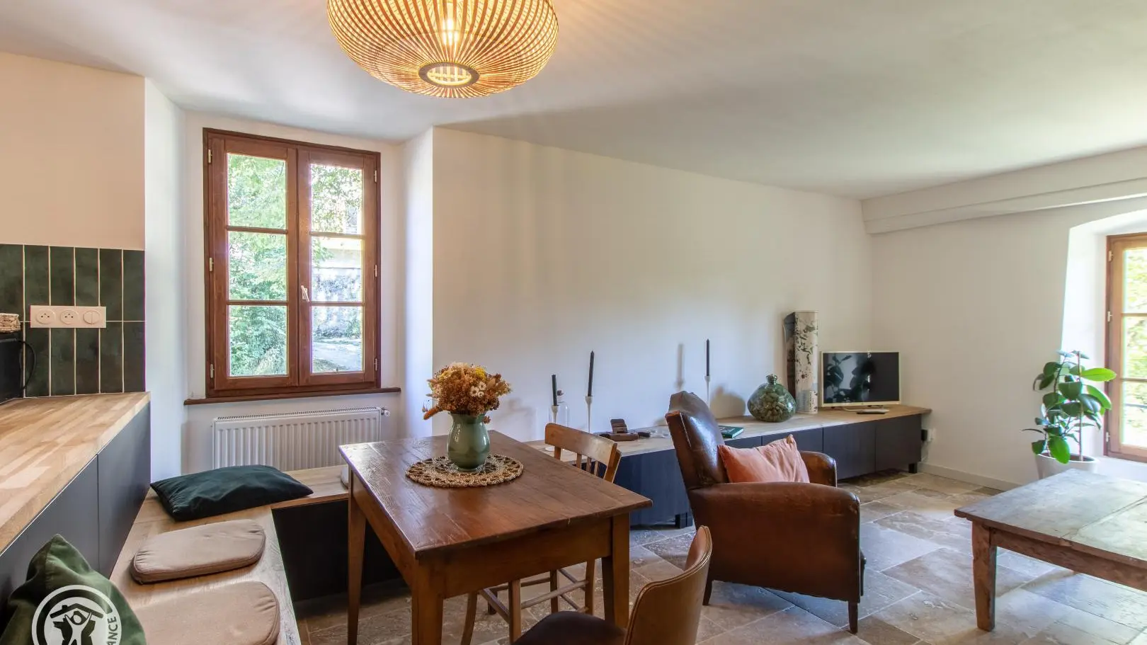 In the heart of the hills of Frangy, large terraced house including the gîte as well as the owners' accommodation, configured completely independently. Gîte on two levels on a raised base (access to the gîte via an external staircase of 7 steps).