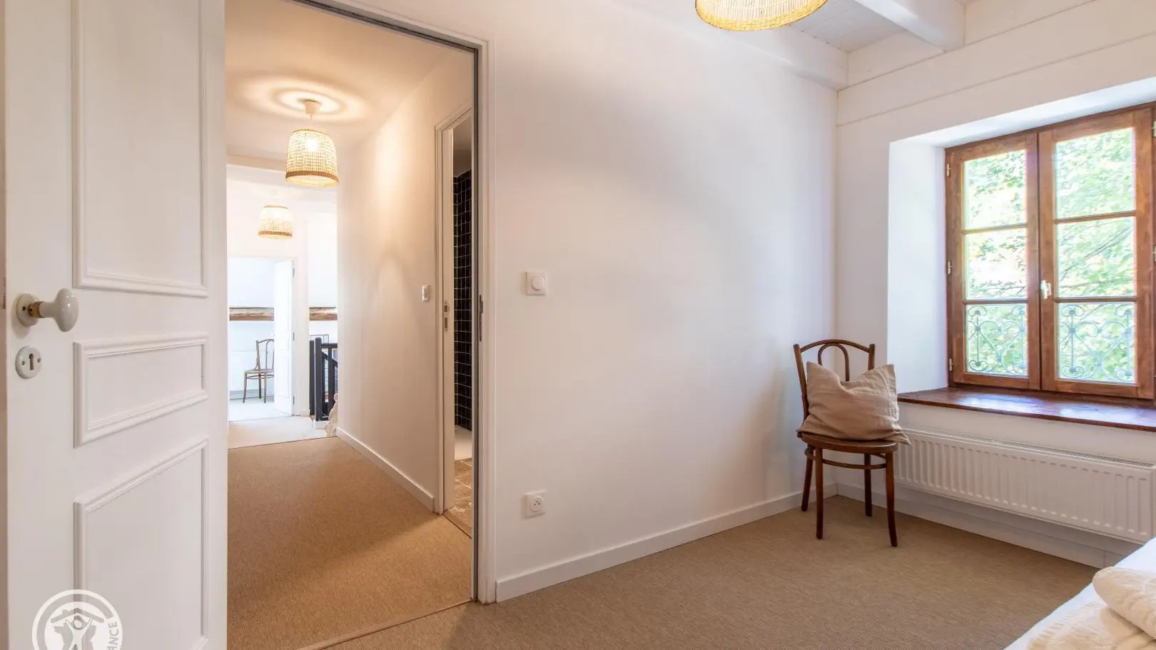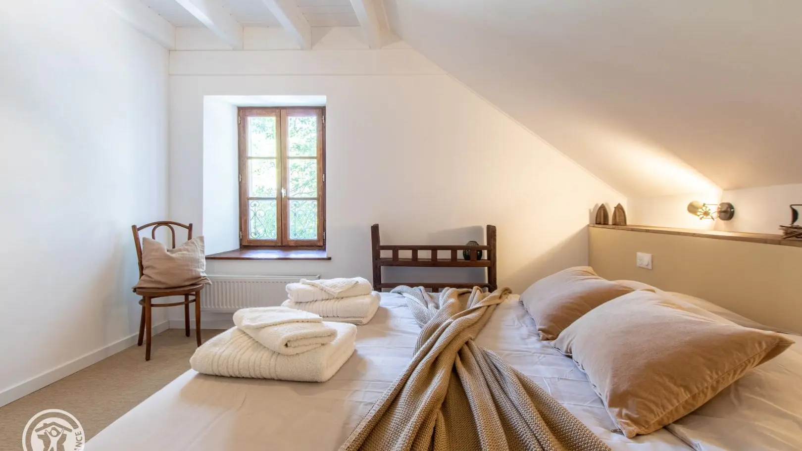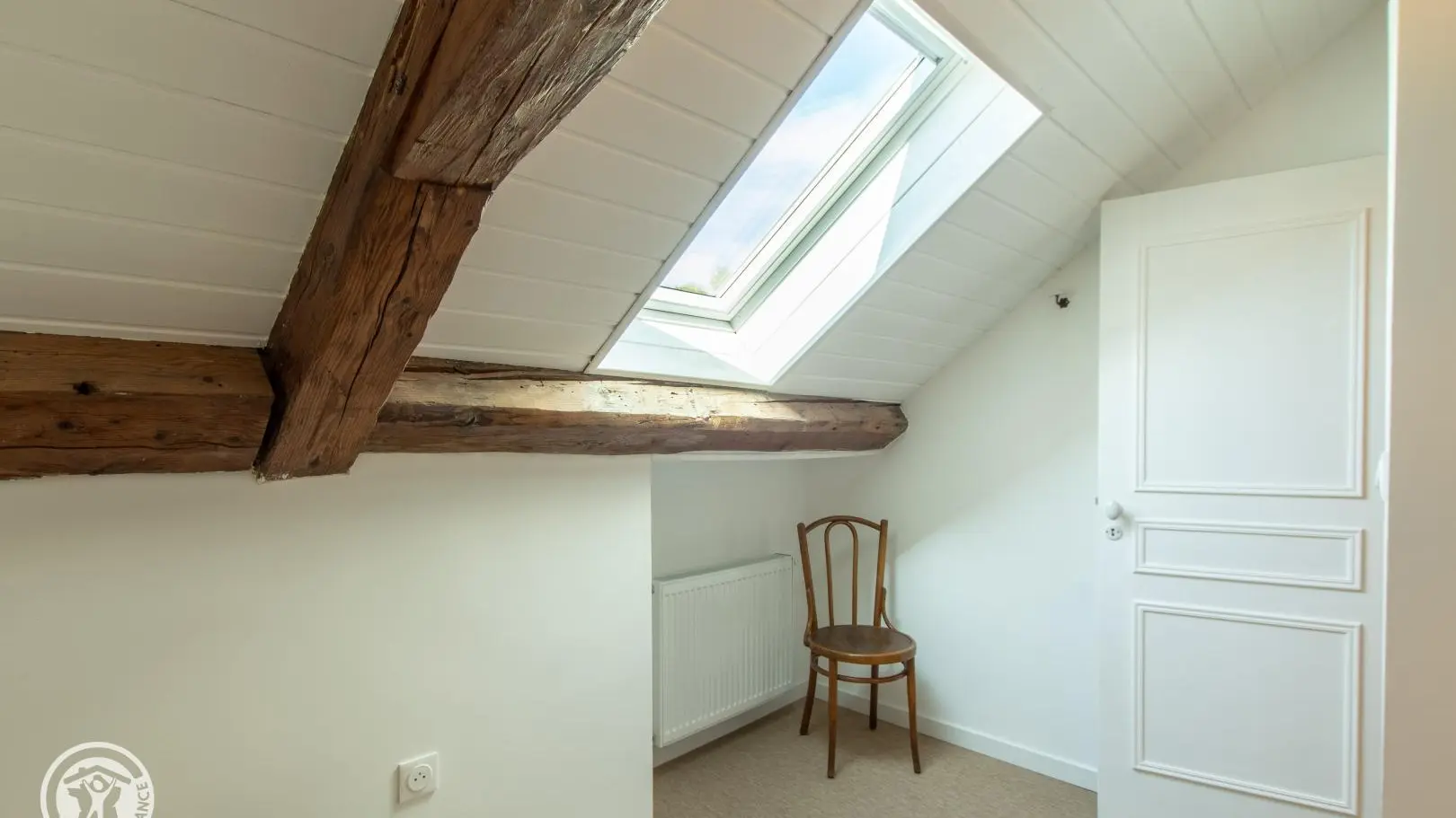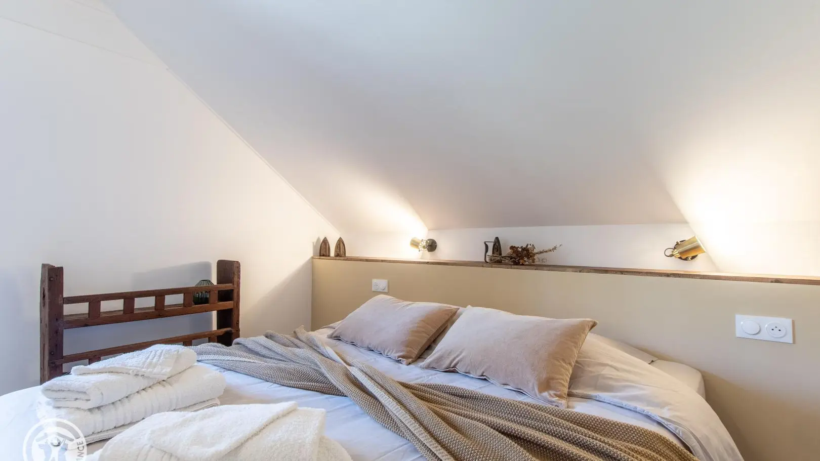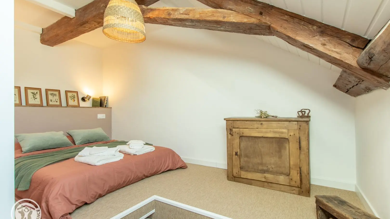 Upstairs, 2 bedrooms with 140x190 cm and 160x200 cm beds. Large bathroom with walk-in shower, vanity basin, WC.