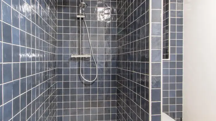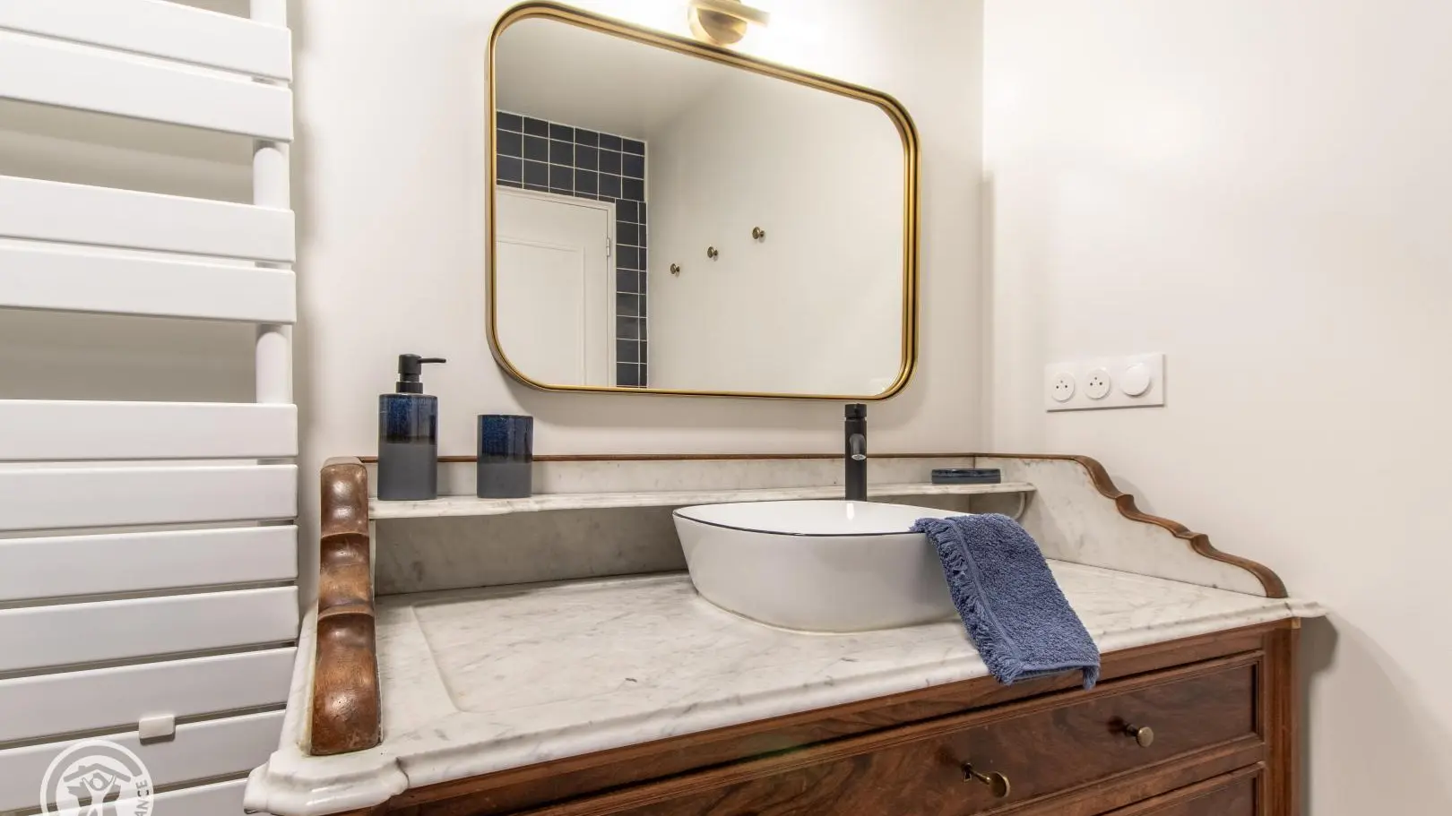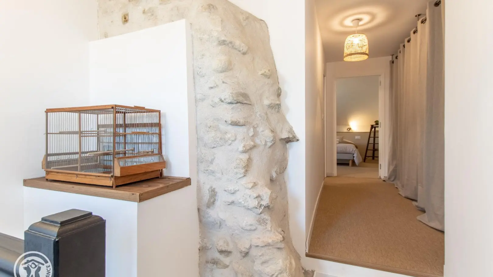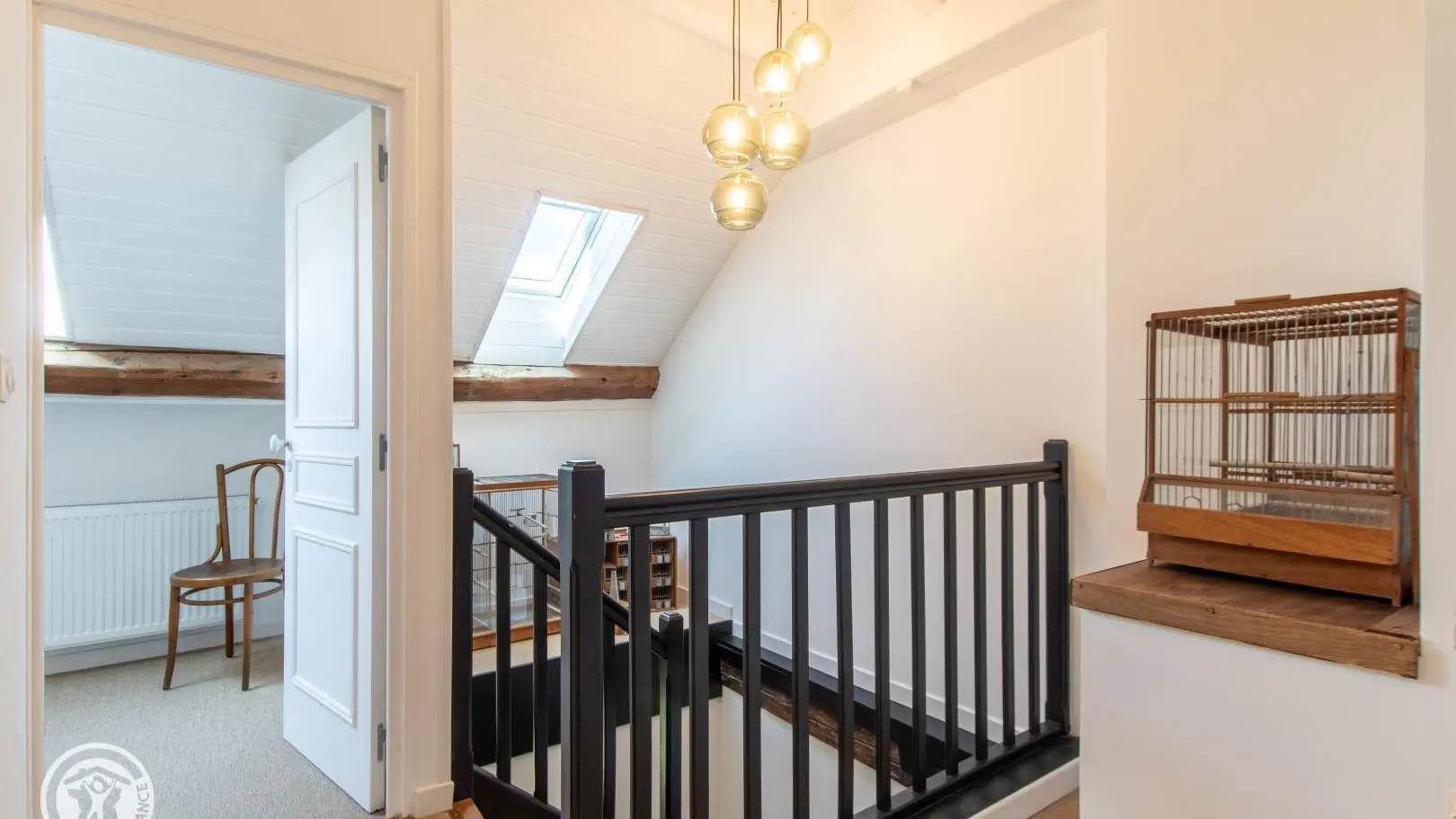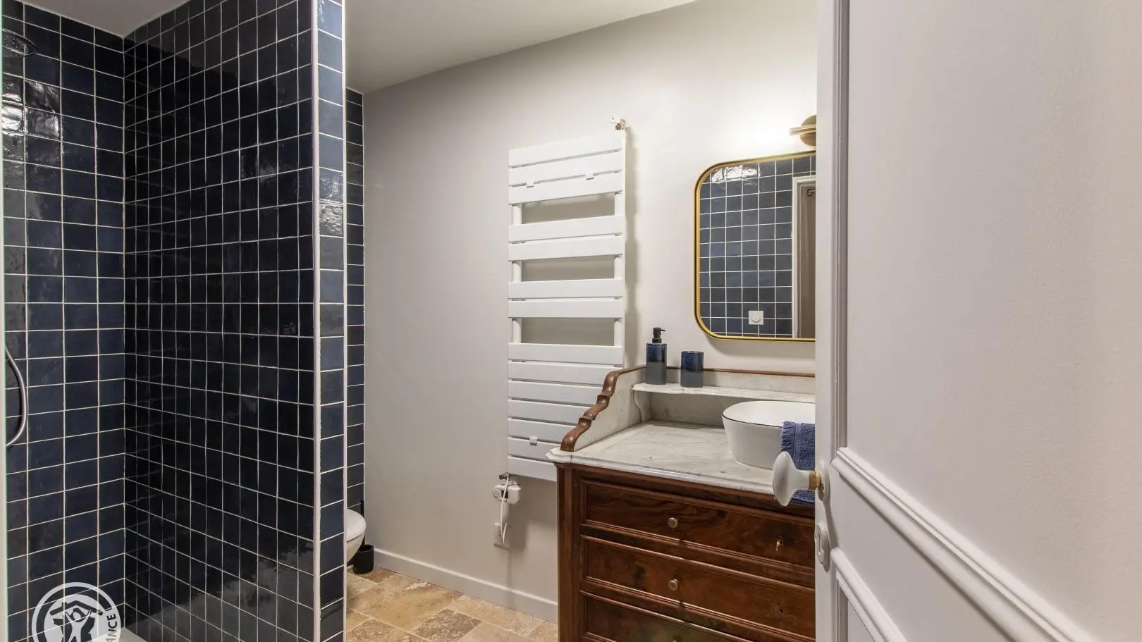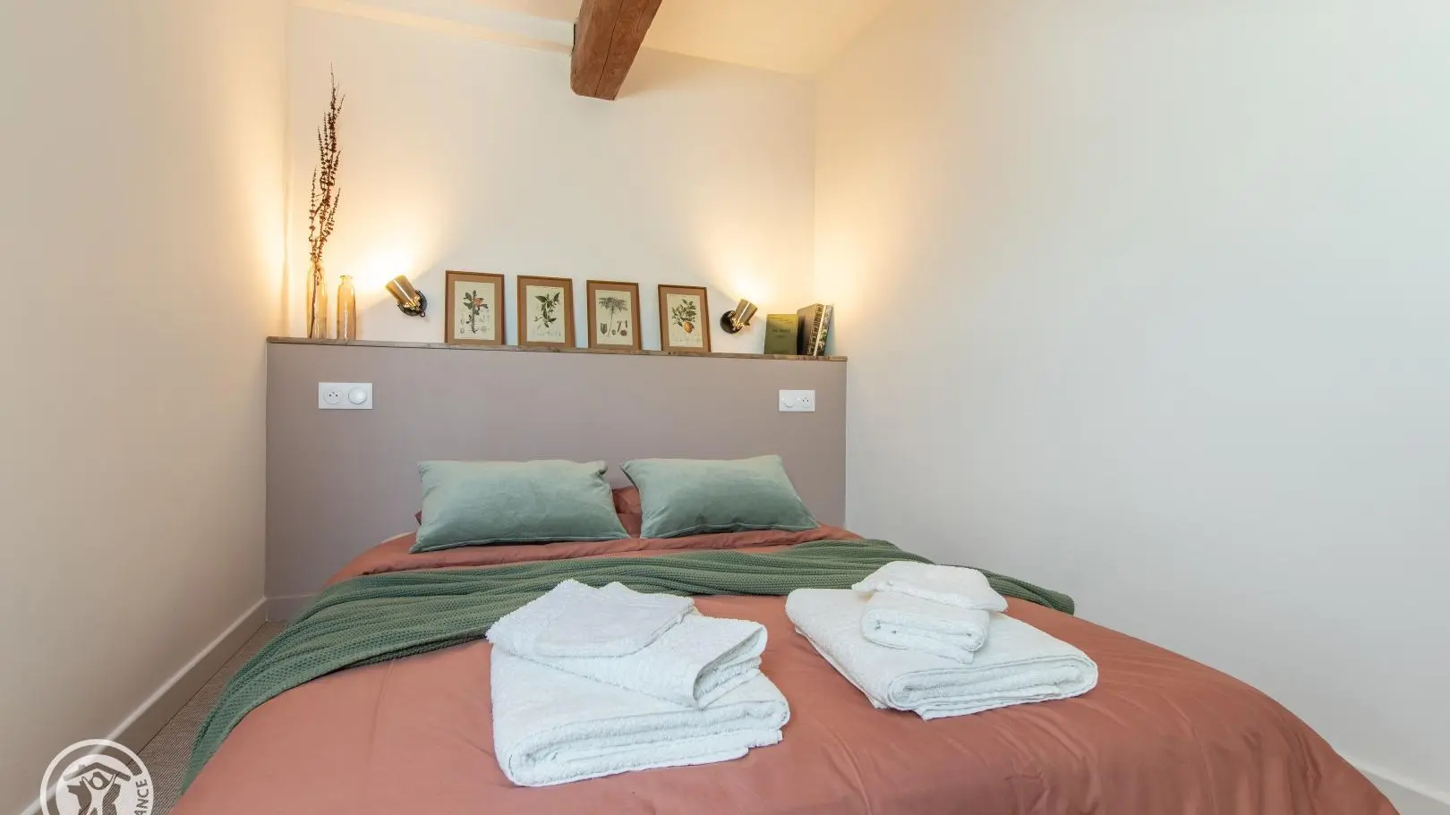Upstairs, 2 bedrooms with 140x190 cm and 160x200 cm beds. Large bathroom with walk-in shower, vanity basin, WC.