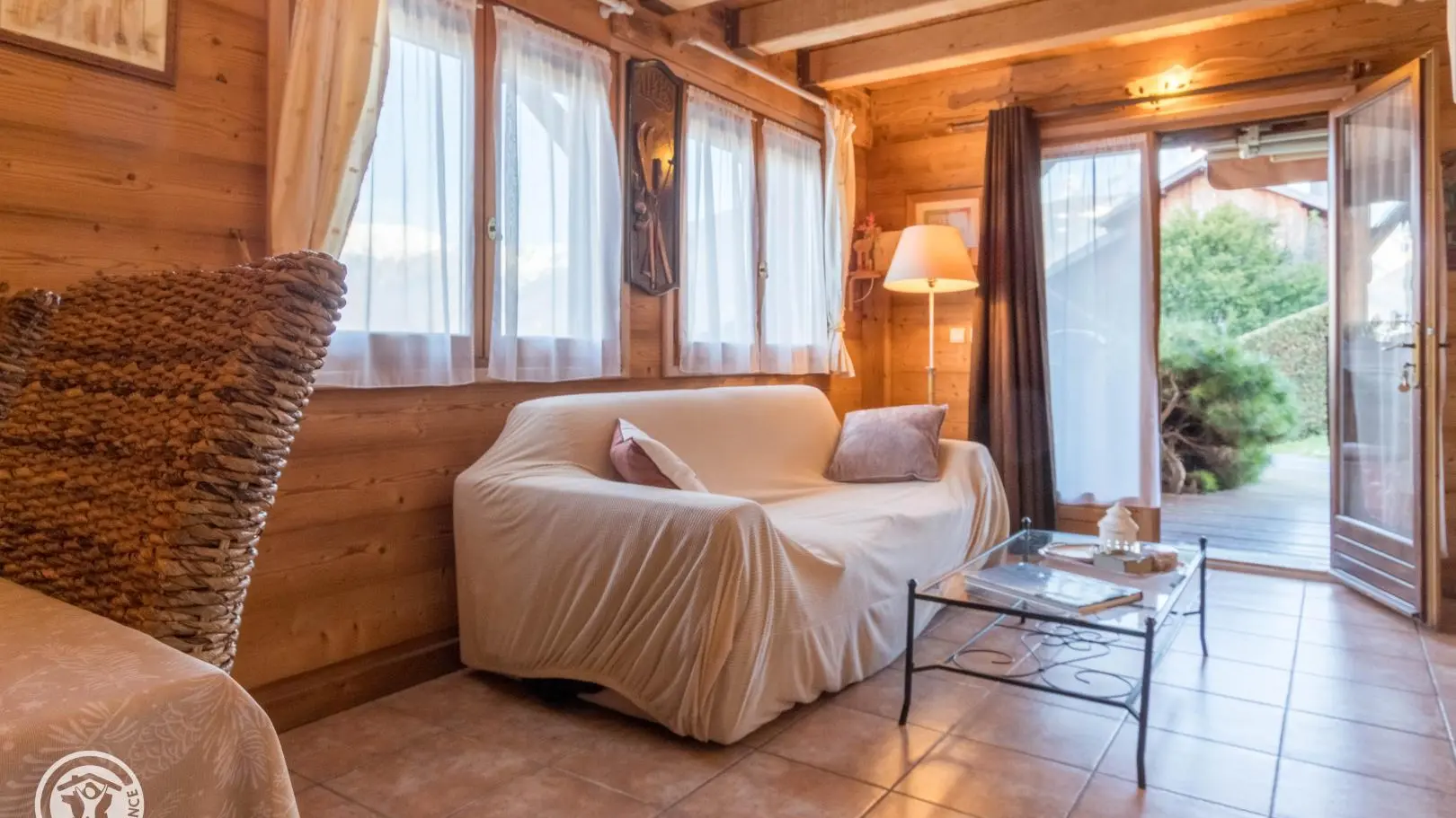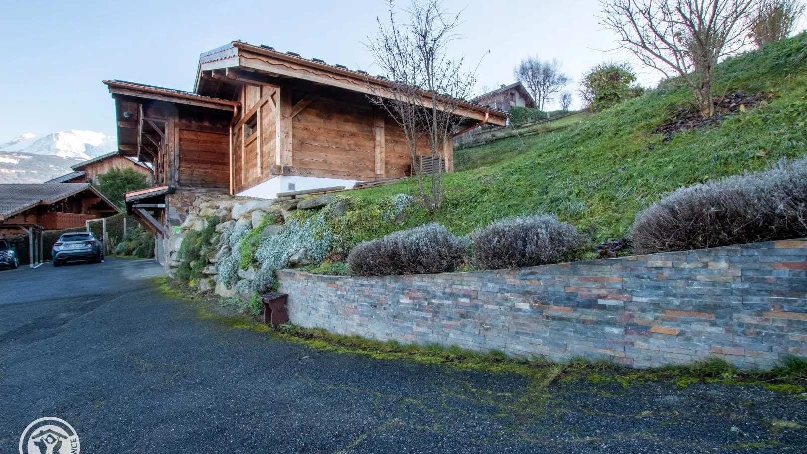 In the heart of the Pays du Mont-Blanc, panoramic view of the Mont-Blanc massif for this characterful chalet (47m2 + attics) arranged on 2 levels next to the owners' house.
