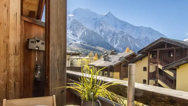 Very beautiful view of the Mont-Blanc massif from the terrace and the balcony (Aiguilles de Chamonix, glaciers).