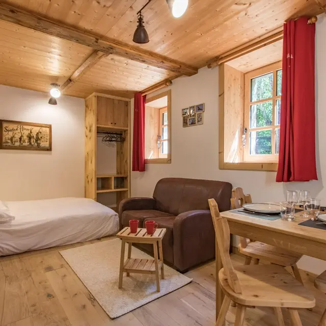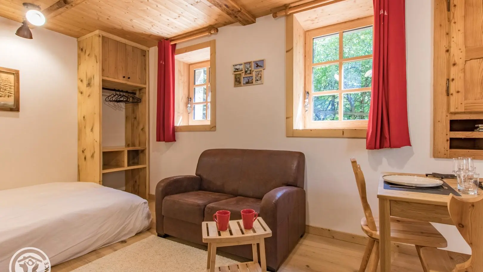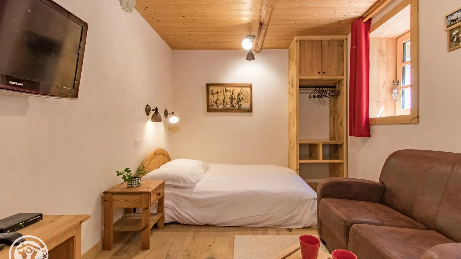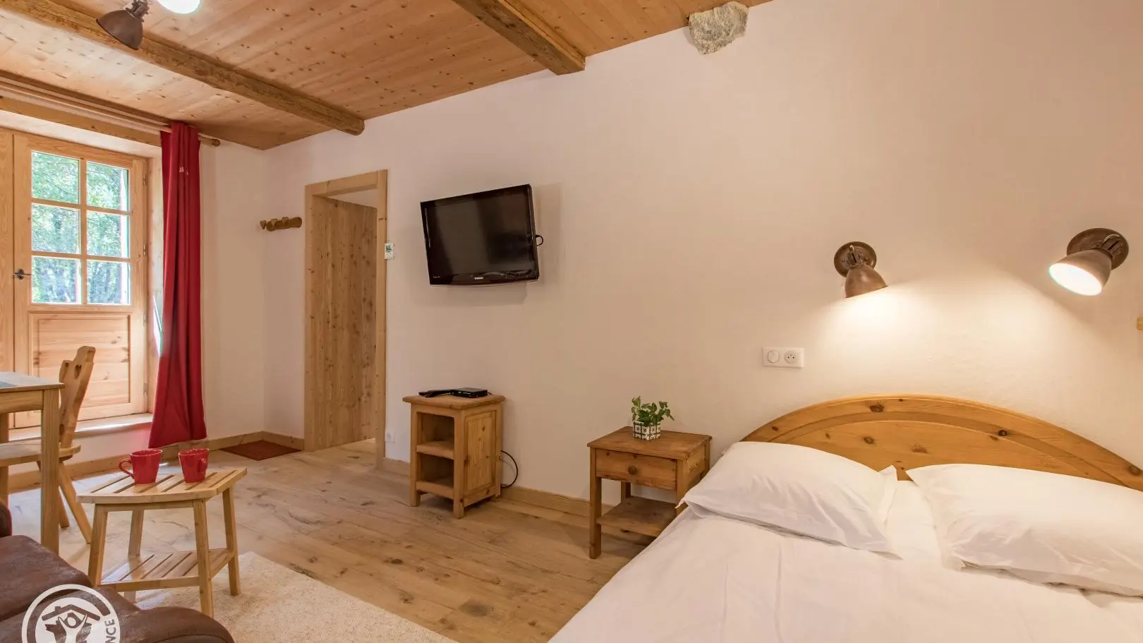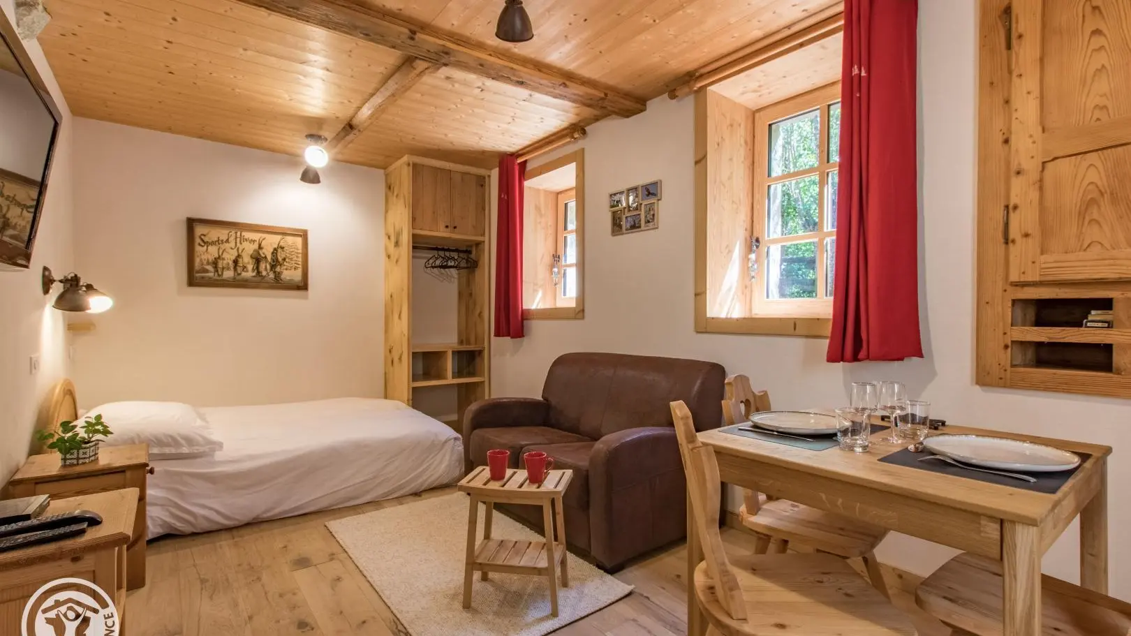 - Living room with sleeping area: dining table, sofa, television, 1 double bed (140x190cm), wardrobe, access to the garden. 1 step between the kitchen and the living room.