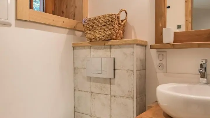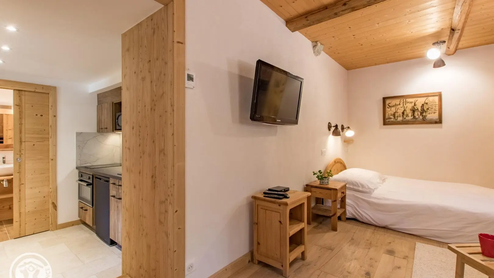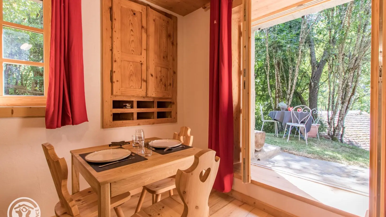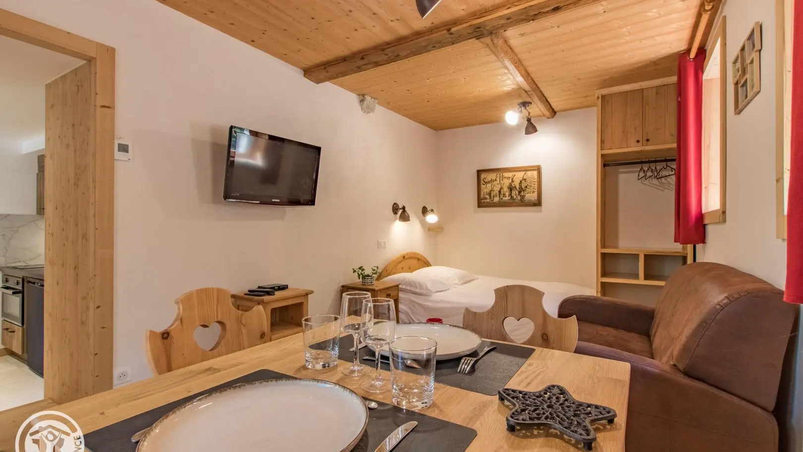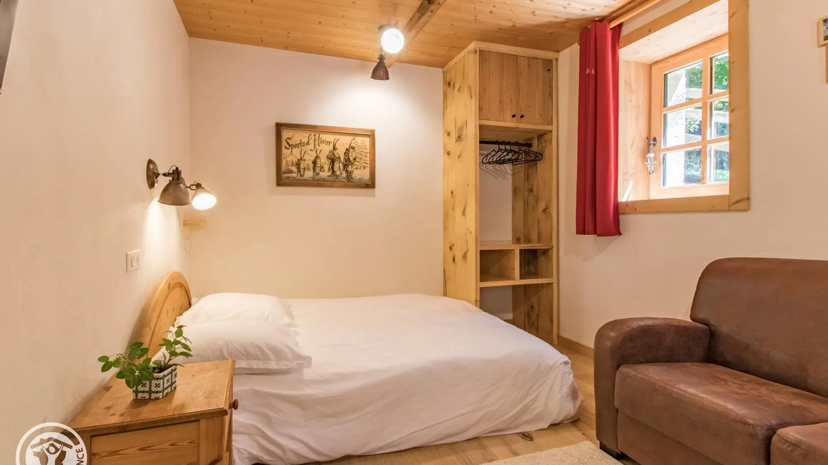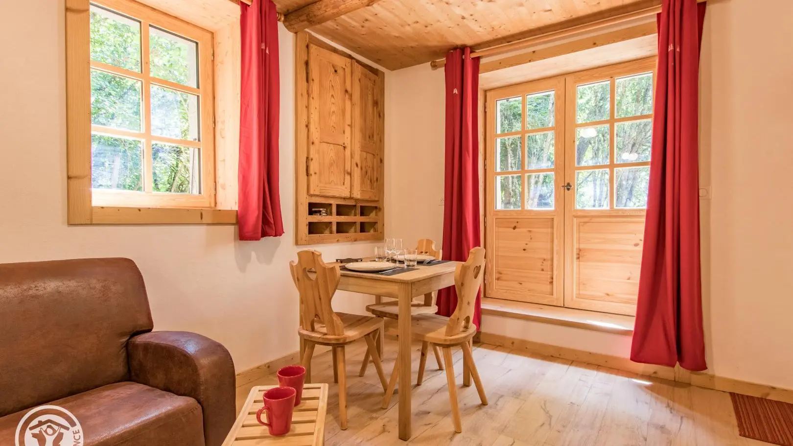 - Living room with sleeping area: dining table, sofa, television, 1 double bed (140x190cm), wardrobe, access to the garden. 1 step between the kitchen and the living room.