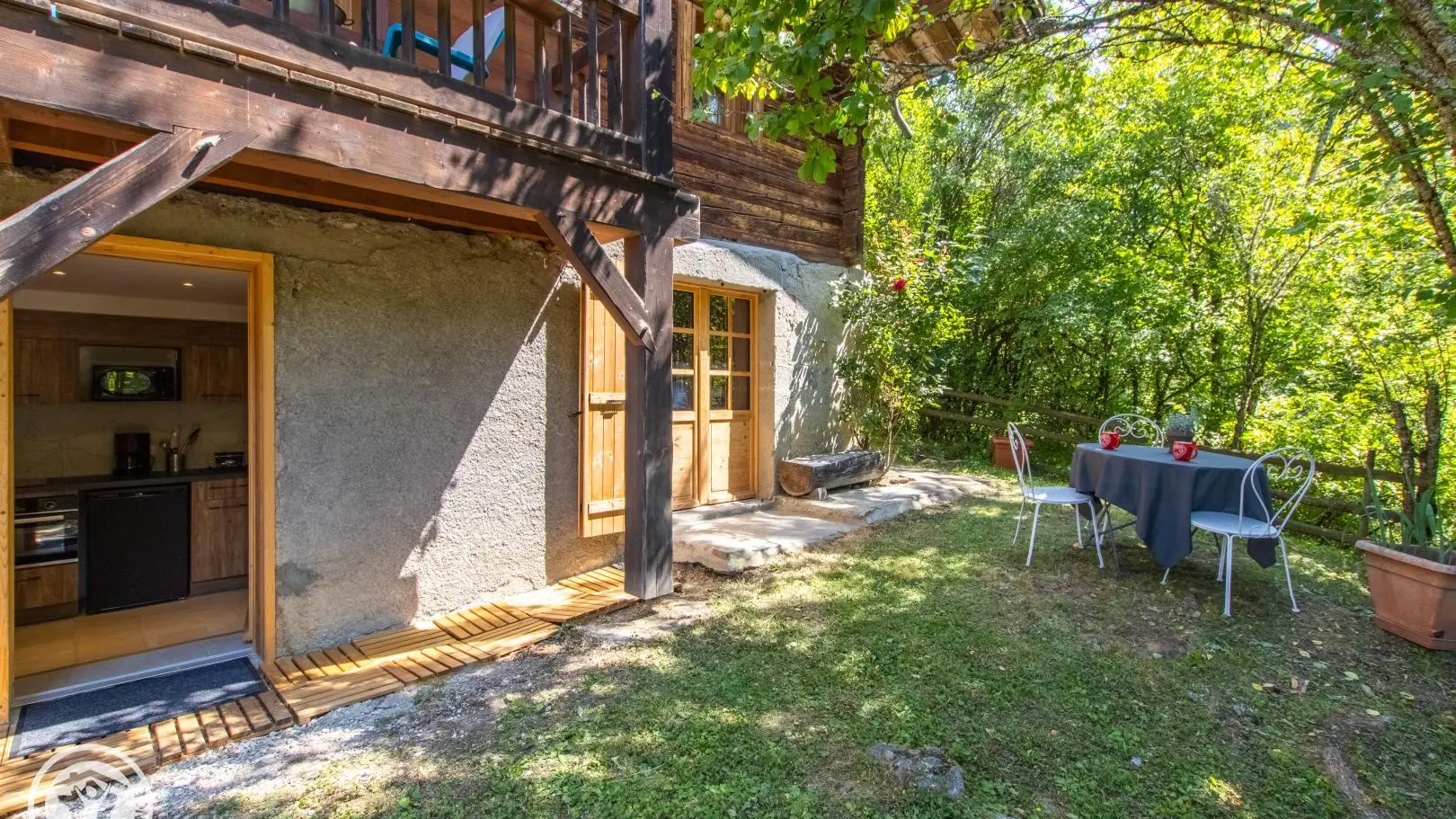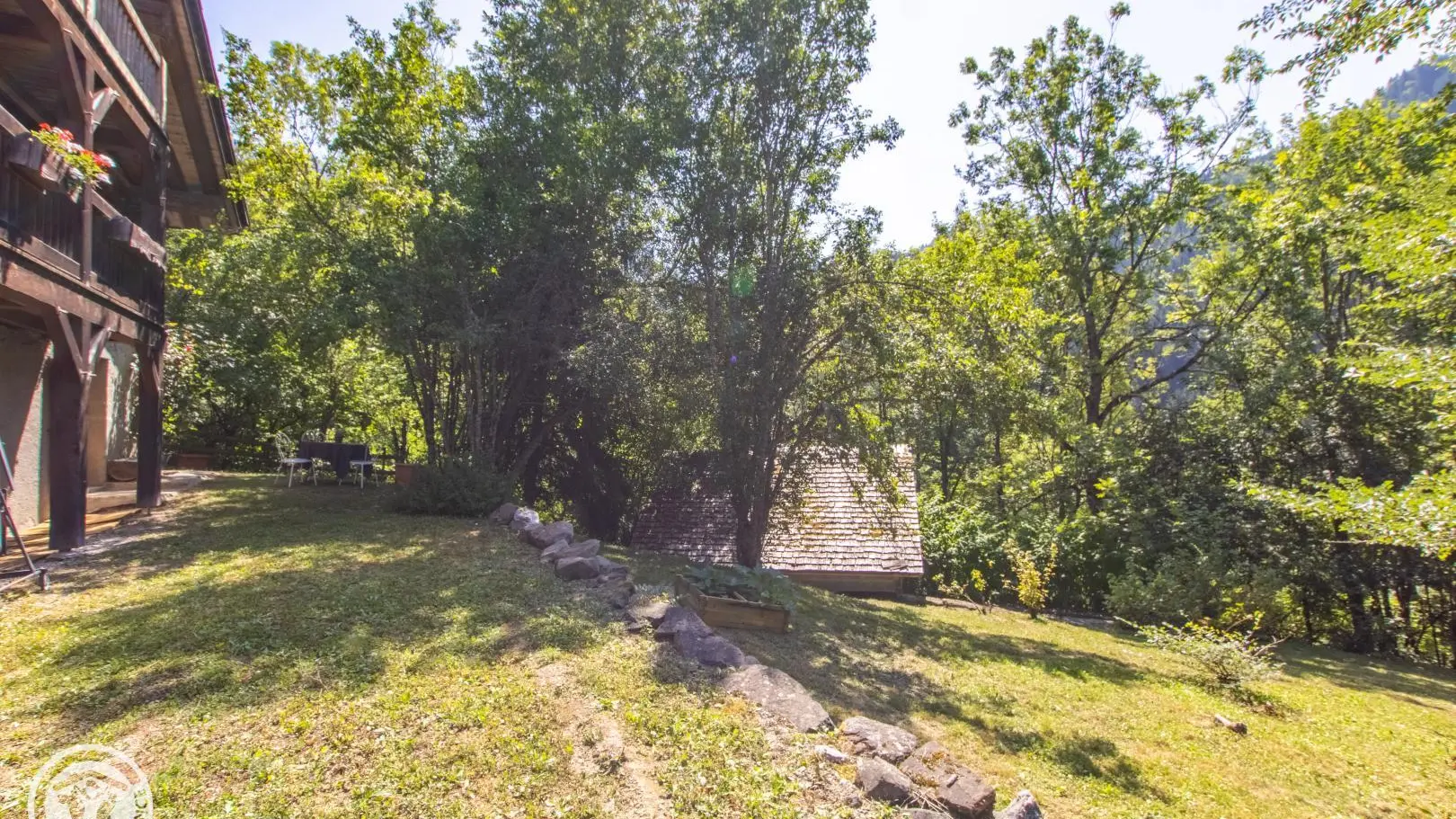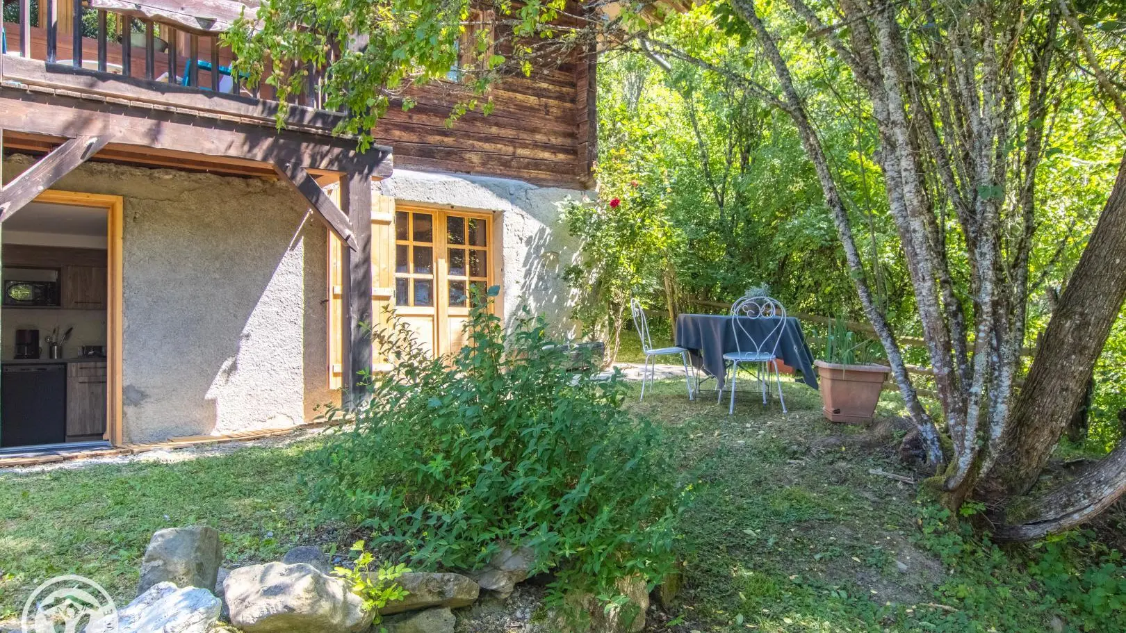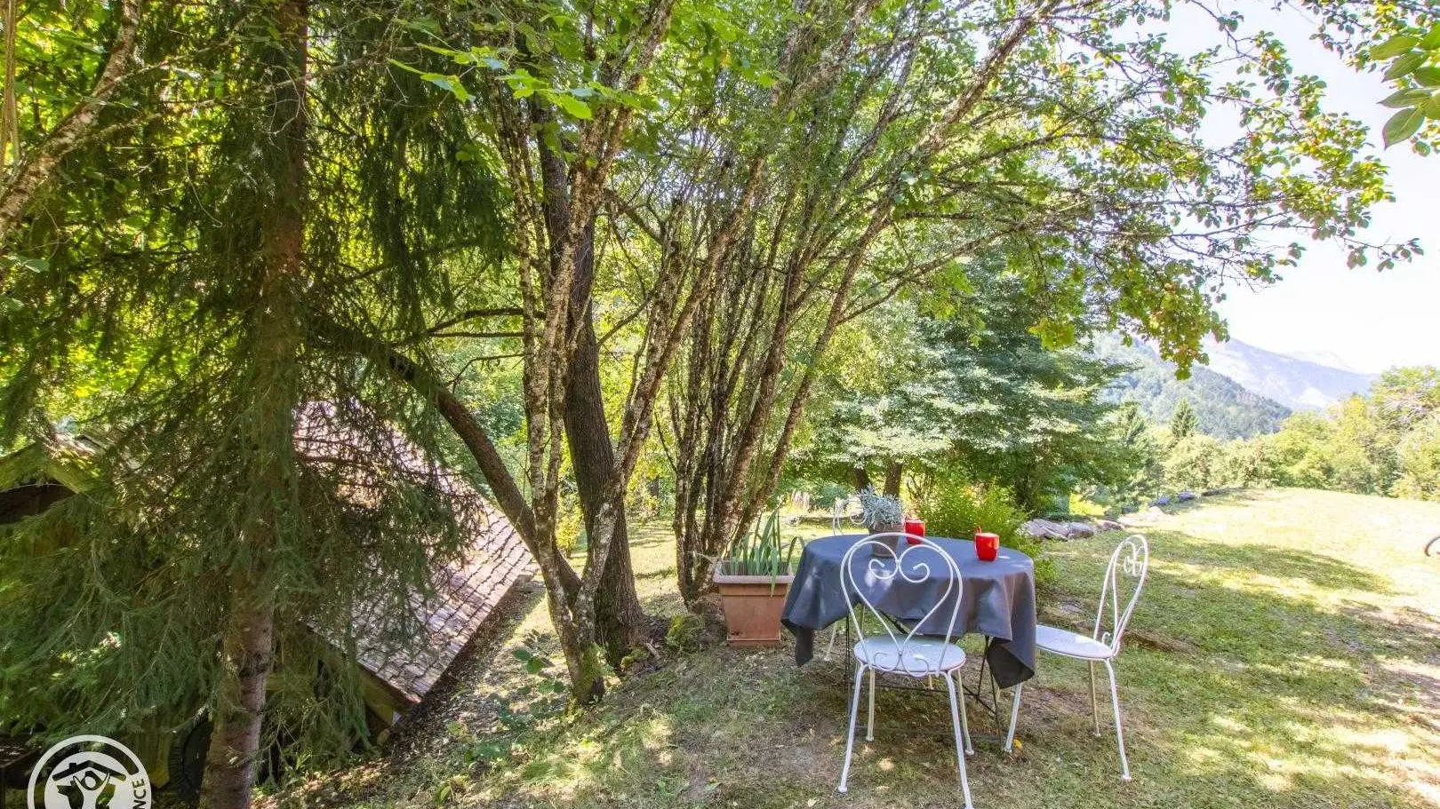 - Shaded garden in front of the gîte with garden furniture and sun loungers. Grounds.