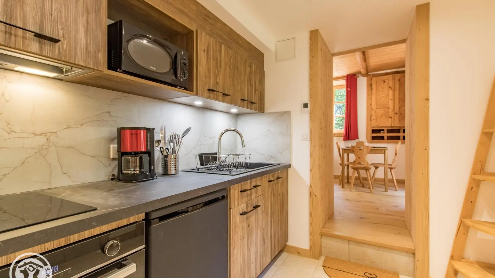 - Equipped kitchen: oven, microwave, sink, refrigerator with freezer compartment, 2 ceramic hobs.
