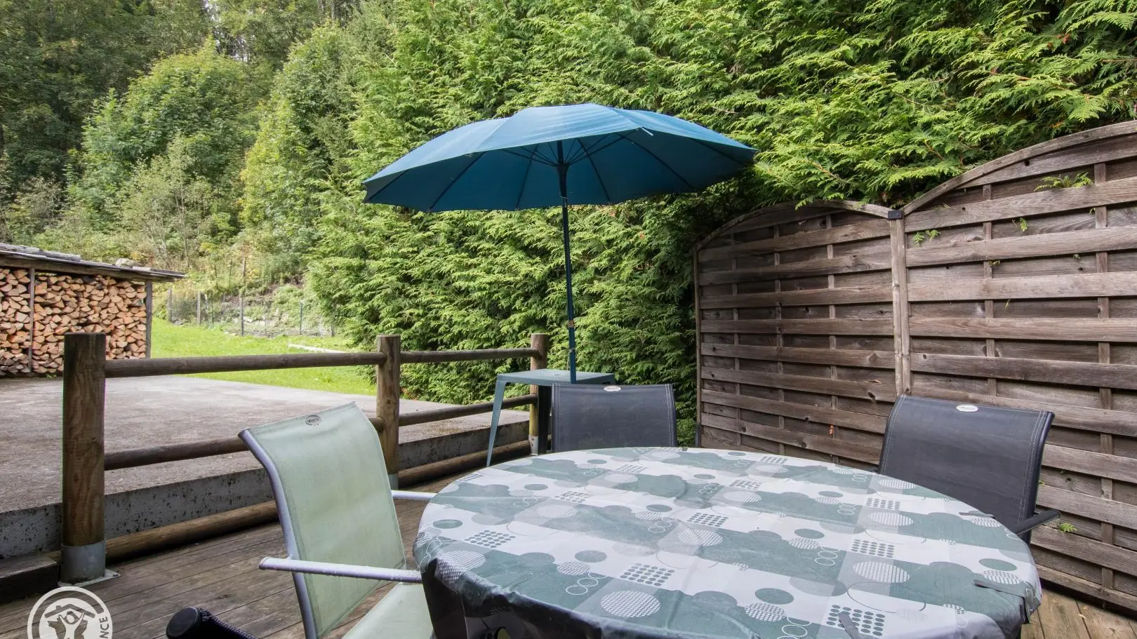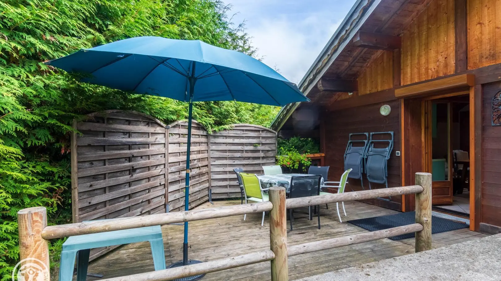 Private terrace accessible from the living room with garden furniture, parasol, deckchairs and electric barbecue.