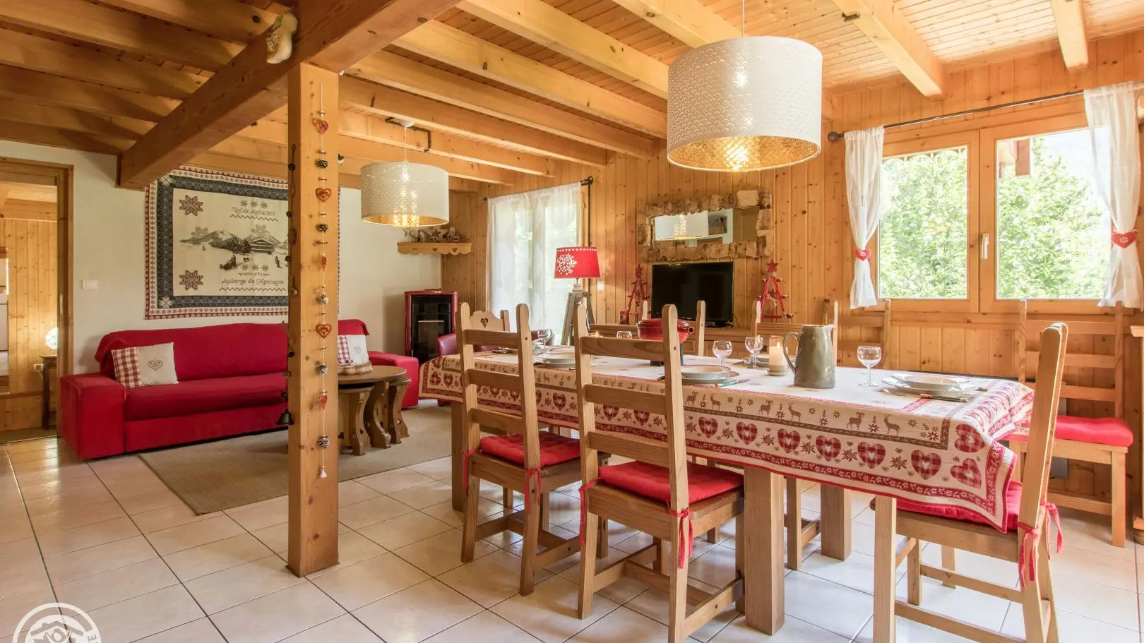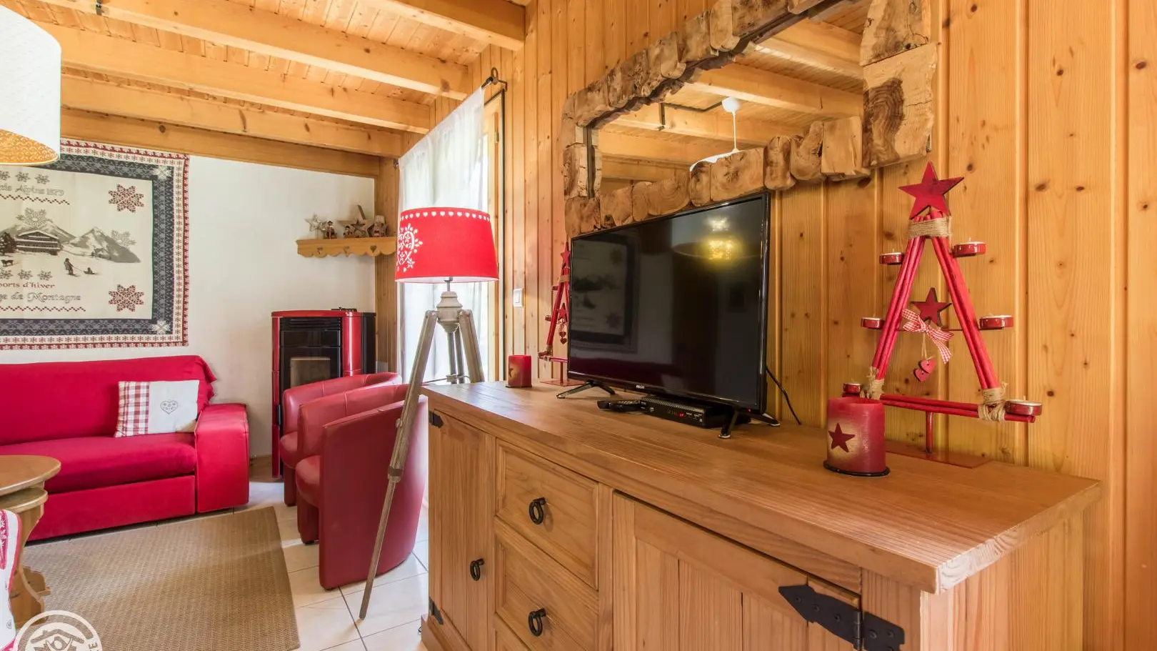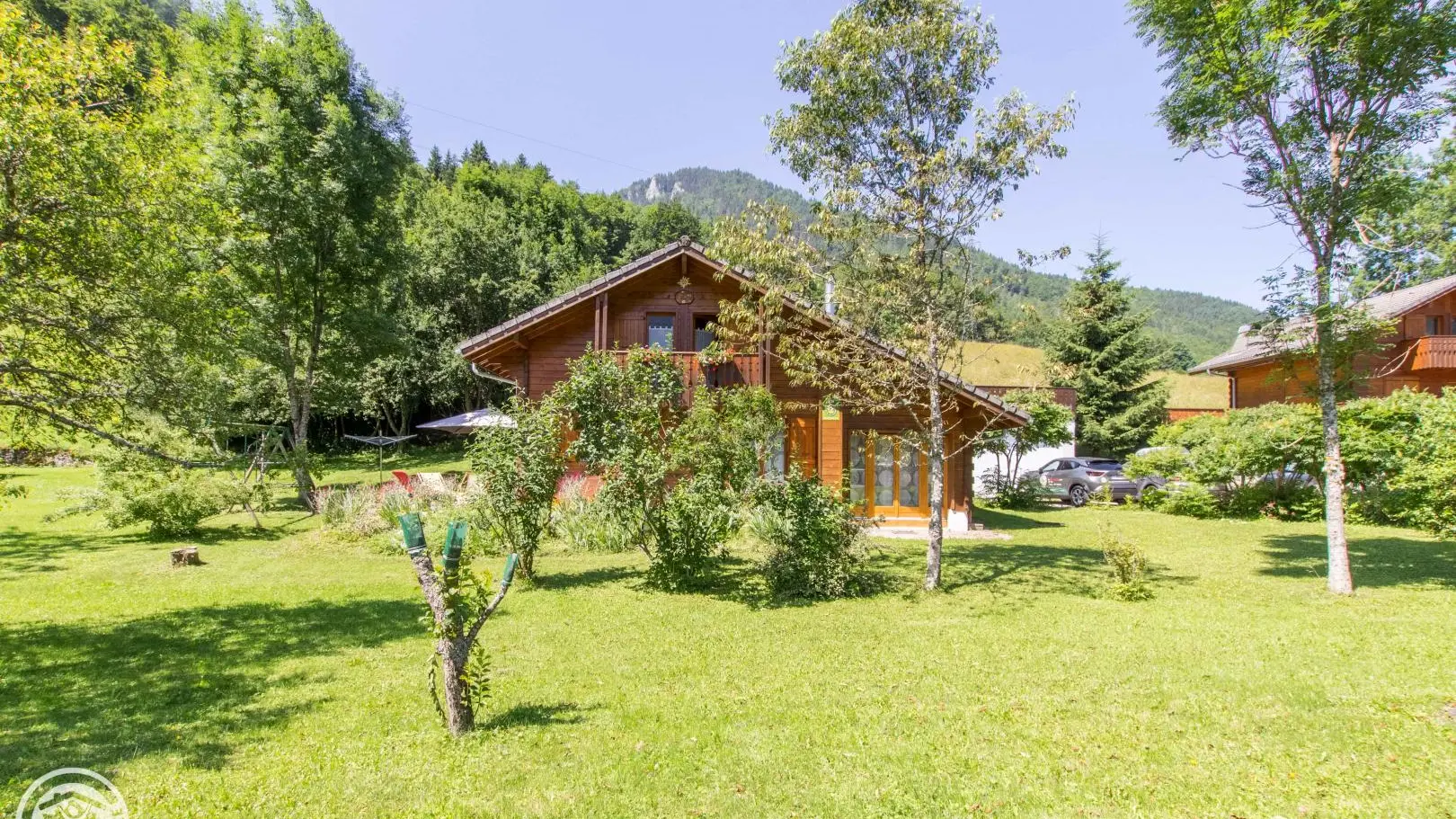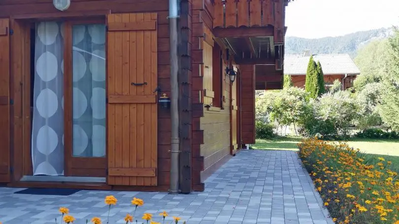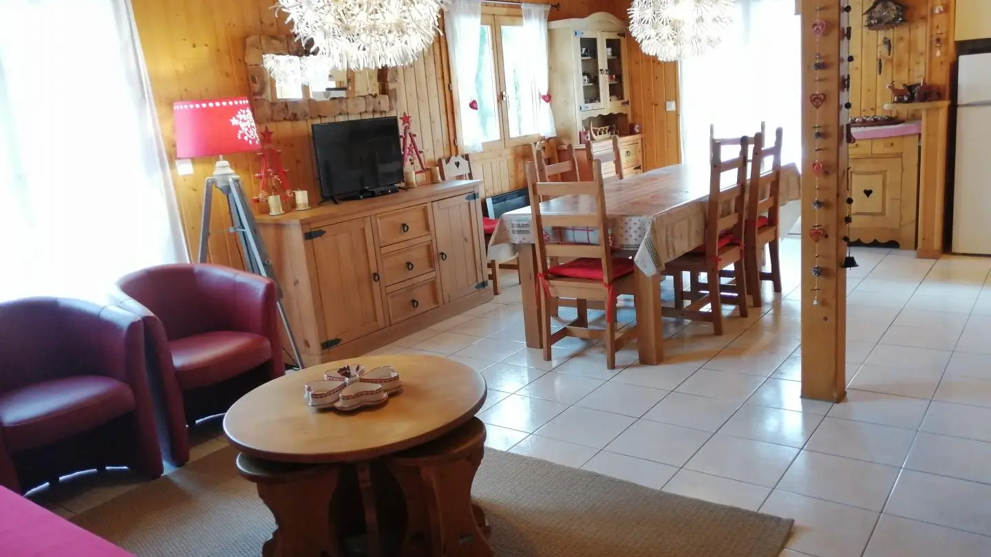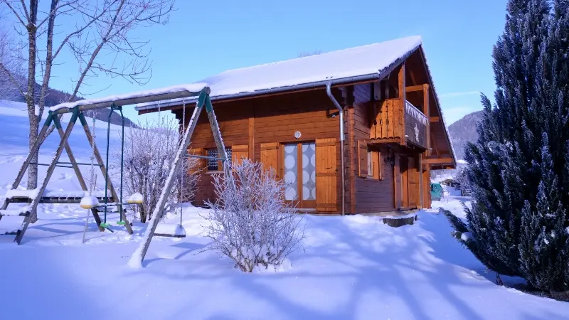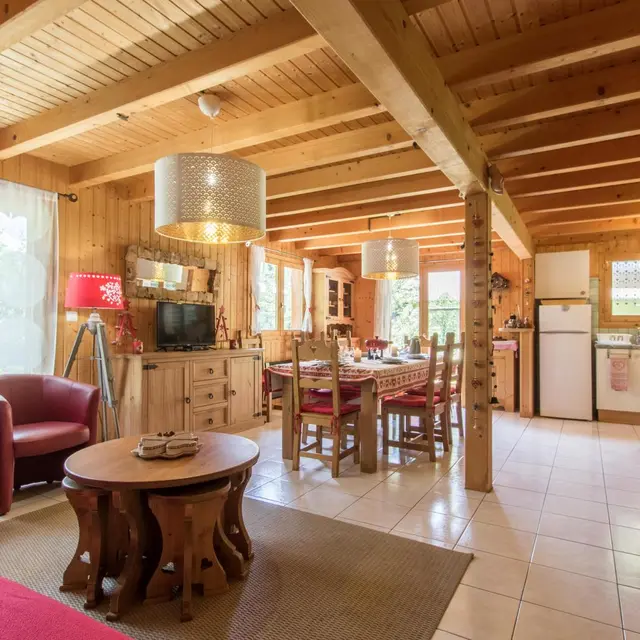 Detached chalet 79m² (+12m² attic) arranged on 2 levels in a wood and mountain atmosphere. Entrance hall with cupboard, fitted kitchen opening onto living-dining room (pellet stove with pellets included, TV, sofa bed). From the living room, French windows open onto the garden and terrace, offering stunning views of the surrounding mountains. Bedroom 1 (1 bed 140x190cm, TV, DVD player, shower room/wc), 1 separate toilet. Storeroom.