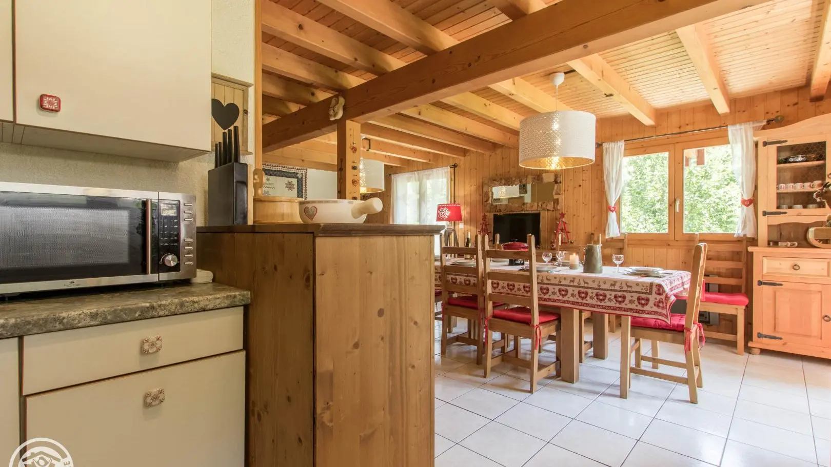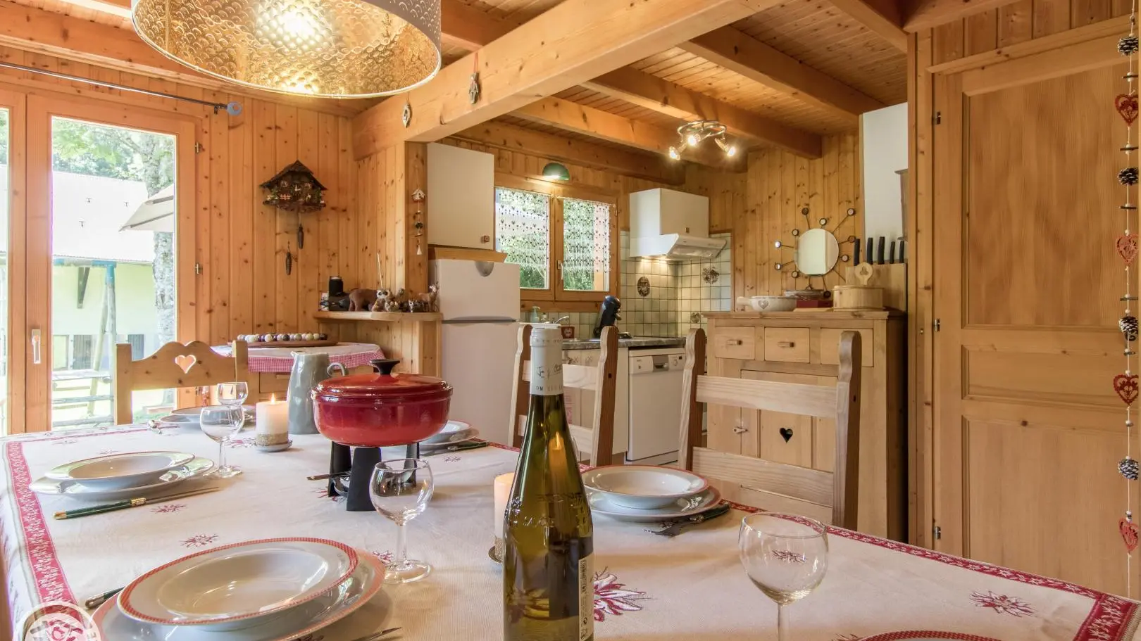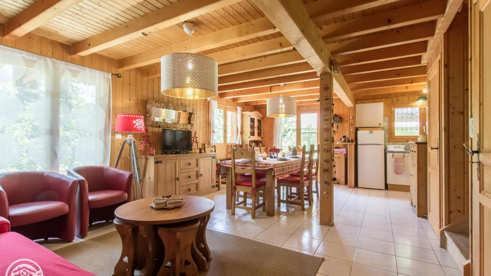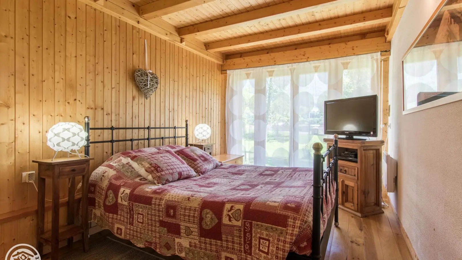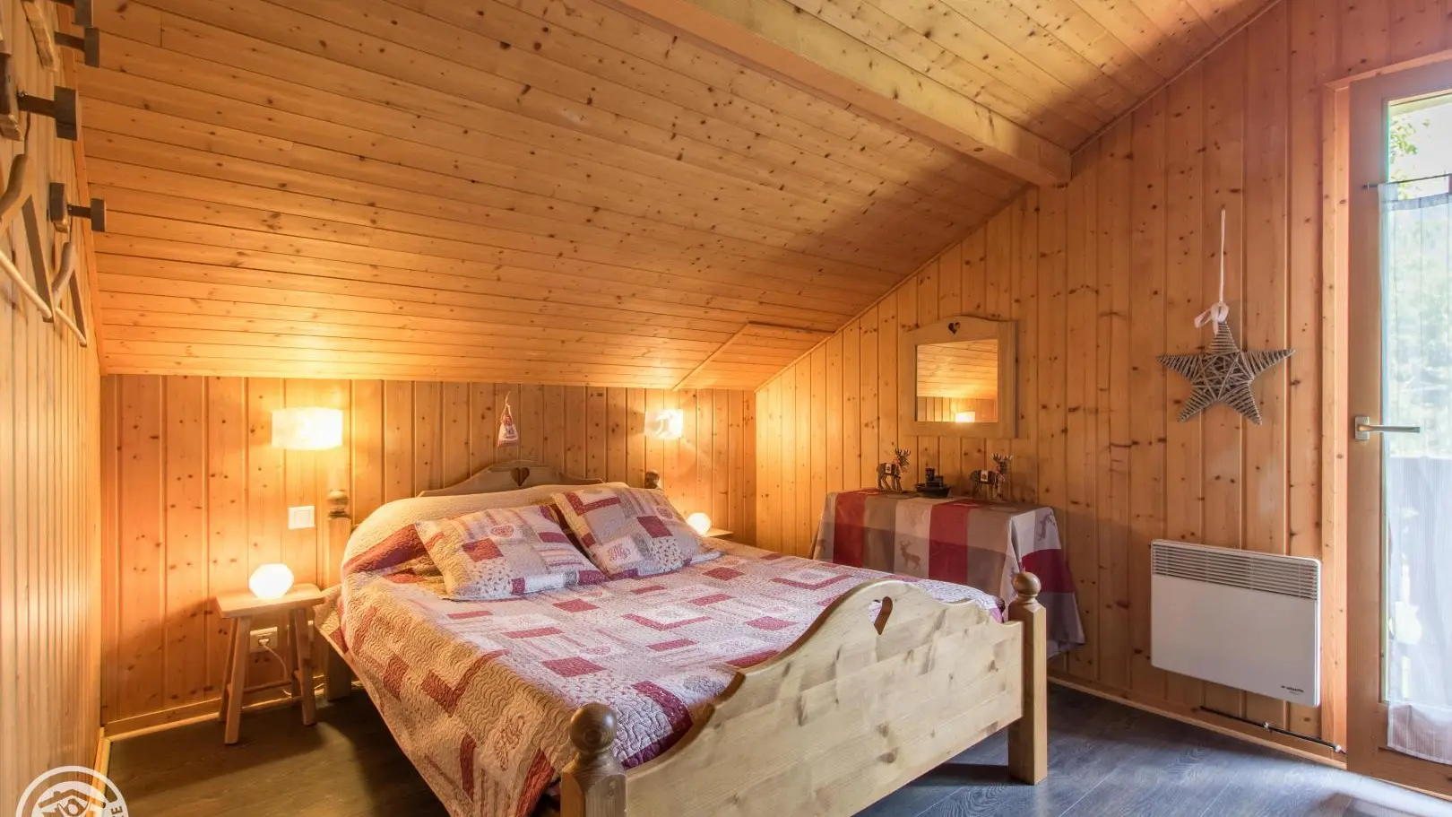 Detached chalet 79m² (+12m² attic) arranged on 2 levels in a wood and mountain atmosphere. Entrance hall with cupboard, fitted kitchen opening onto living-dining room (pellet stove with pellets included, TV, sofa bed). From the living room, French windows open onto the garden and terrace, offering stunning views of the surrounding mountains. Bedroom 1 (1 bed 140x190cm, TV, DVD player, shower room/wc), 1 separate toilet. Storeroom.