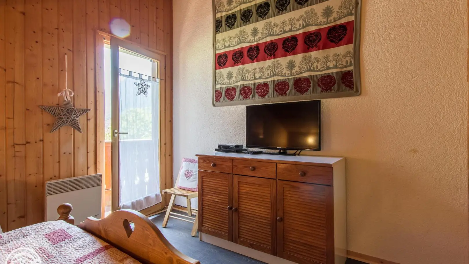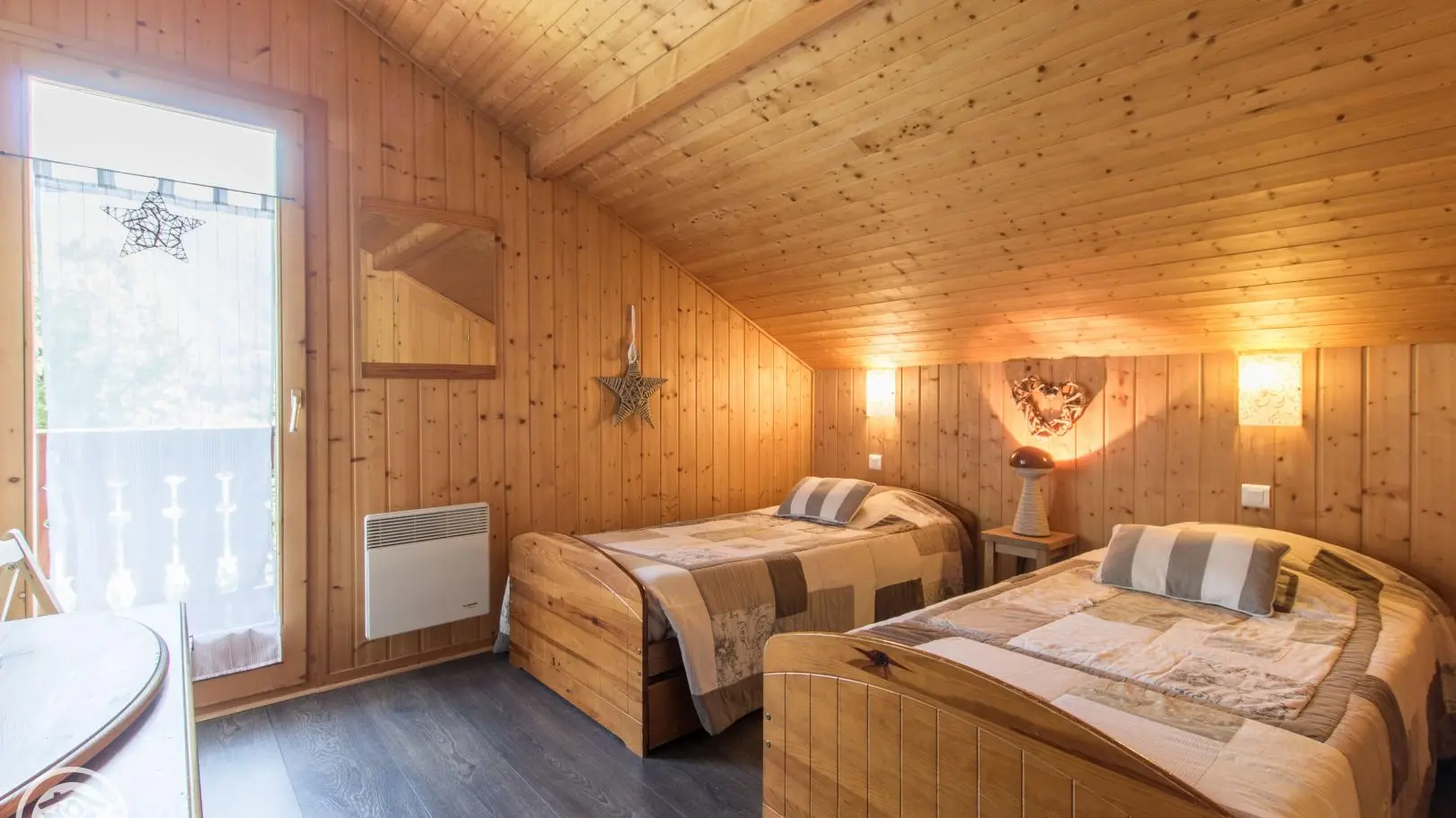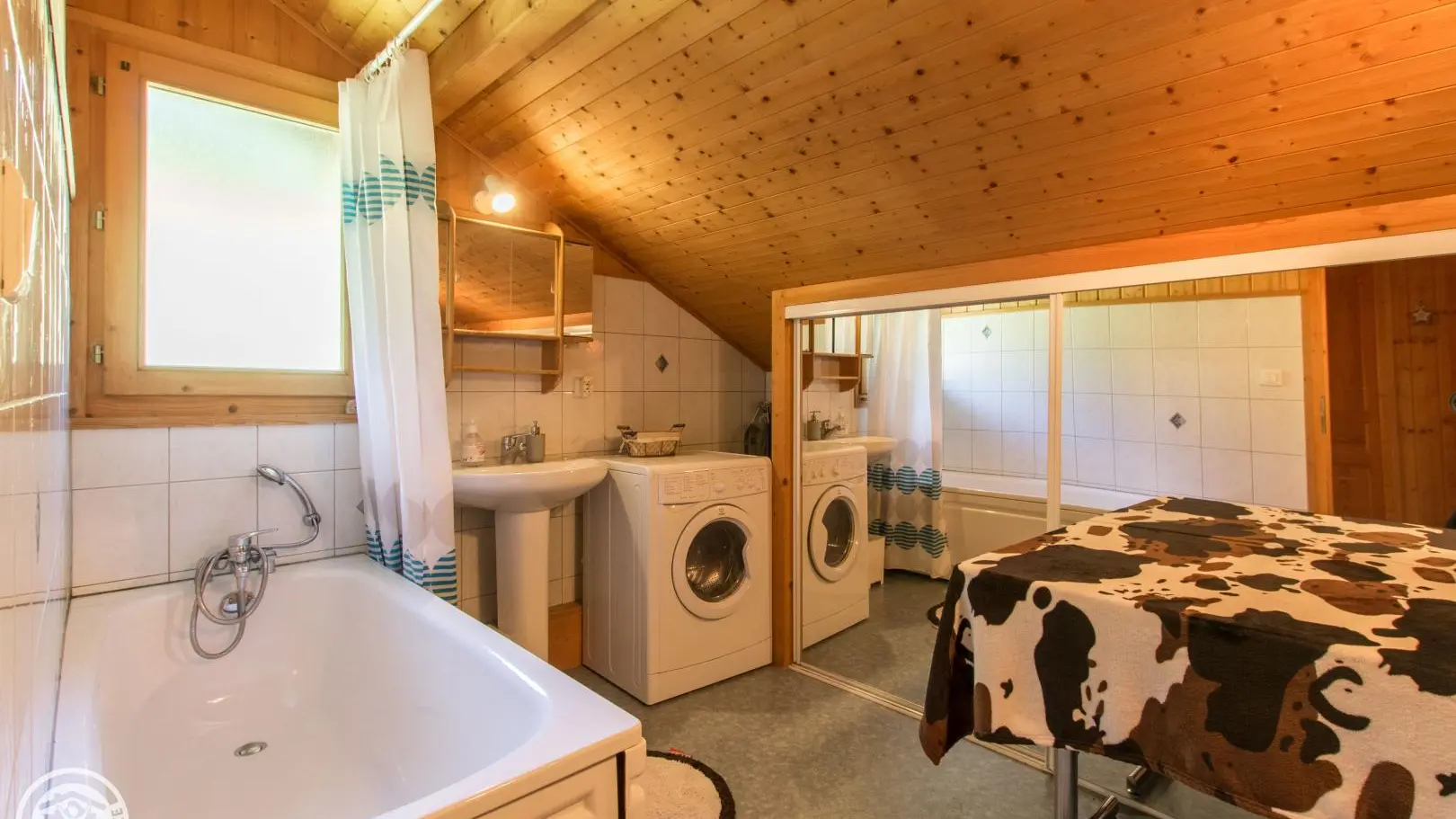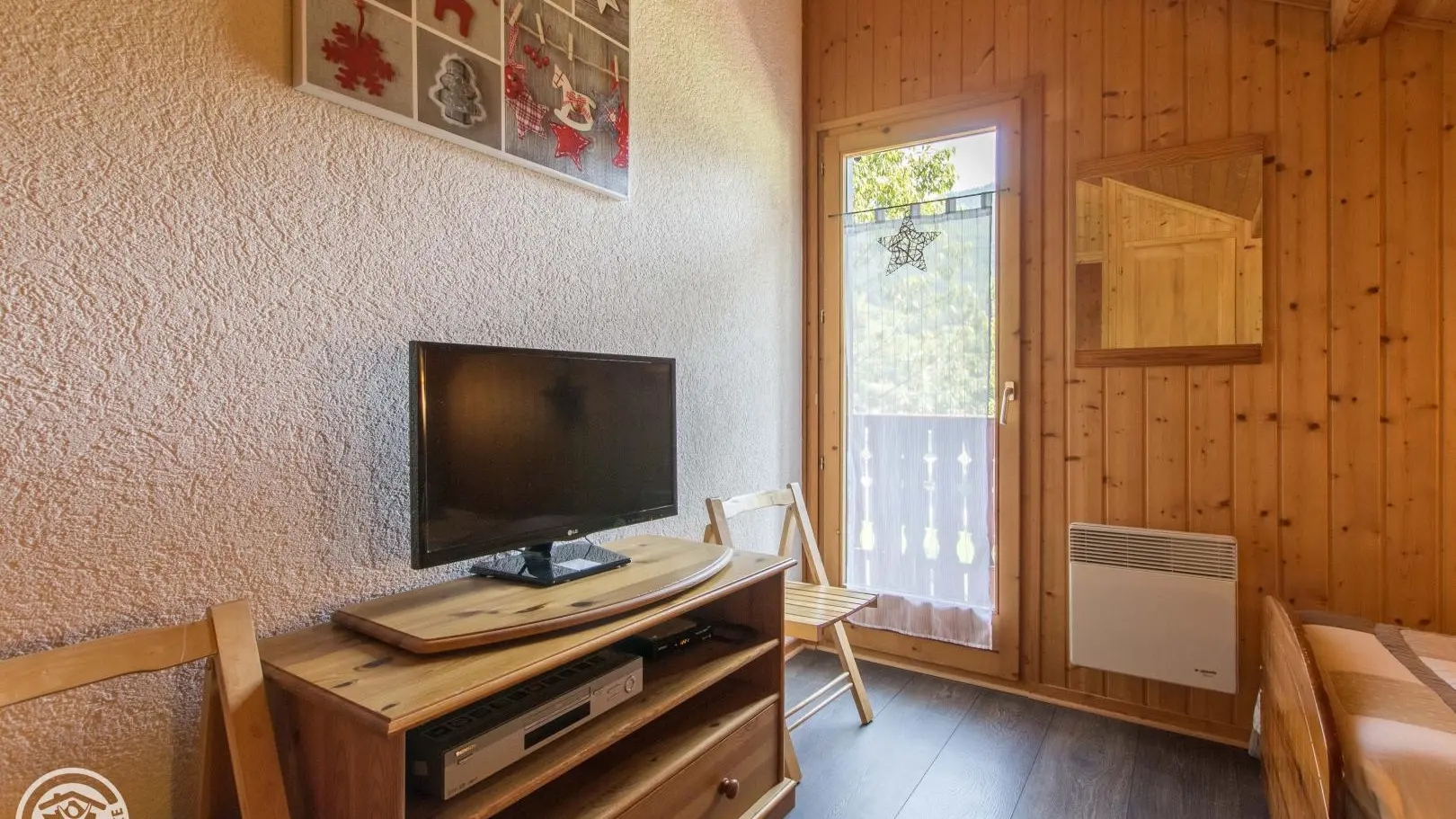 Upstairs: bedroom 2 (1 bed 140x190, TV, balcony access), bedroom 3 (2 beds 90x190cm + trundle beds, TV, balcony access), small bedroom 4 (1 bed 90x190cm + trundle bed 90), bathroom (bath, washer-dryer). Terrace with garden furniture (forest table), deckchairs and barbecue, private garden/terrace and parking. Internet access. Bed linen and towels for hire. Ski locker.