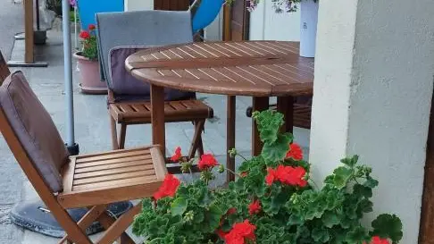 Terrace area offering a beautiful view of the mountains, garden furniture, deckchairs, electric plancha. Common courtyard with parking.