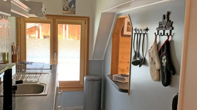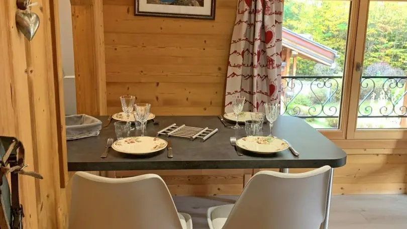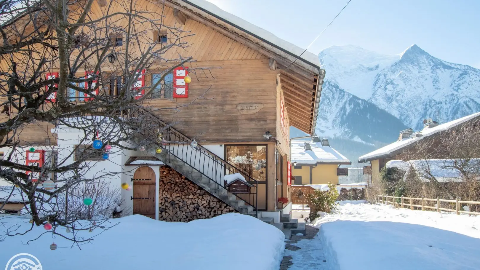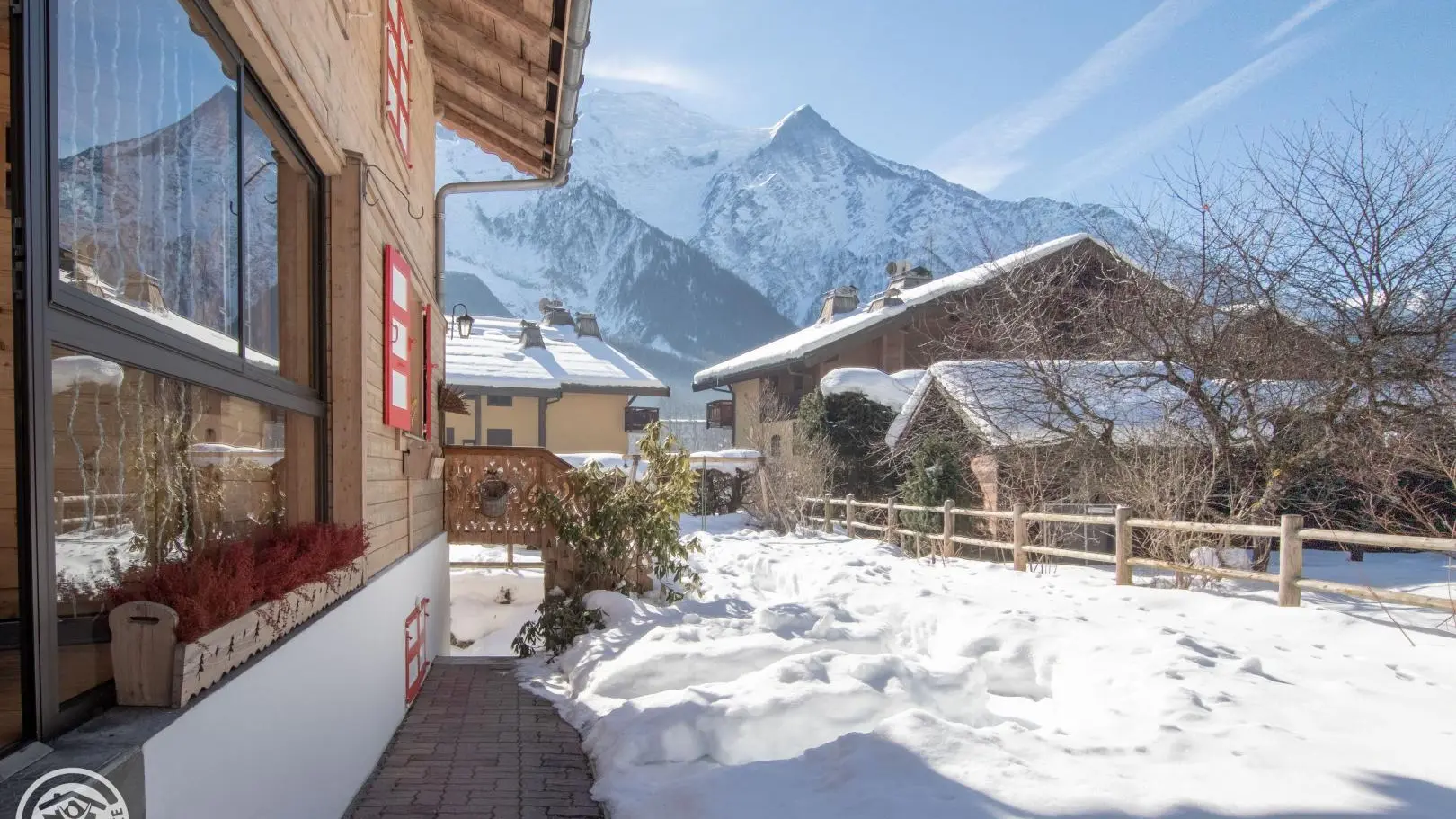 Common entrance for the 2 gites. Small integrated kitchen, living / dining room, Bedroom 1 (1 bed 140 cm), Bedroom 2 (2 beds 90 cm), shower room with WC. Small balcony facing the Mont-Blanc massif, garden, parking. Ski room. Electric heating. Linens provided. Center of Chamonix at 1.5 km, Brévent and Aiguille du Midi cable cars at 1 km, free ski shuttle at 50 m. 10% reduction for 3 consecutive weeks.