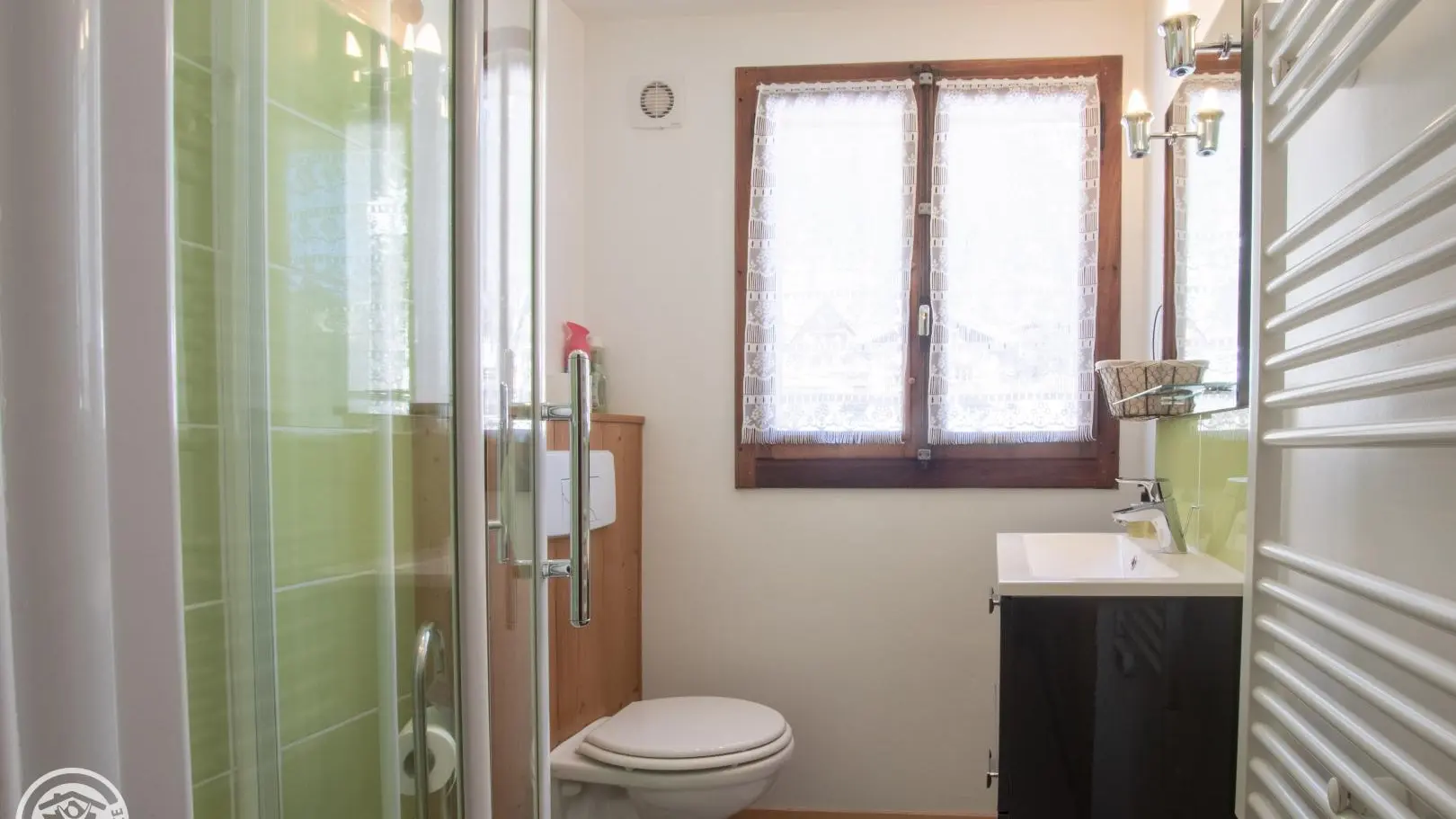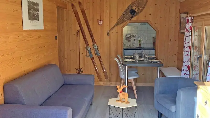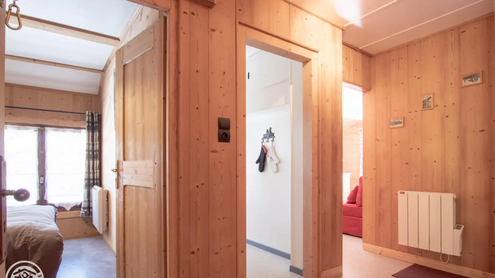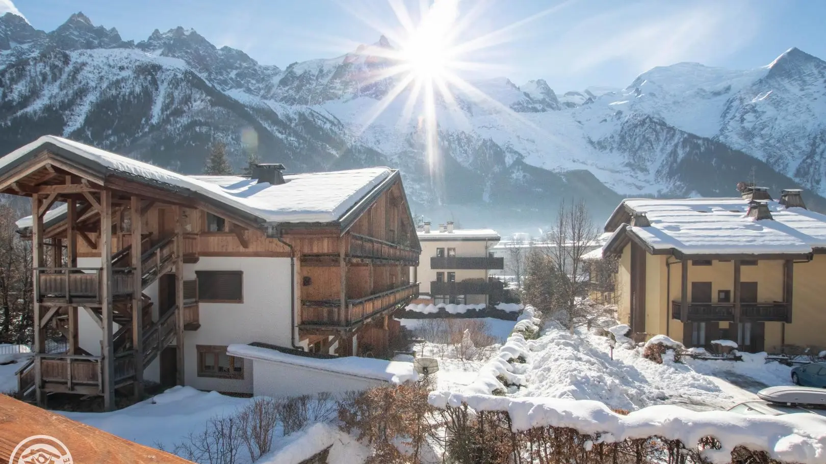 Common entrance for the 2 gites. Small integrated kitchen, living / dining room, Bedroom 1 (1 bed 140 cm), Bedroom 2 (2 beds 90 cm), shower room with WC. Small balcony facing the Mont-Blanc massif, garden, parking. Ski room. Electric heating. Linens provided. Center of Chamonix at 1.5 km, Brévent and Aiguille du Midi cable cars at 1 km, free ski shuttle at 50 m. 10% reduction for 3 consecutive weeks.