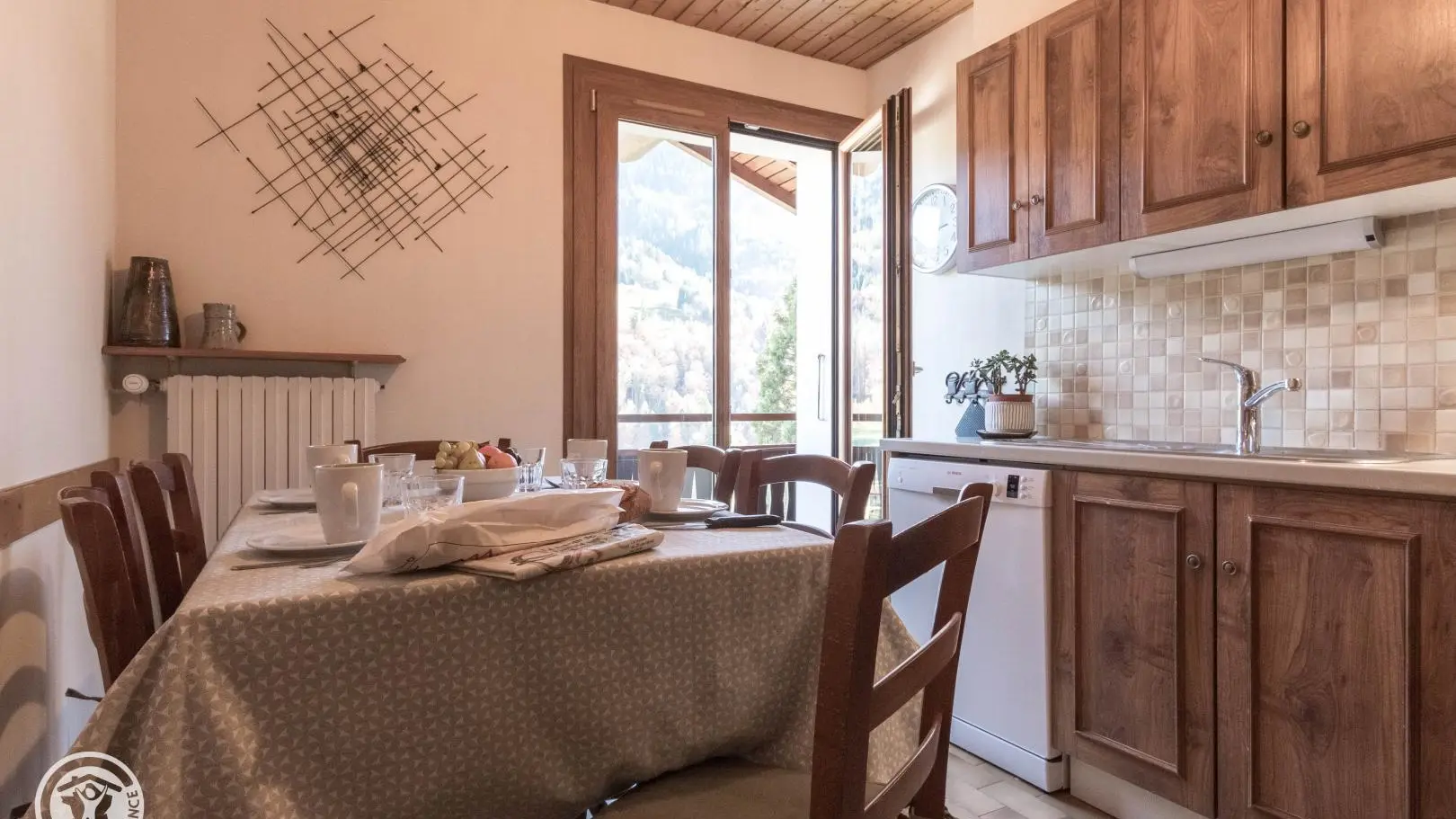 House comprising 2 gîtes et owner's home at heart of Les Aravis, with panoramic views of surrounding mountains. 1st floor gîte (64 sq. m.+ 15 sq.m attic): separate kitchen, living room (80cm stowaway sofa bed, TV, DVD), 3 bedrooms (beds: 2 double, 2 single, 1 cot), bathroom (washing machine), WC. Central heating. Balcony, garden with terrace (children's games). Parking, ski locker et baby equipment available. For hire: bed et household linen. House located above the access route to Les Aravis ski resorts. Bus (not free) 100m. Ski resorts: La Clusaz, Le Grand-Bornand 6km. Lac d'Annecy 18km,. Supermarket 1km, Thônes (many events et sporting activities) 5km.