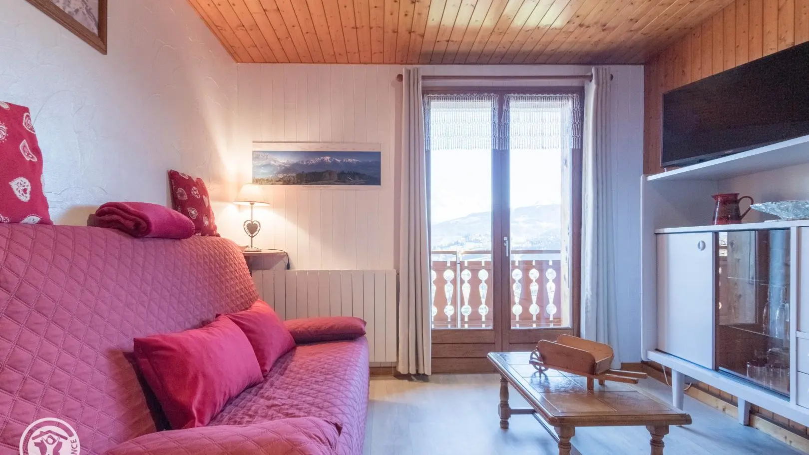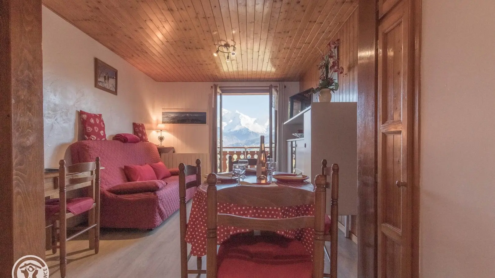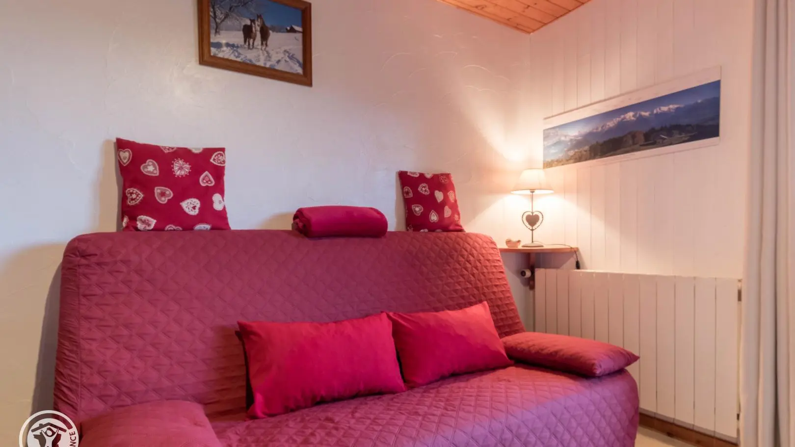 Opposite Alpine peaks et the entire Mont-Blanc range, house comprising 2 gîtes et owners' home. Gîte 2 (36m2) on ground floor (4 steps). Kitchen/living room (microwave, double sofabed), 1 bedroom (2 single beds). Central heating. Shower room, WC. Shared washing m/c, shared terrace, barbecue, garden furniture, courtyard, garden. Ski resorts: Cordon 2km, Megève 7km. Shuttle 1km. Many hiking/riding tracks from the doorstep.
