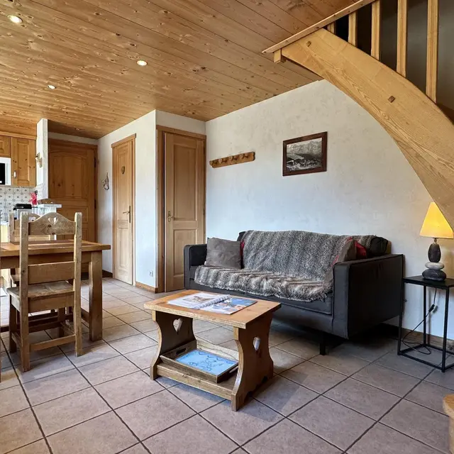 With panoramic view of mountains (Les Aravis, La Tournette), new chalet comprising owners' home et a lovely gîte (53m2) on 2 levels. Ground floor: kitchen opening onto living room, WC. 1st floor: attic bedroom 1 (double bed), attic bedroom 2 (double bed), alcove/small bedroom (2 bunk beds), shower room/WC. For hire : bed linen. Central heating. Terrace, garden, garden furniture, barbecue, parking. Available (no extra charge): heated ski locker at foot of cable-cars. Ski lifts 1.5km, cross-country skiing 1km. Village centre et all activities 800m.