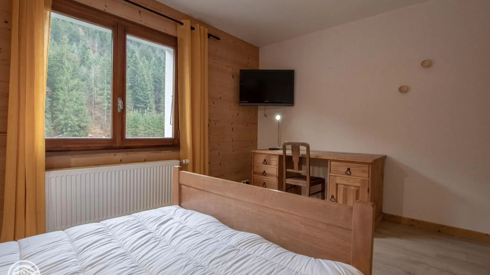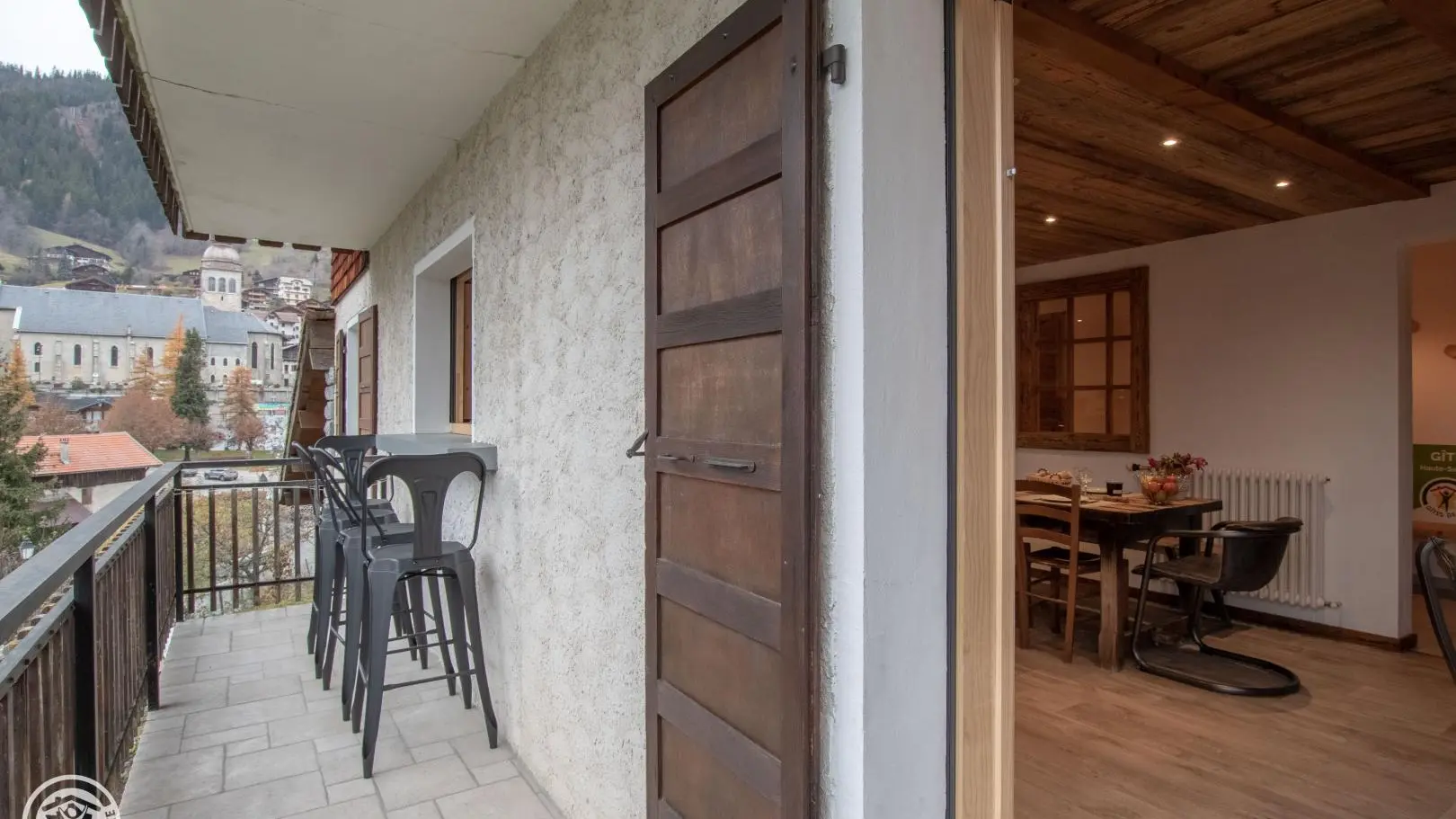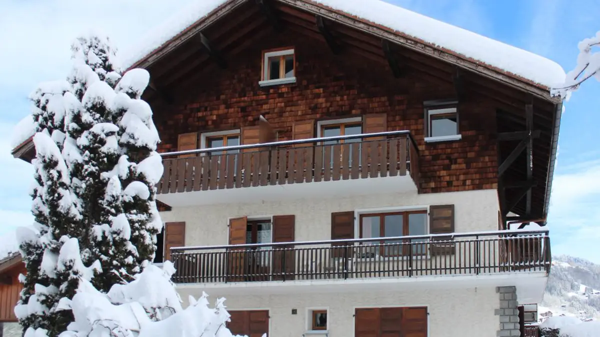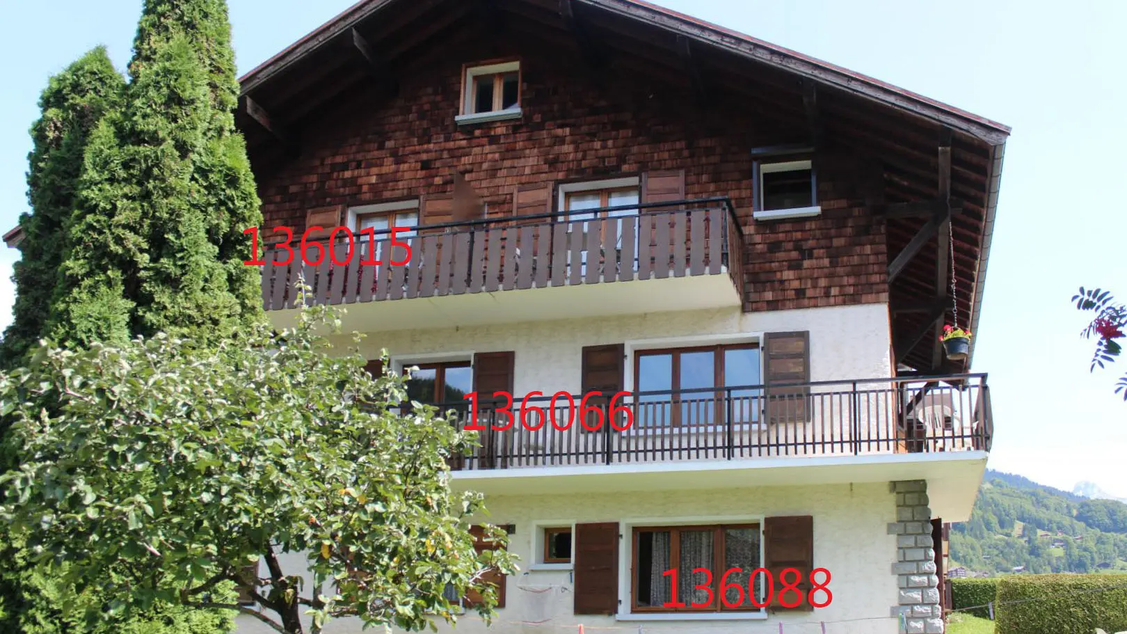 House comprising 4 gîtes. Gîte 2 (83m2) on 1st floor: kitchen, living room, 3 bedrooms (beds: 2 double, 2 single), bathroom, WC, shared washing m/c et tumble-drier. Central heating. Balcony, shared garden. For hire: bed et household linen. Le Grand-Bornand ski resort 500m, cross-country skiing 200m. Free Ski-bus.