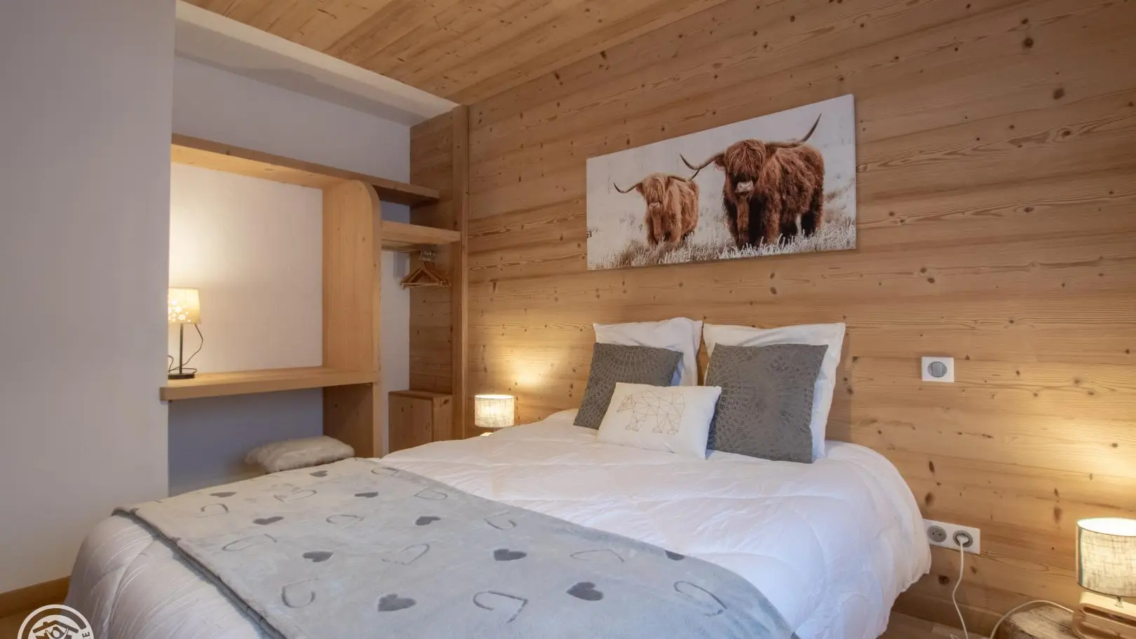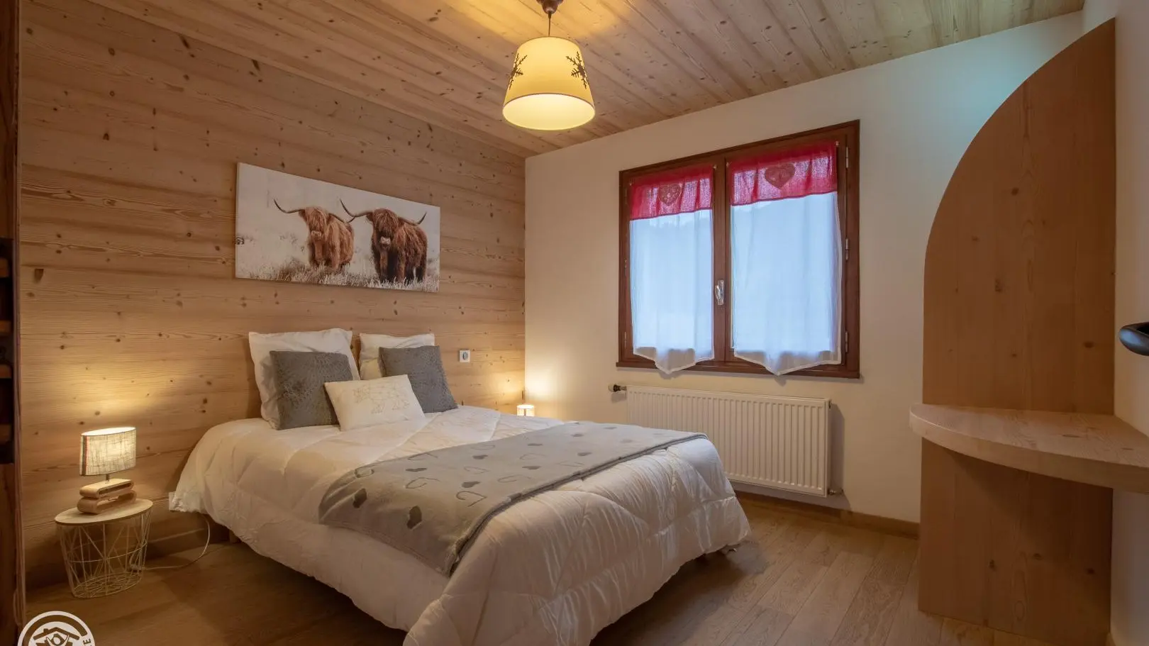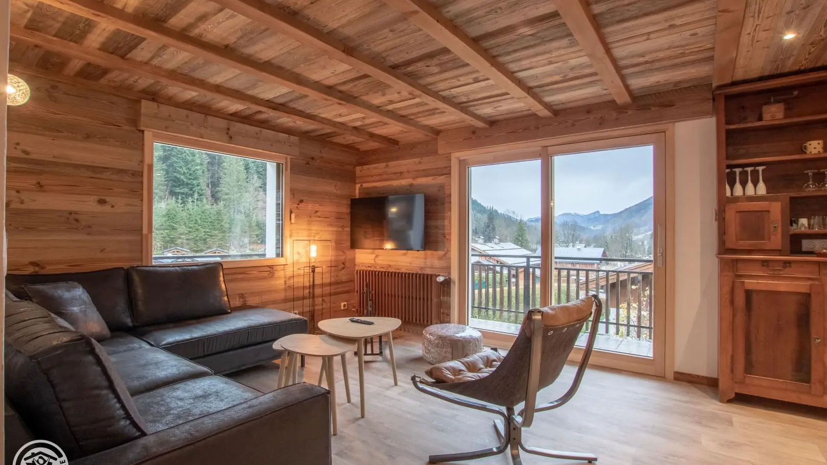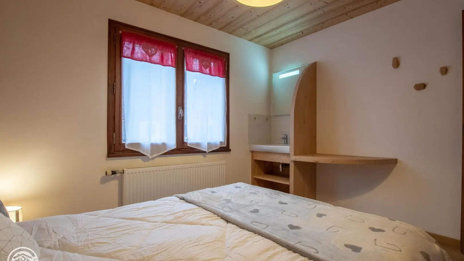 House comprising 4 gîtes. Gîte 2 (83m2) on 1st floor: kitchen, living room, 3 bedrooms (beds: 2 double, 2 single), bathroom, WC, shared washing m/c et tumble-drier. Central heating. Balcony, shared garden. For hire: bed et household linen. Le Grand-Bornand ski resort 500m, cross-country skiing 200m. Free Ski-bus.
