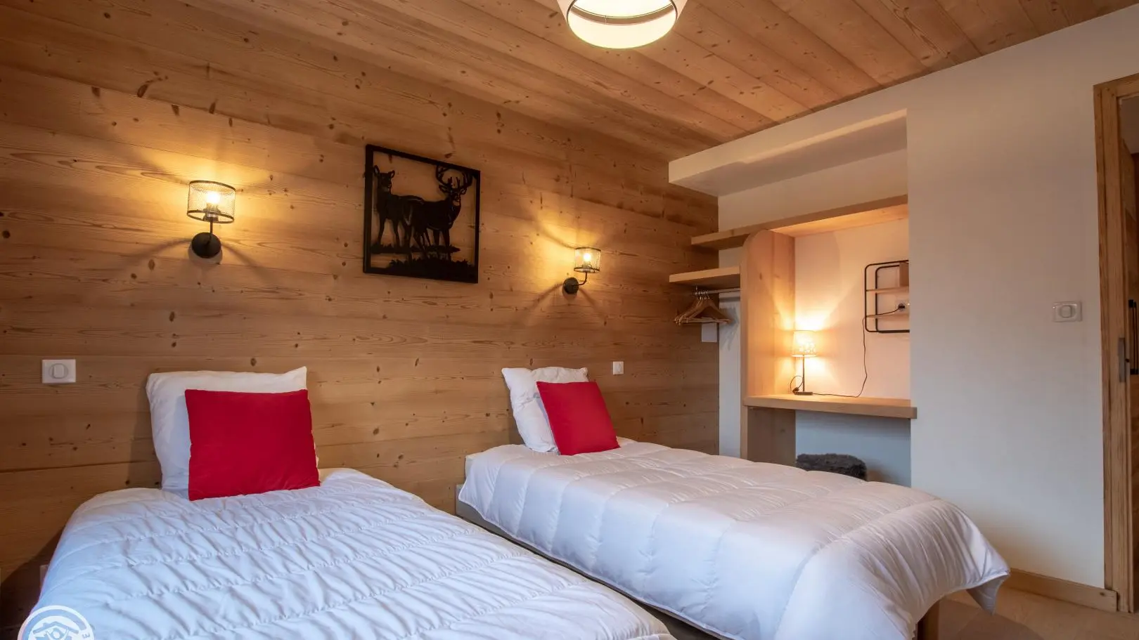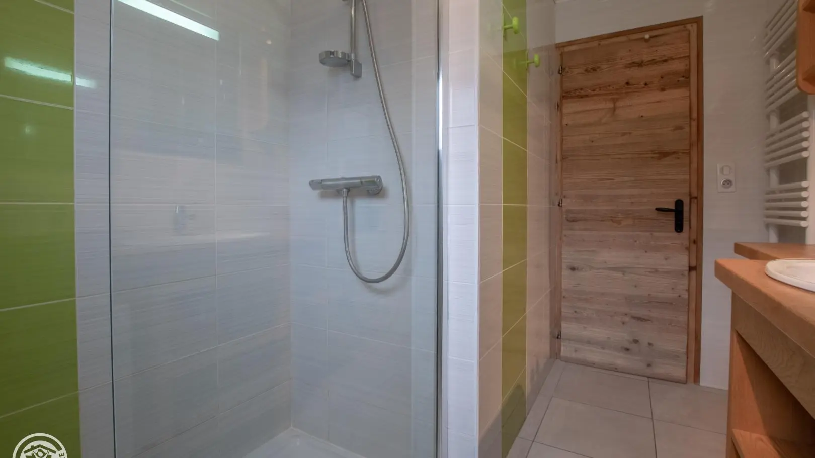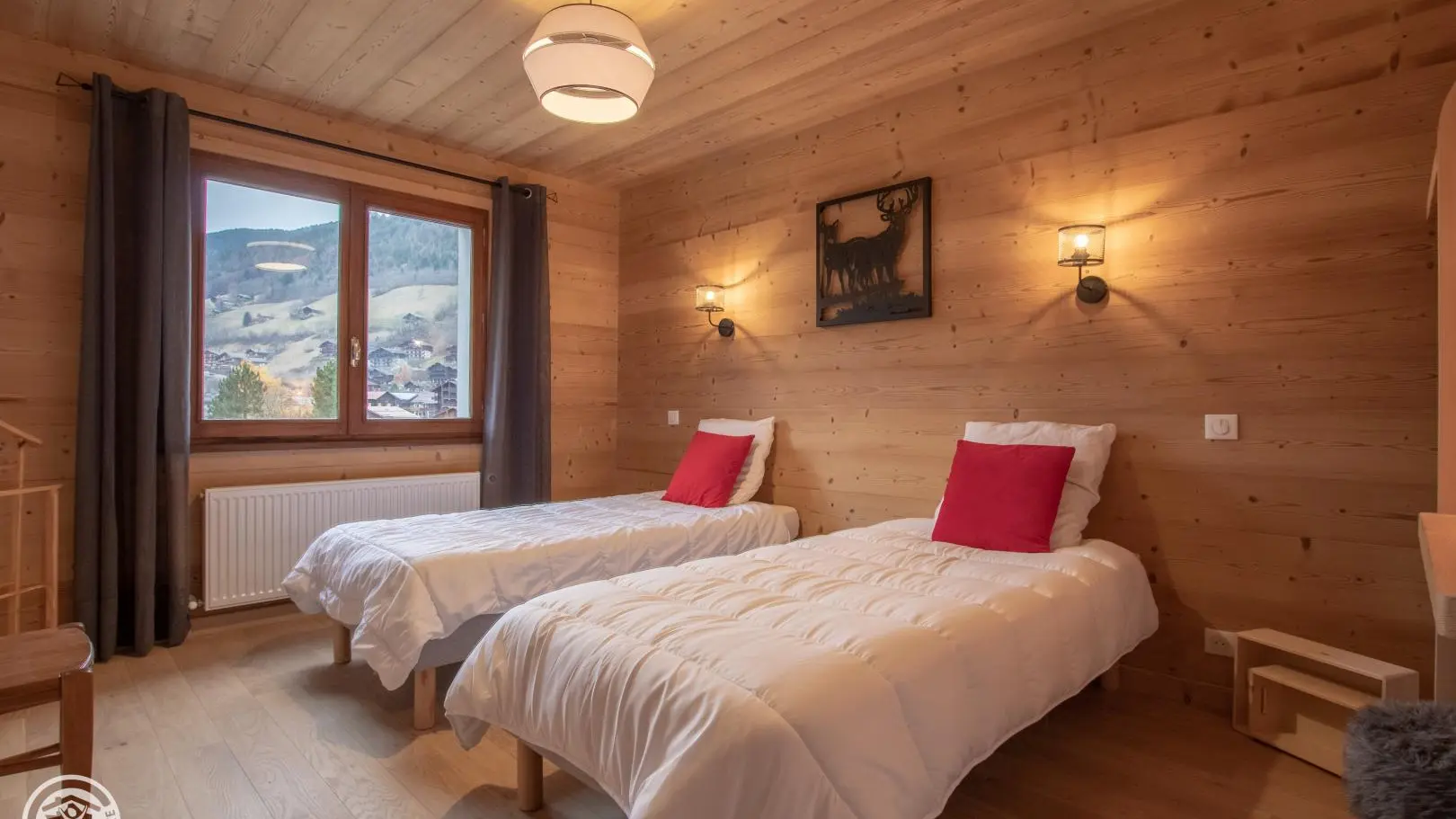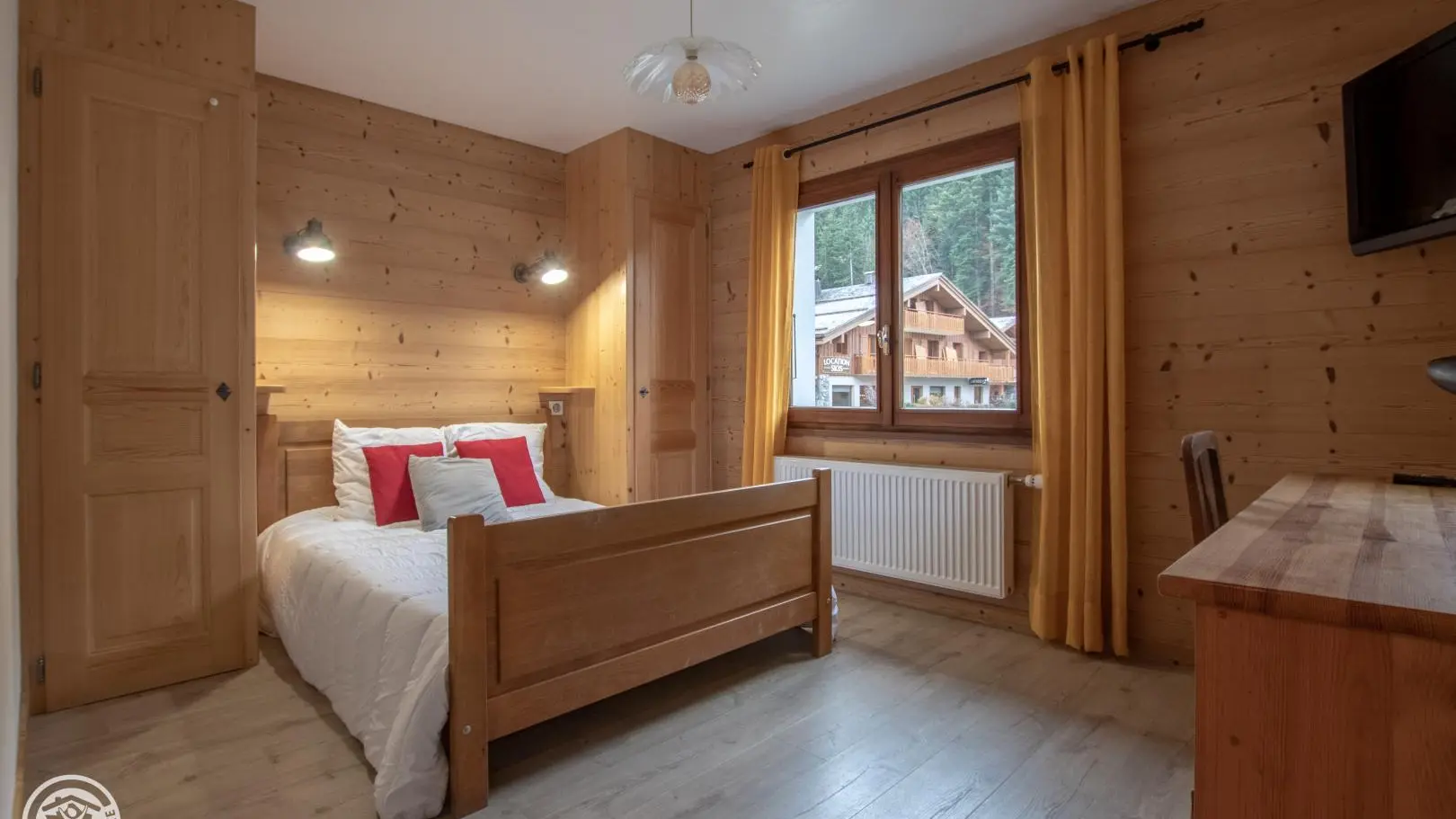 House comprising 4 gîtes. Gîte 2 (83m2) on 1st floor: kitchen, living room, 3 bedrooms (beds: 2 double, 2 single), bathroom, WC, shared washing m/c et tumble-drier. Central heating. Balcony, shared garden. For hire: bed et household linen. Le Grand-Bornand ski resort 500m, cross-country skiing 200m. Free Ski-bus.