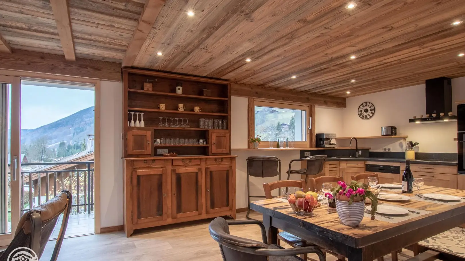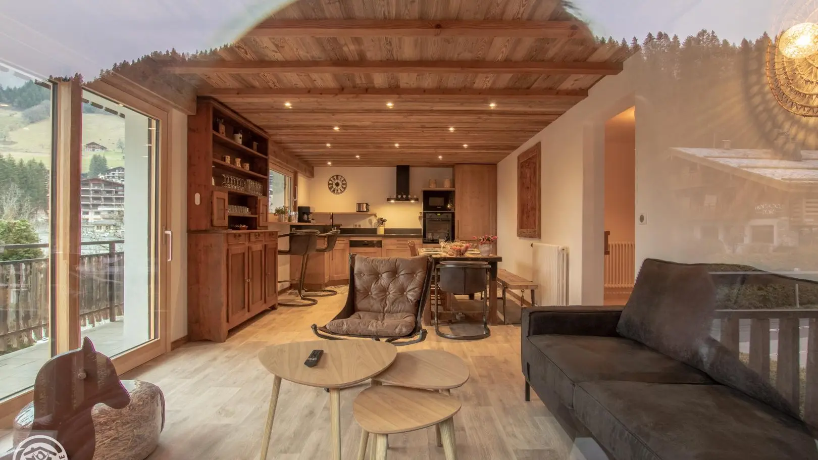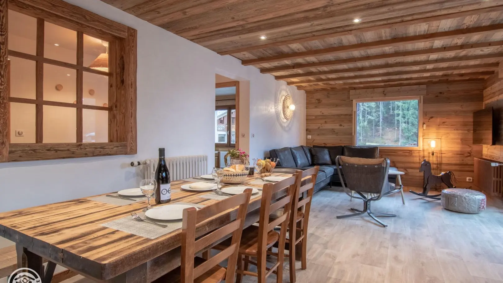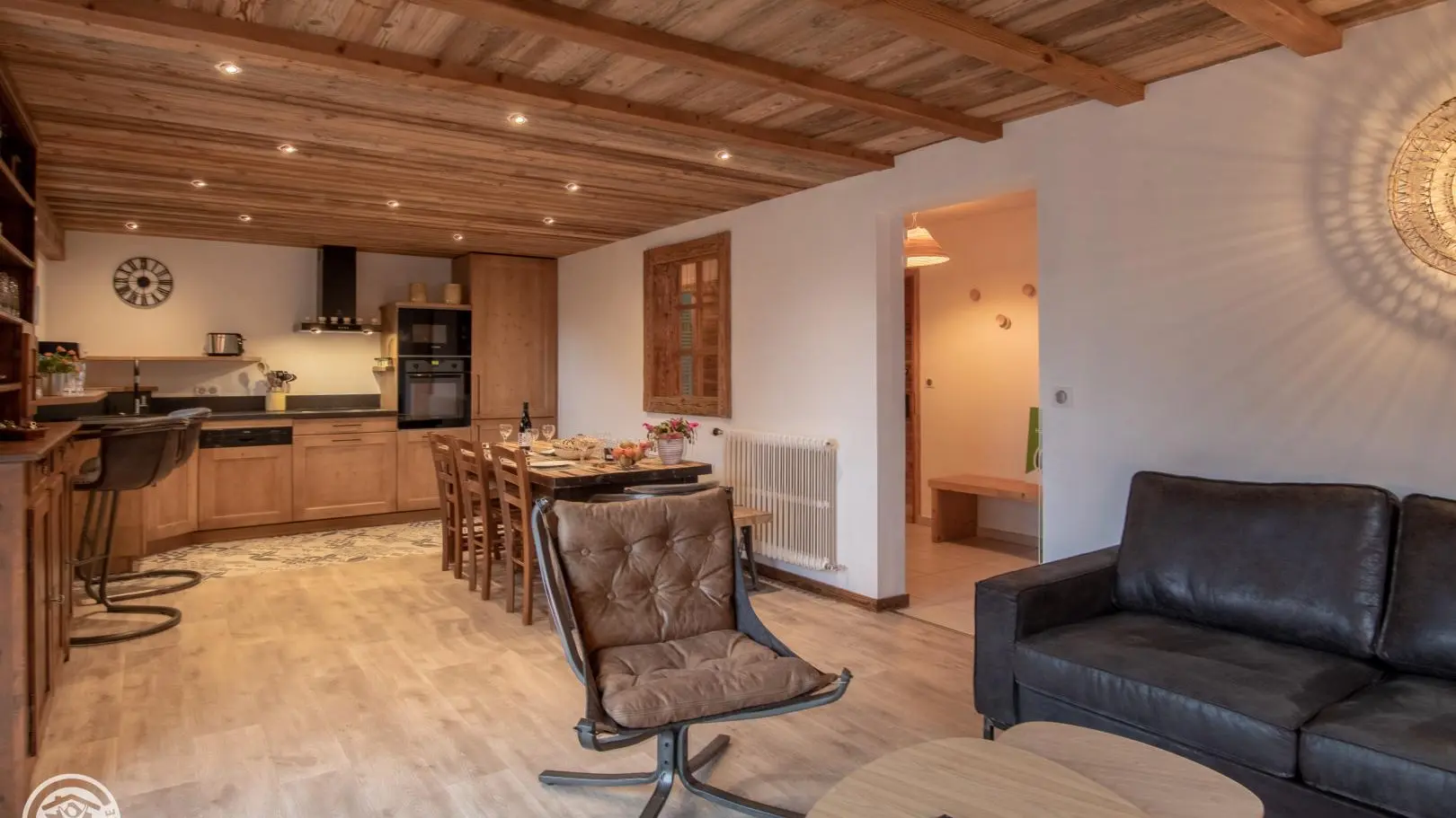 House with 3 gîtes and a rental. 83 m2 gîte on the 1st floor: living room with kitchen area, dining area and lounge area, bedroom 1 (1 double bed), bedroom 2 (1 double bed), bedroom 3 (2 single beds), bathroom, Independent WC. Shared clothes dryer, central heating, balcony, common area. Possibility to rent sheets. Ski resort: Le Grand-Bornand 0.5 km, cross-country skiing 0.2 km. Free ski bus.