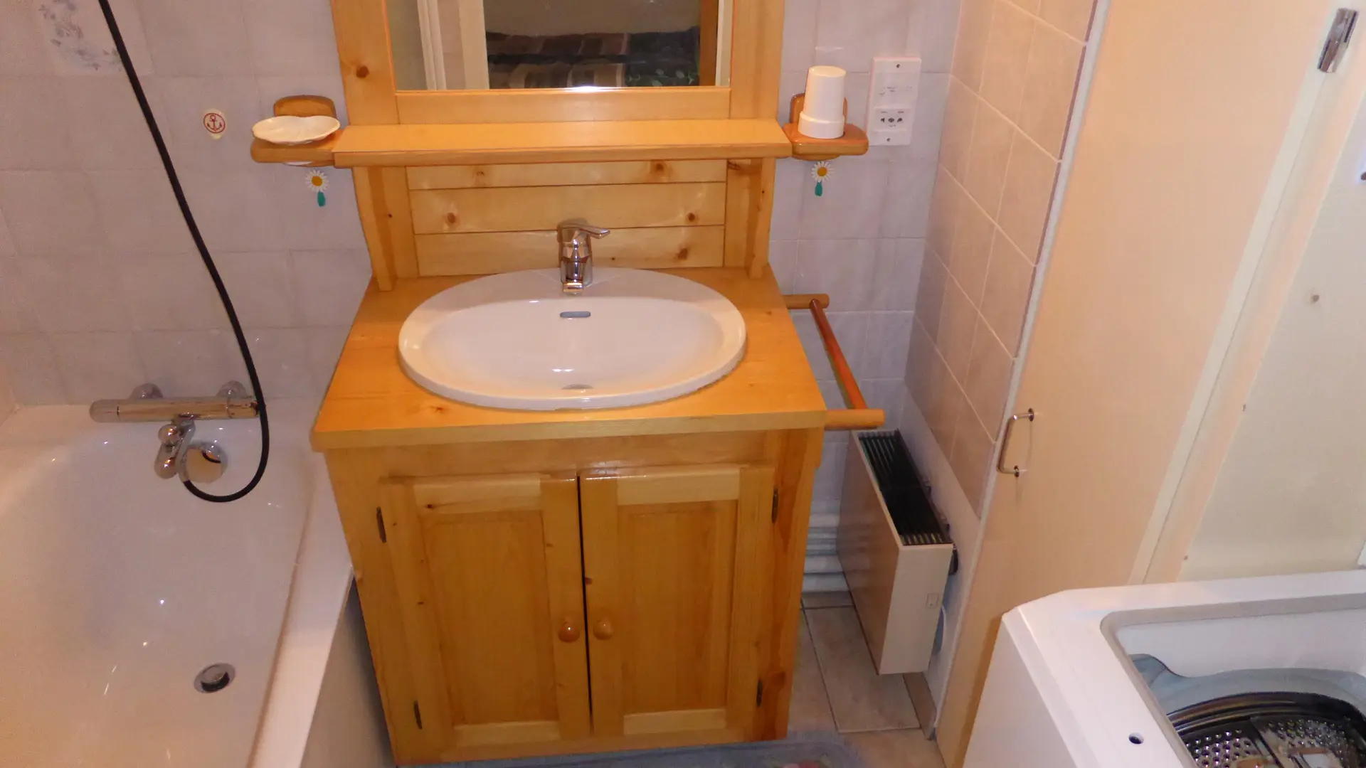 Bathroom with bathtub, washbasin, washing machine, hair dryer