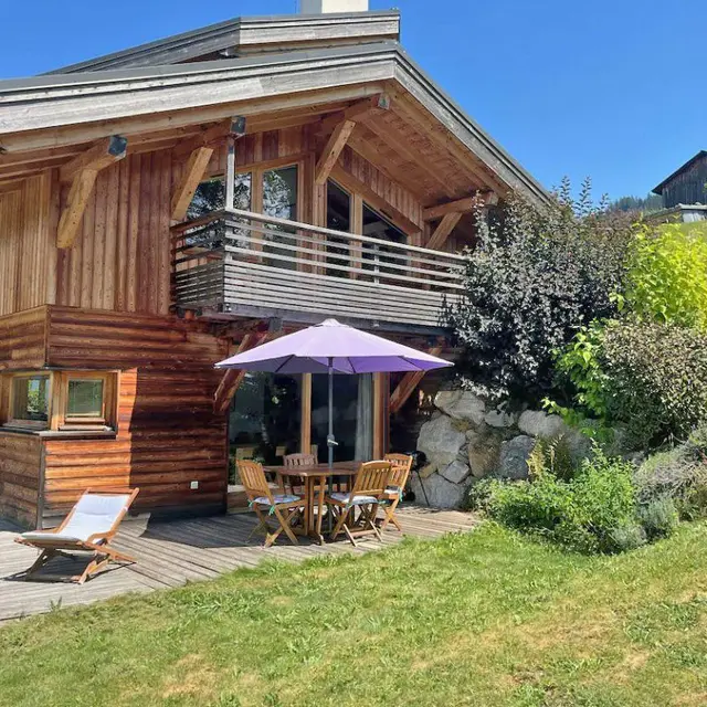 Balcony on the 1st, South terrace on the ground floor with garden furniture, parasol, deckchairs and barbecue. Land around the chalet.