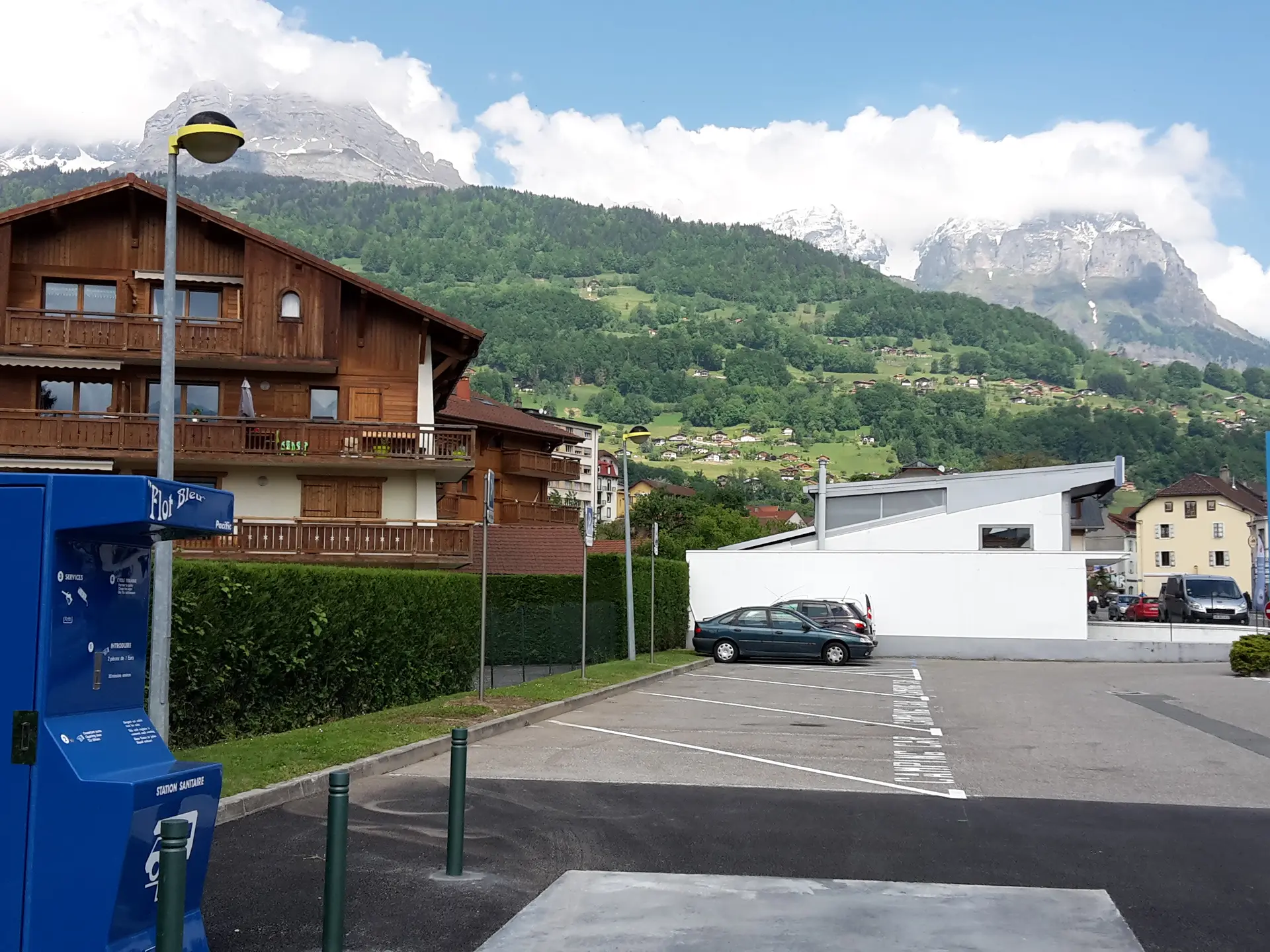 Motorhome service area on the edge of town towards Saint-Gervais with multi-service terminal to empty waste water and top up drinking water.