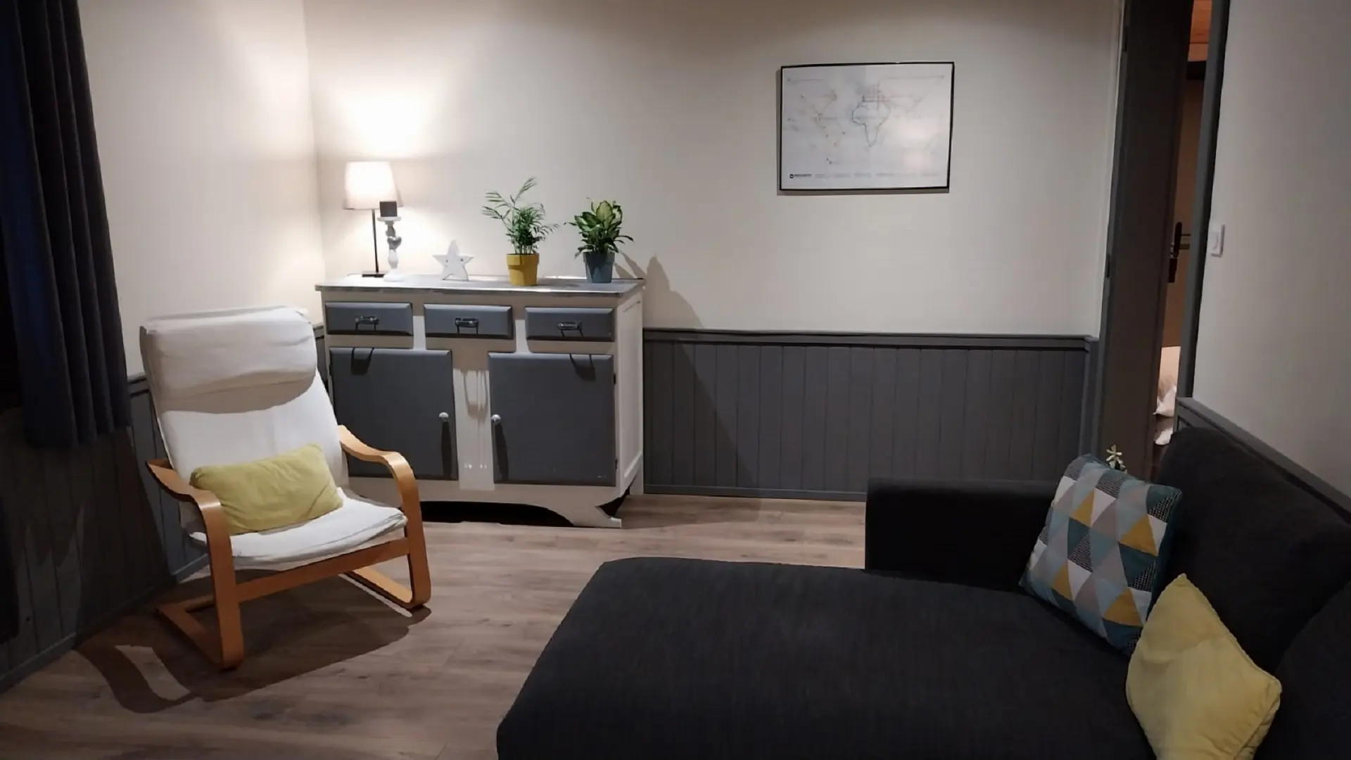 Entrance with desk, bedroom with 1 double bed and 1 single bed, living room with sofa bed and adjoining terrace, kitchen, bathroom and separate toilet.