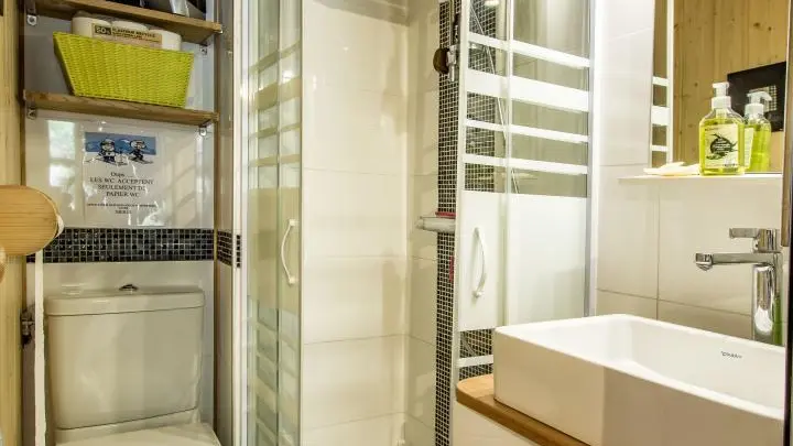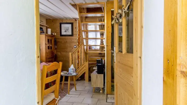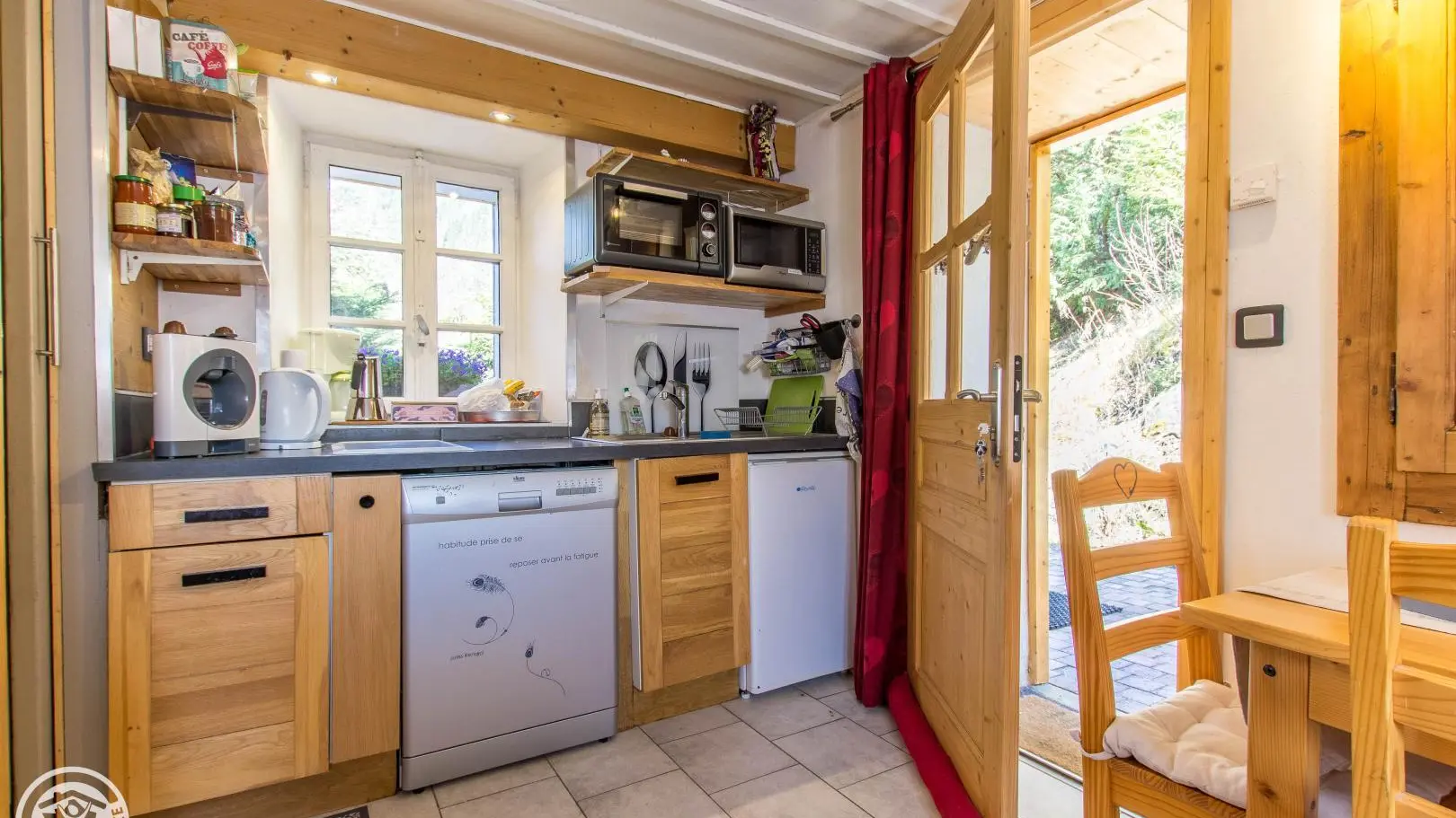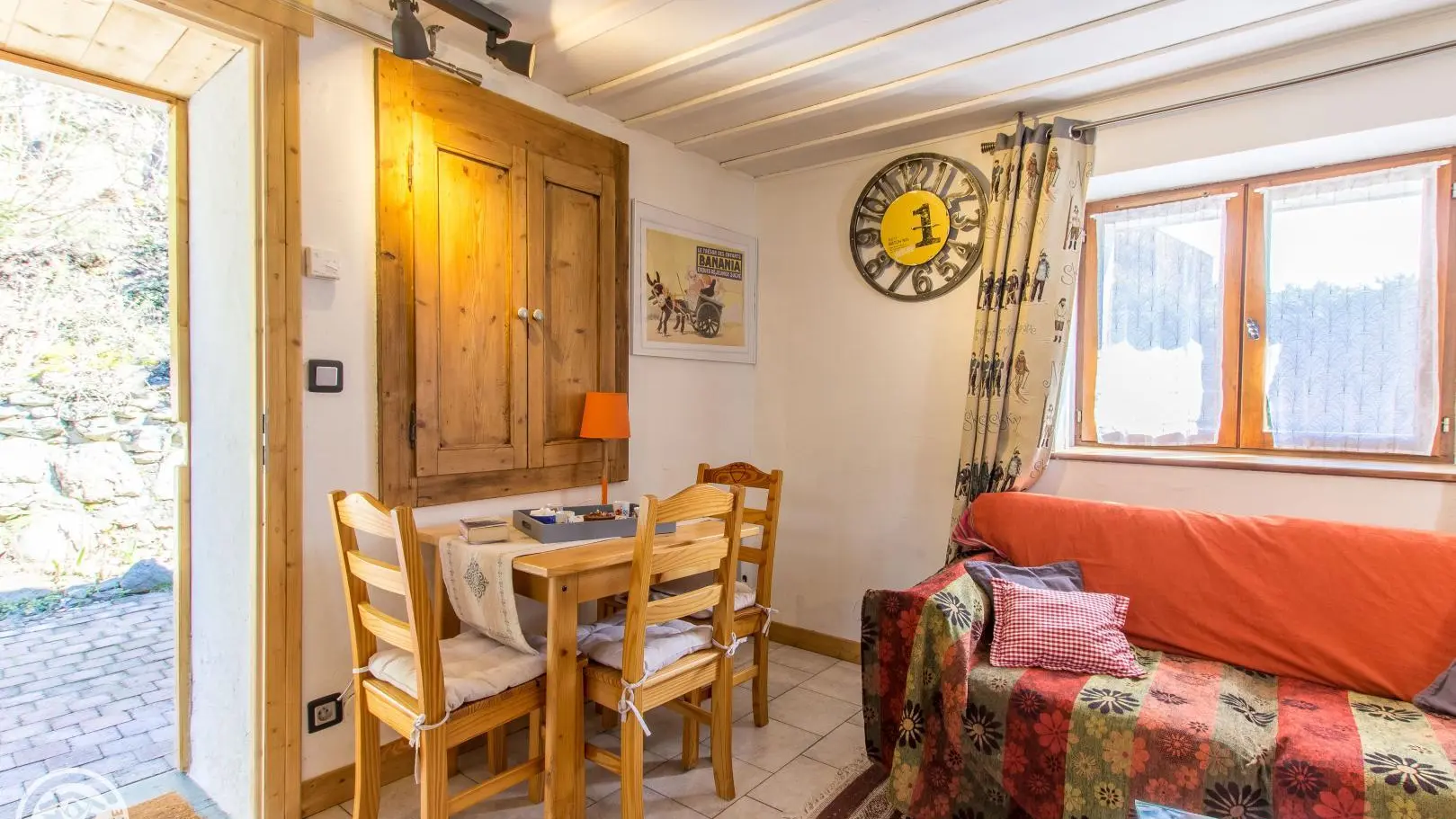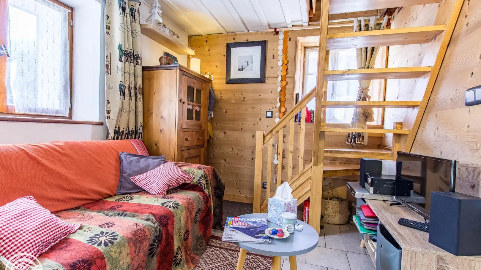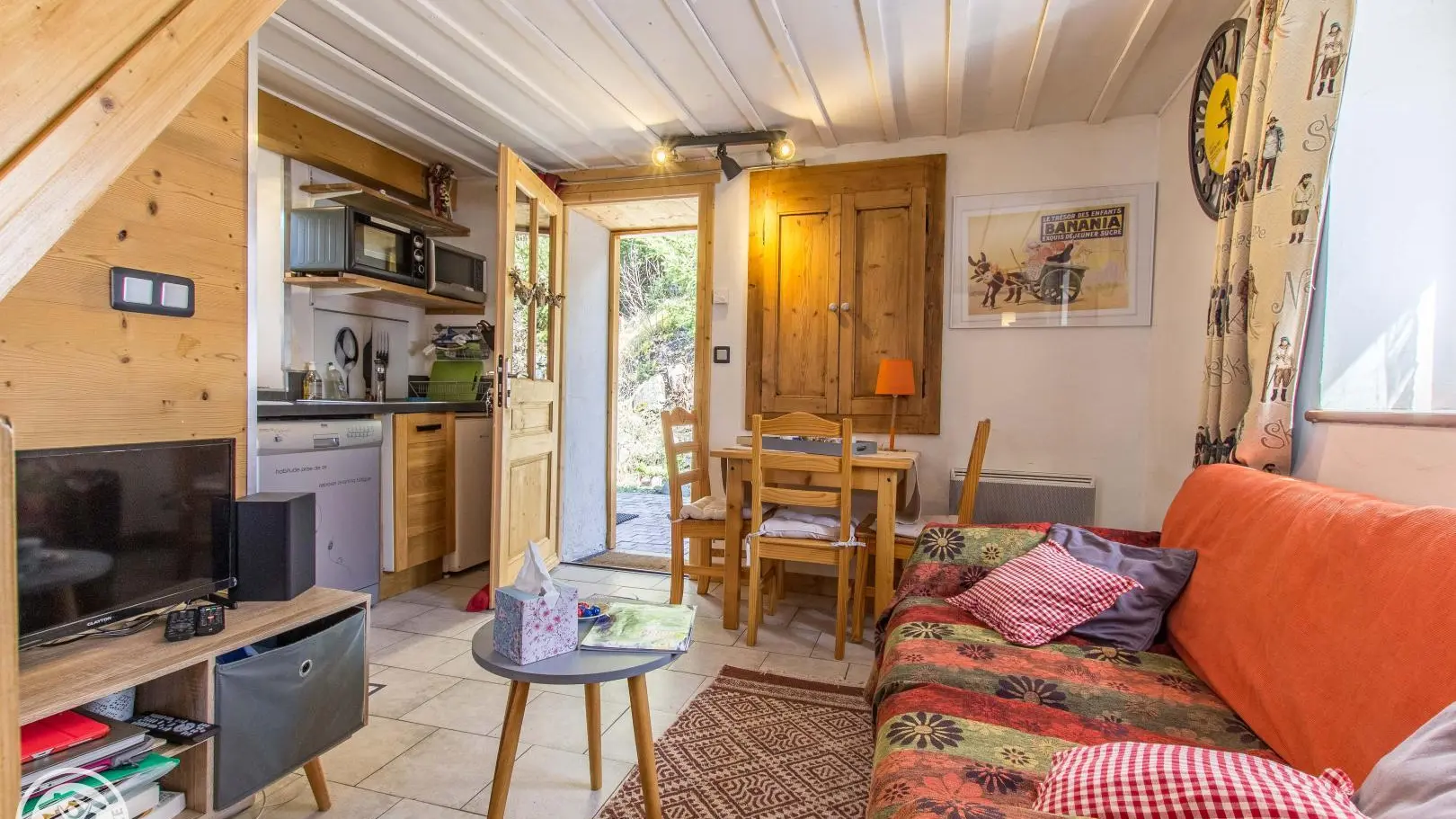Al piano terra dello chalet: angolo cottura aperto sul soggiorno (zona pranzo, divano, TV collegata), bagno (doccia, WC).