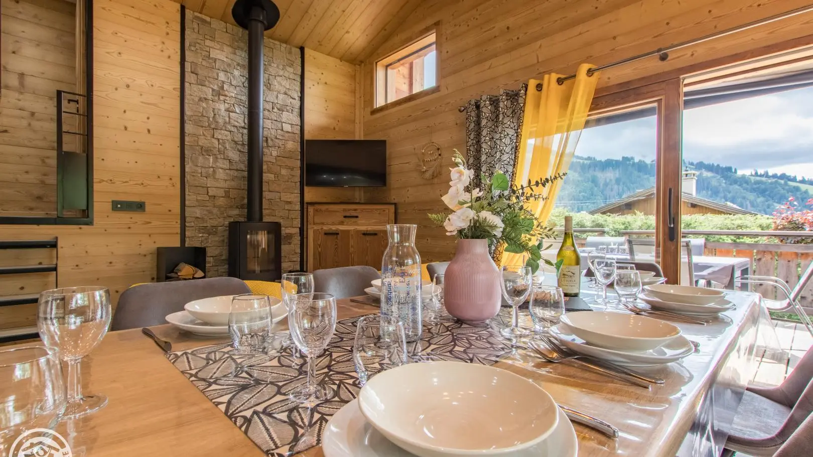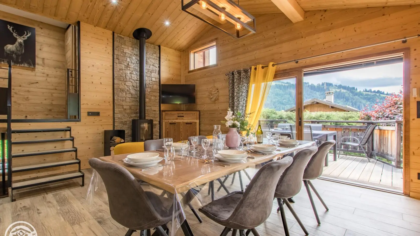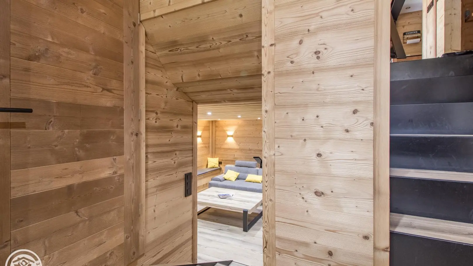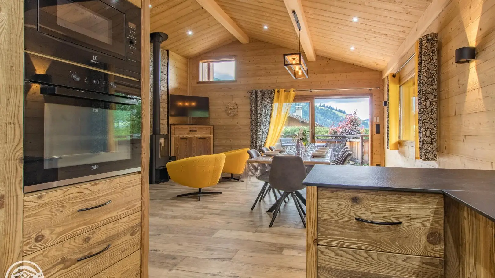 Chalet indipendente di 105 mq (+ 9 mq sottotetto) disposto su metà livelli, in una zona tranquilla sulle alture di La Clusaz. Atmosfera molto bella che mescola legno e moderno. Piano terra: ingresso, cucina attrezzata aperta sulla sala da pranzo (tavolo da pranzo, stufa a legna, 2 poltrone, televisore collegato), accesso alla bella terrazza-balcone. 1 WC separato con lavabo.