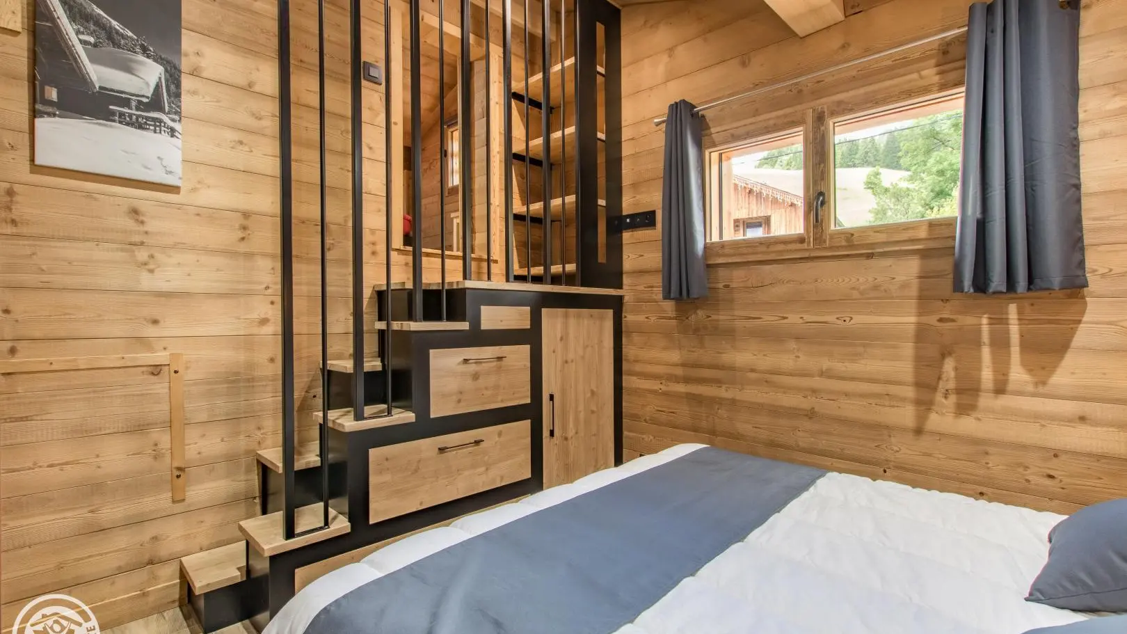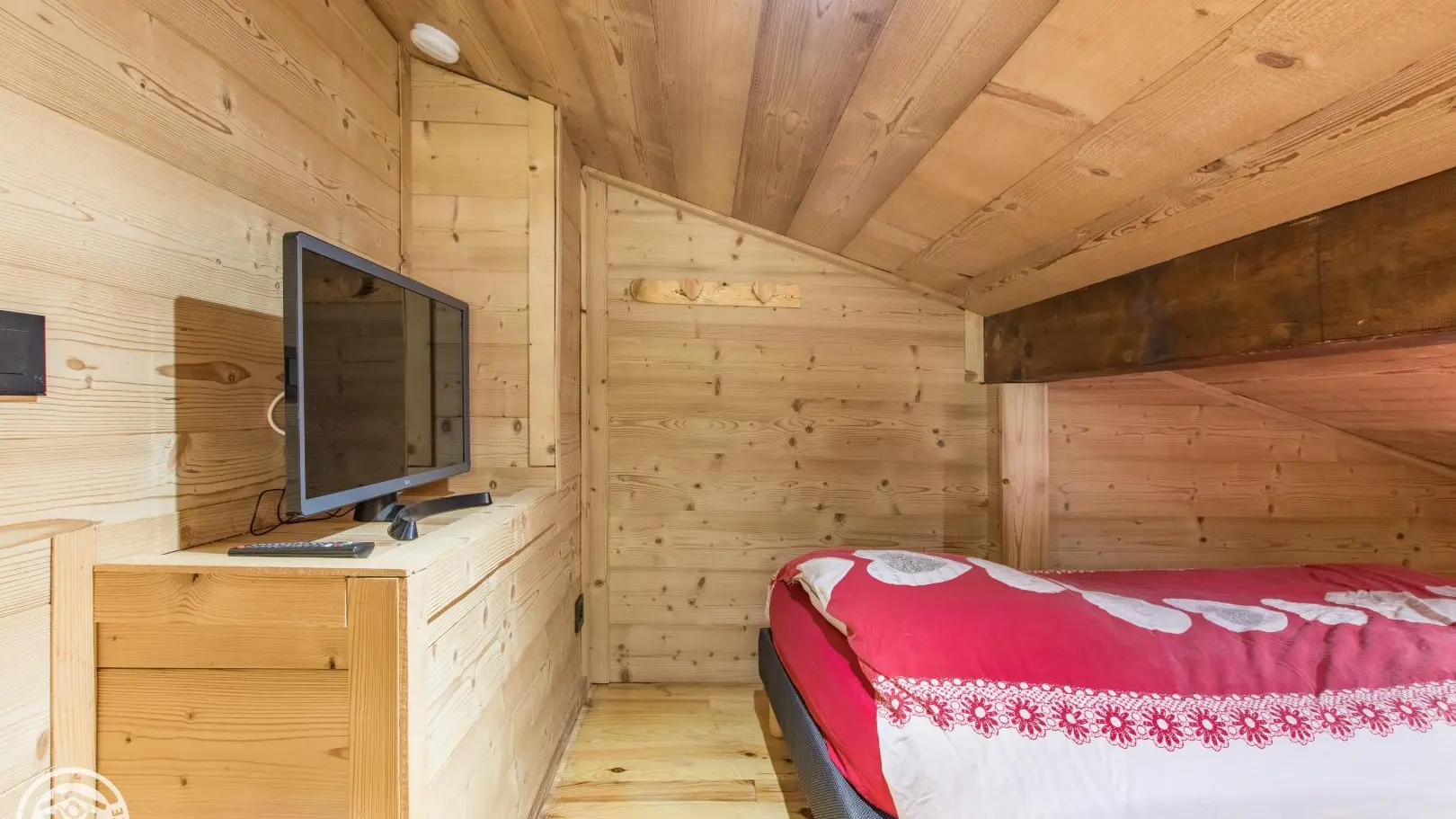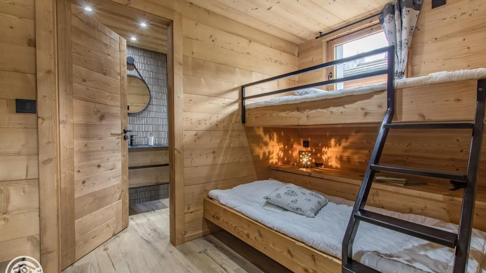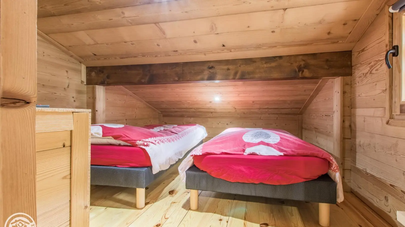 1/2 livello superiore con 2 camere da letto: camera 1 (1 letto matrimoniale 160x200 cm, bagno), camera 2 (1 letto 160x200 cm, bagno, zona notte mansardata con 2 letti gemelli 80x190 cm - altezza max 1,65 cm e accesso tramite scala a gradini sfalsati) . 1/2 livello inferiore: angolo montagna con 2 letti a castello 80x190 cm, camera da letto 3 (1 letto 140x190 cm, accesso alla terrazza), bagno con doccia, vasca, mobile lavabo, WC.
