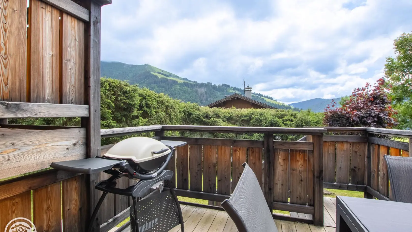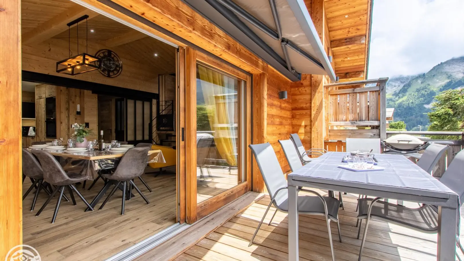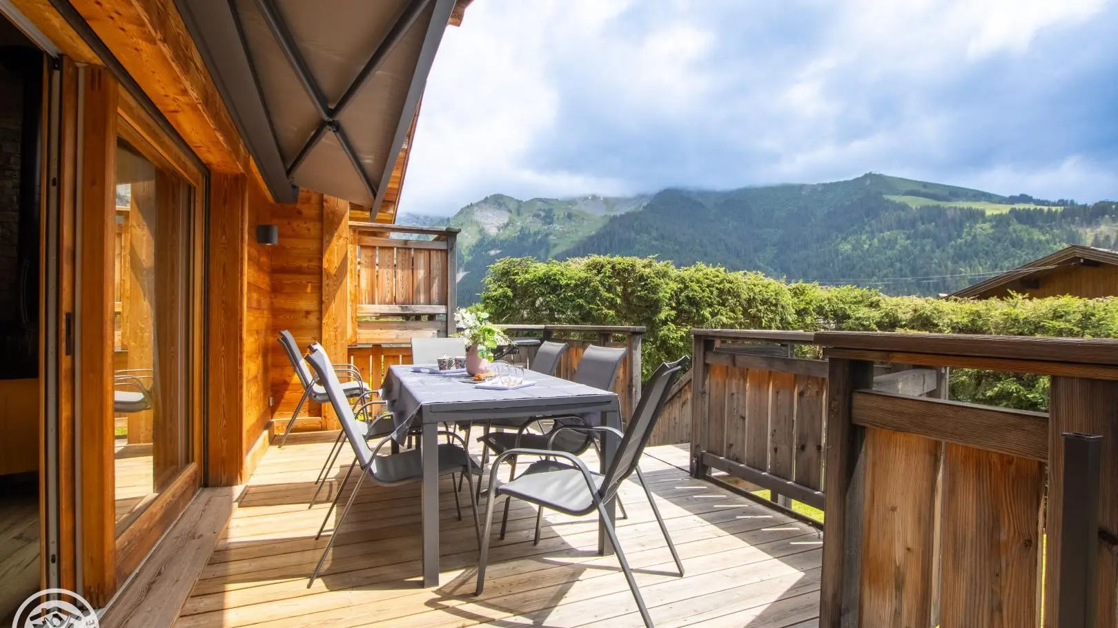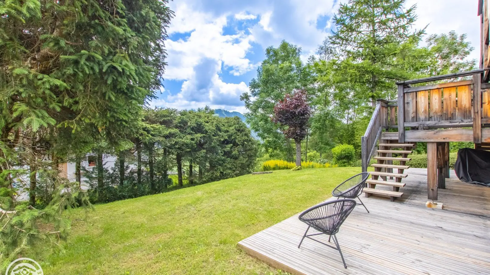 Terrazza balcone esposta a sud-ovest con mobili da giardino, barbecue a gas, tapparelle elettriche. Splendido panorama sulle montagne, sul paese e sulle piste da sci in inverno. Terrazza in legno e giardino davanti allo chalet.