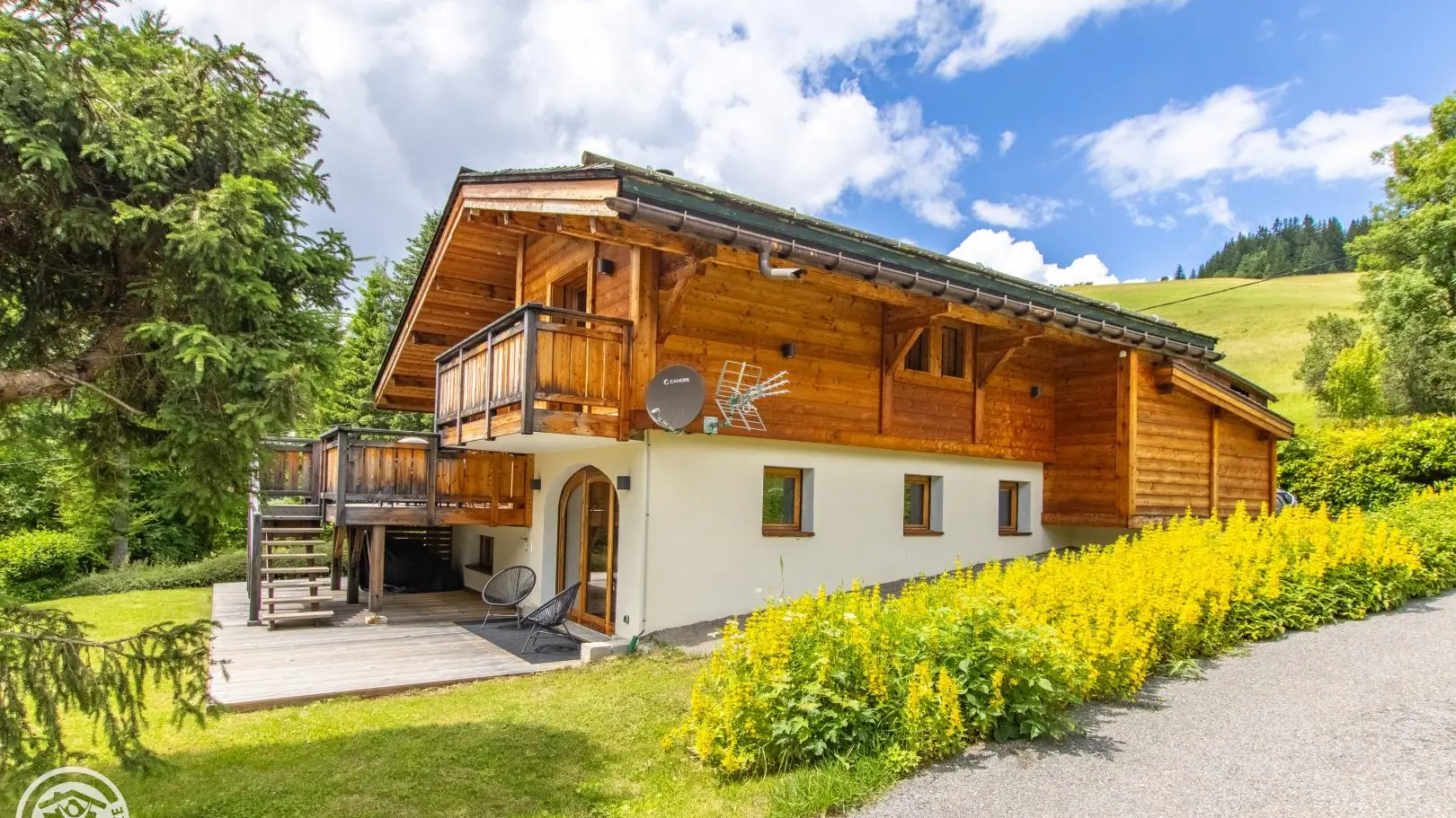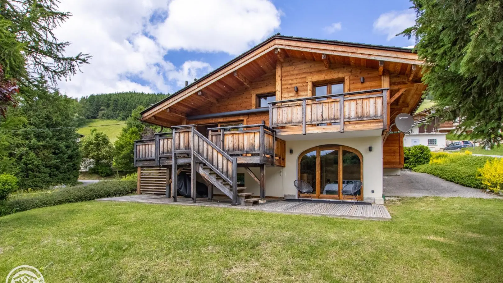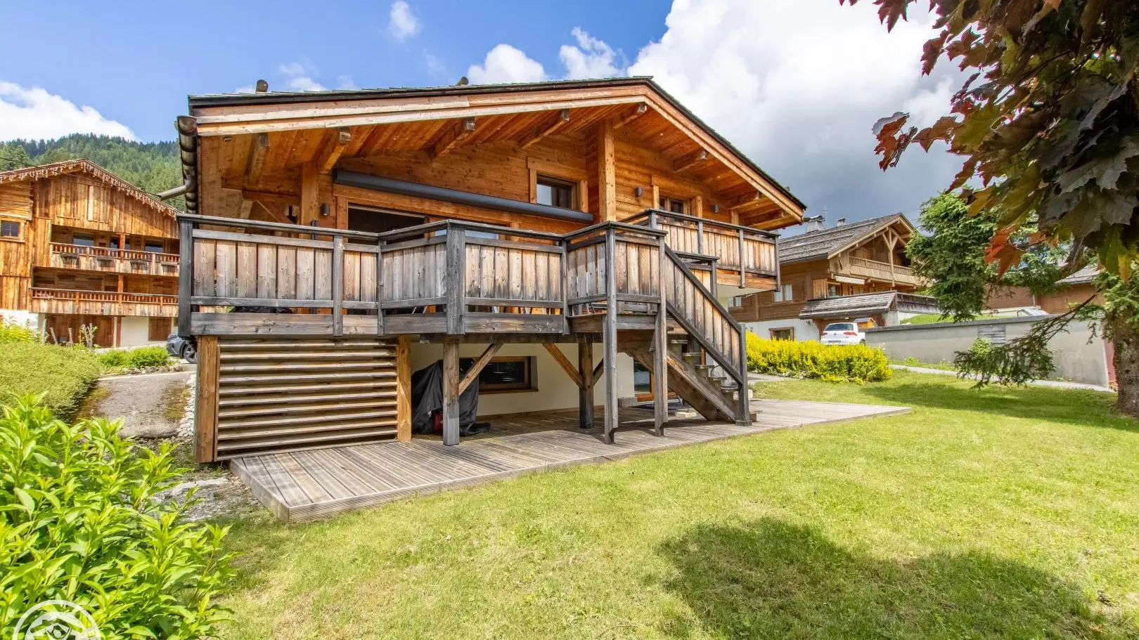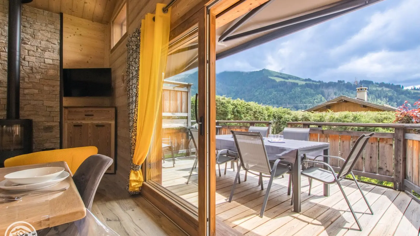 Terrazza balcone esposta a sud-ovest con mobili da giardino, barbecue a gas, tapparelle elettriche. Splendido panorama sulle montagne, sul paese e sulle piste da sci in inverno. Terrazza in legno e giardino davanti allo chalet.