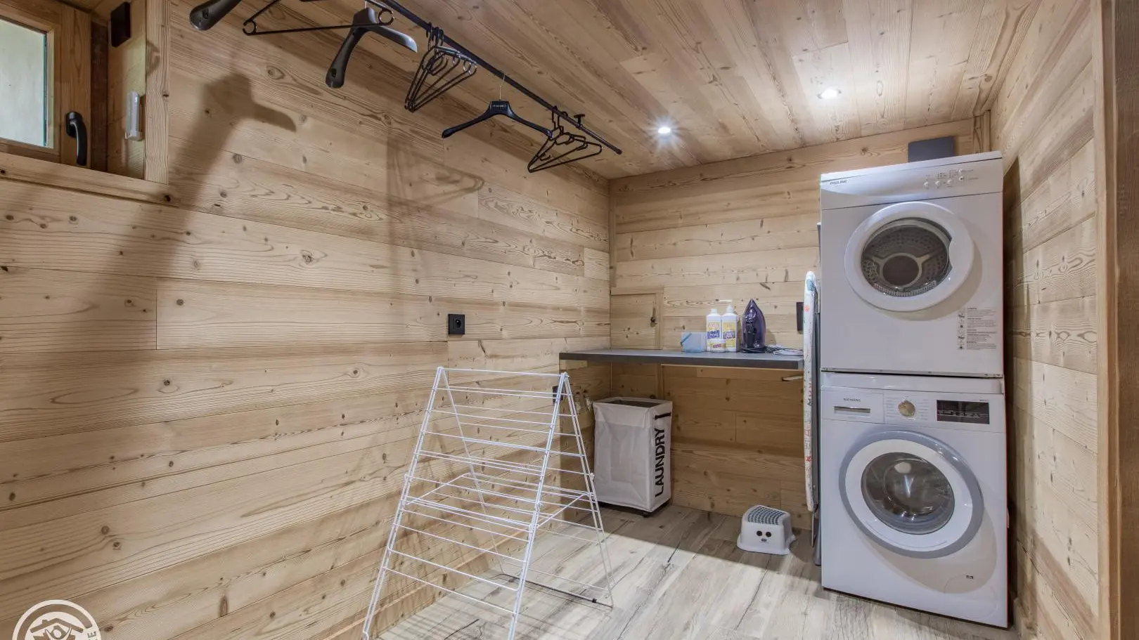 1/2 livello inferiore: bellissimo soggiorno con divano, panche, grande TV collegata. Lavanderia con lavatrice e asciugatrice.
